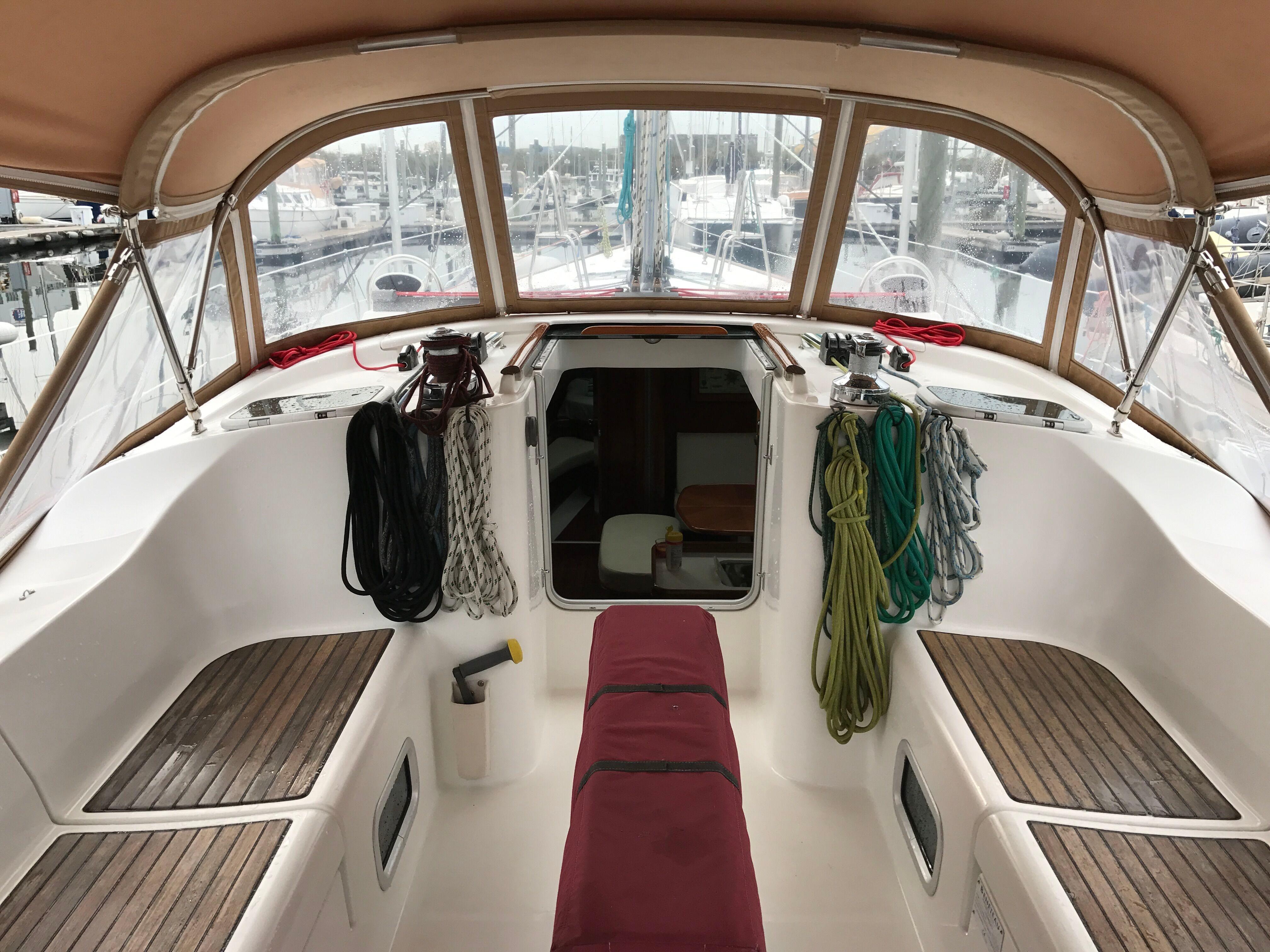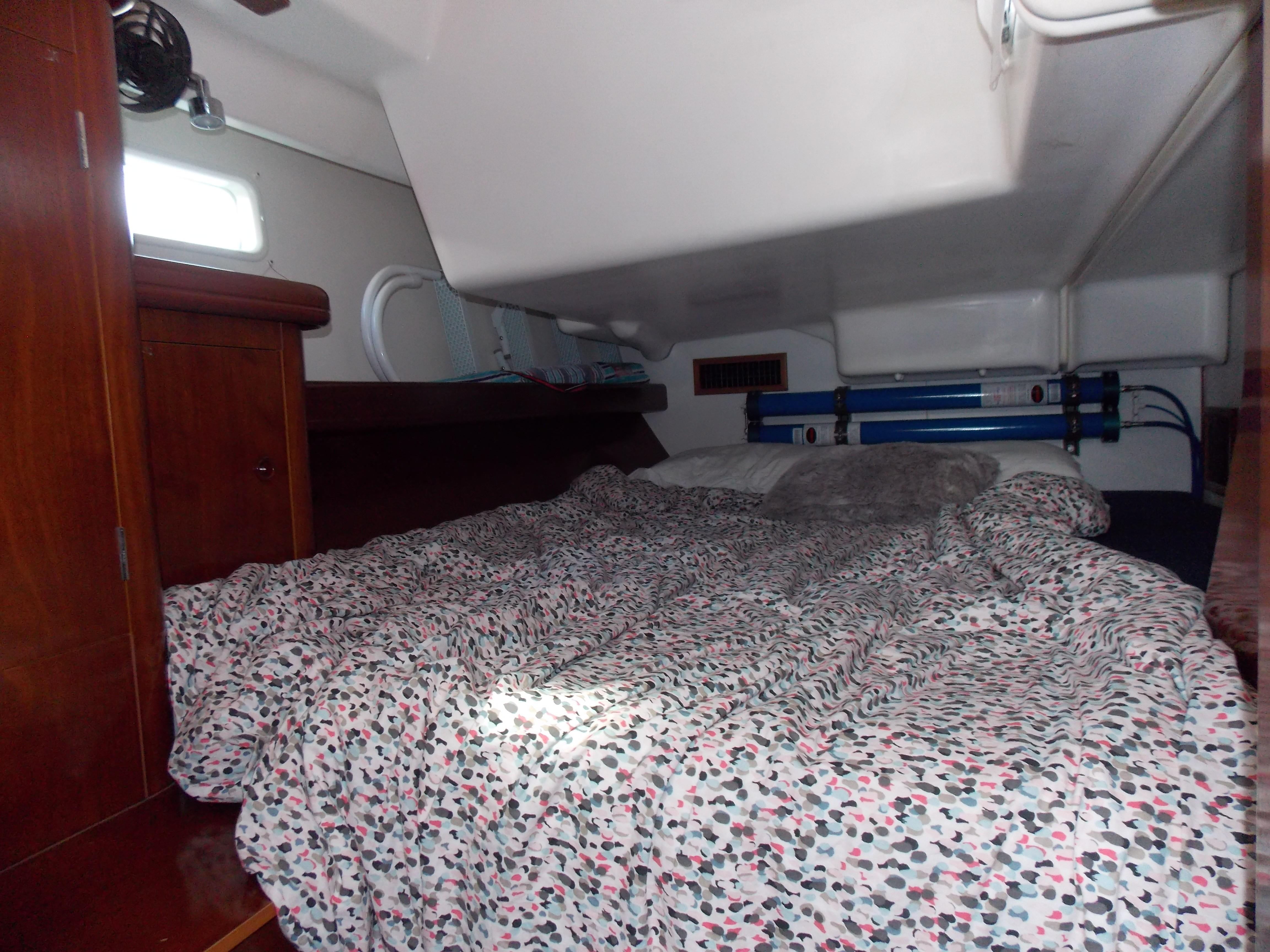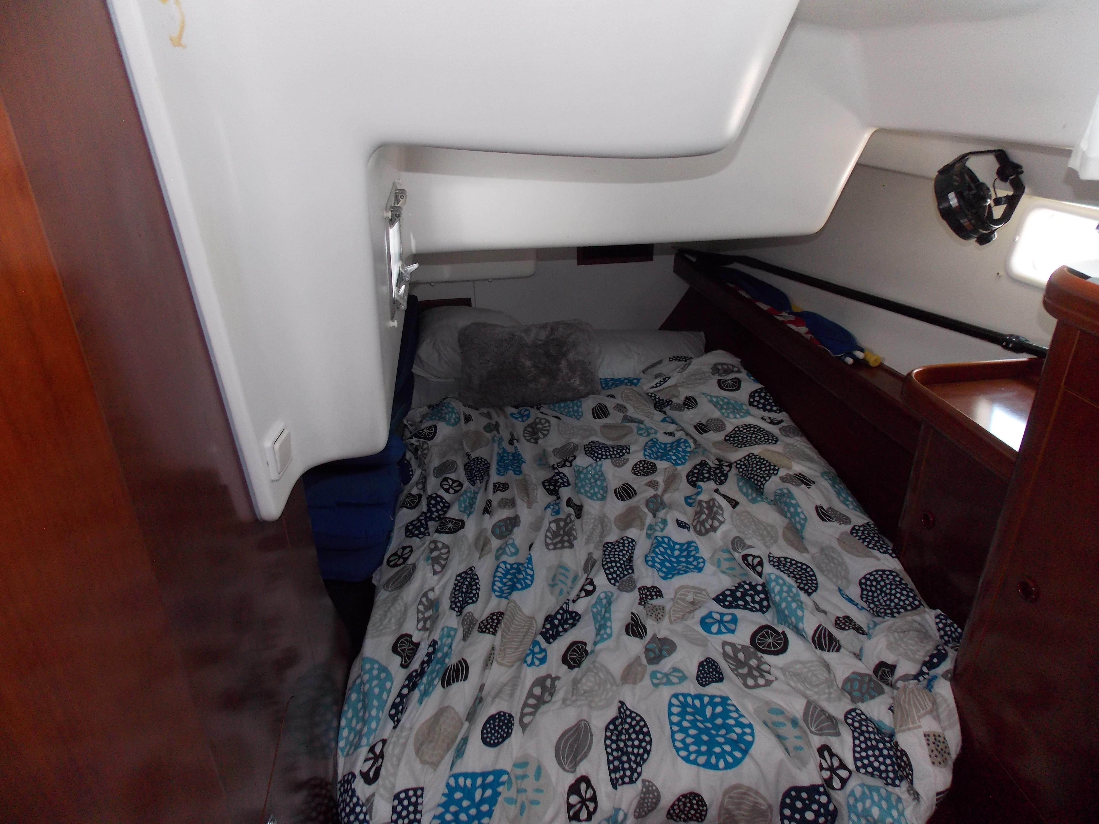 The boat has 3 cabins, with a full stateroom forward, twin bunk rooms aft. The galley has a dual stainless steel sink, a side opening fridge, freezer and a two burner stove with convention oven. The salon is large, seating for 6-8 guests with two settees , a table and an island seat amidships. Her interior joiner work is well cared for with a bright shining finish. The large cockpit seats 4-6 with custom cushions.
