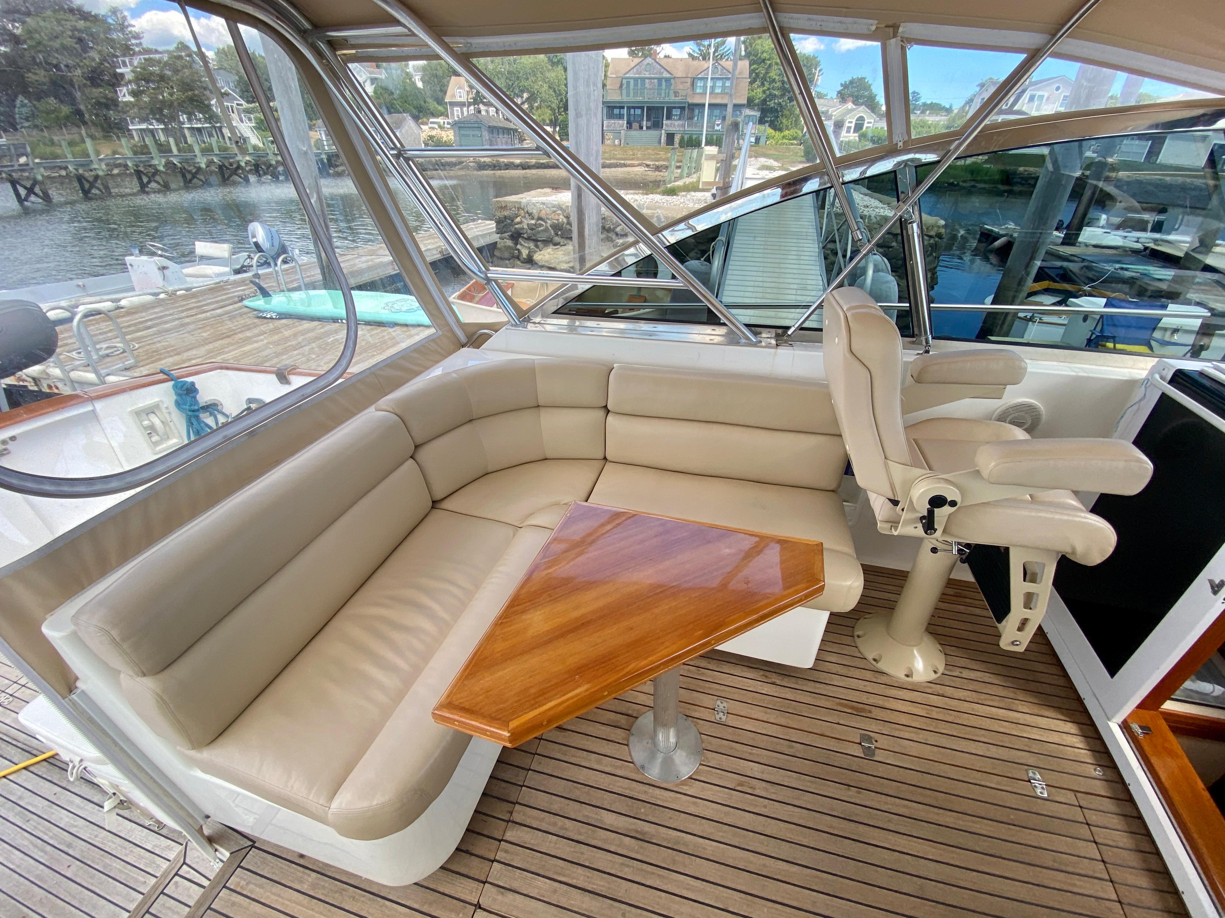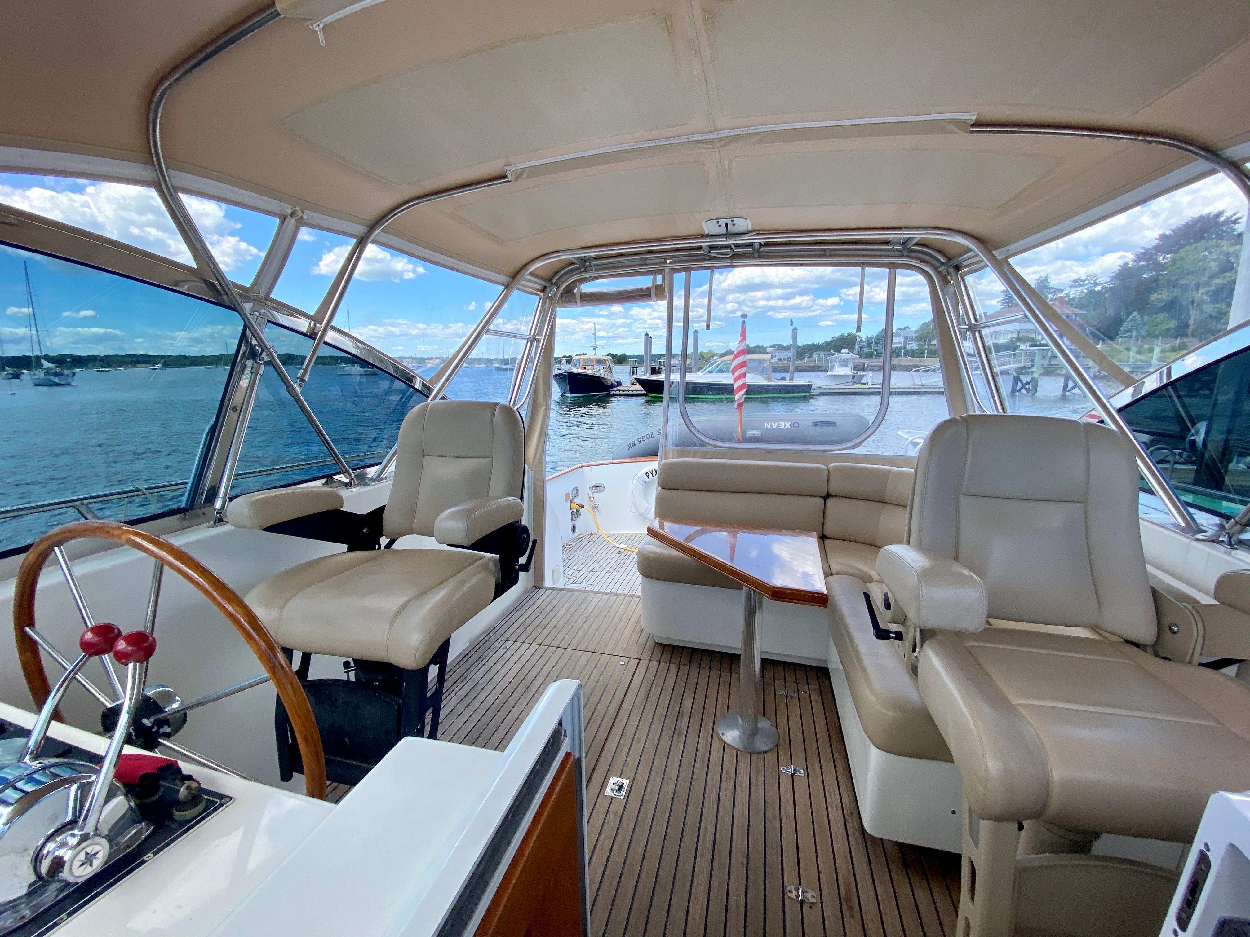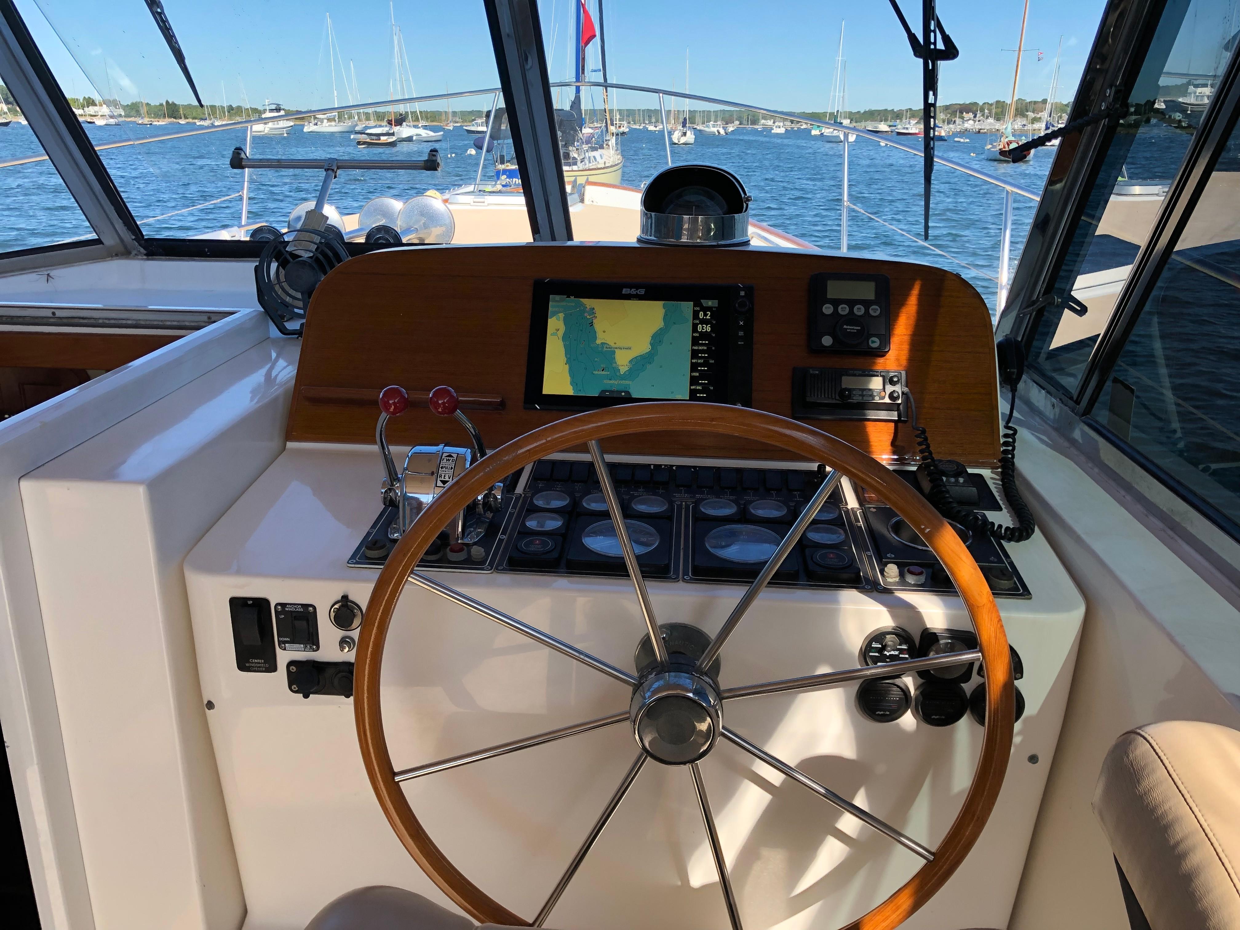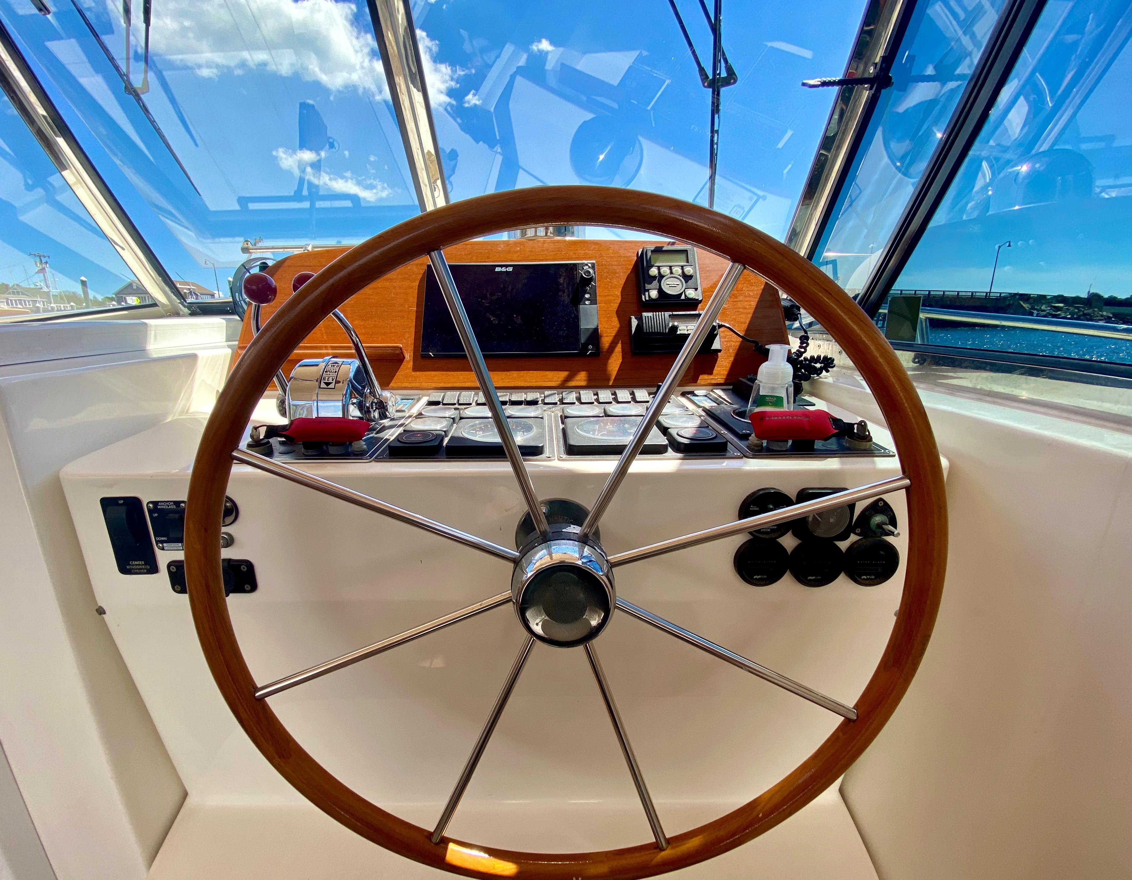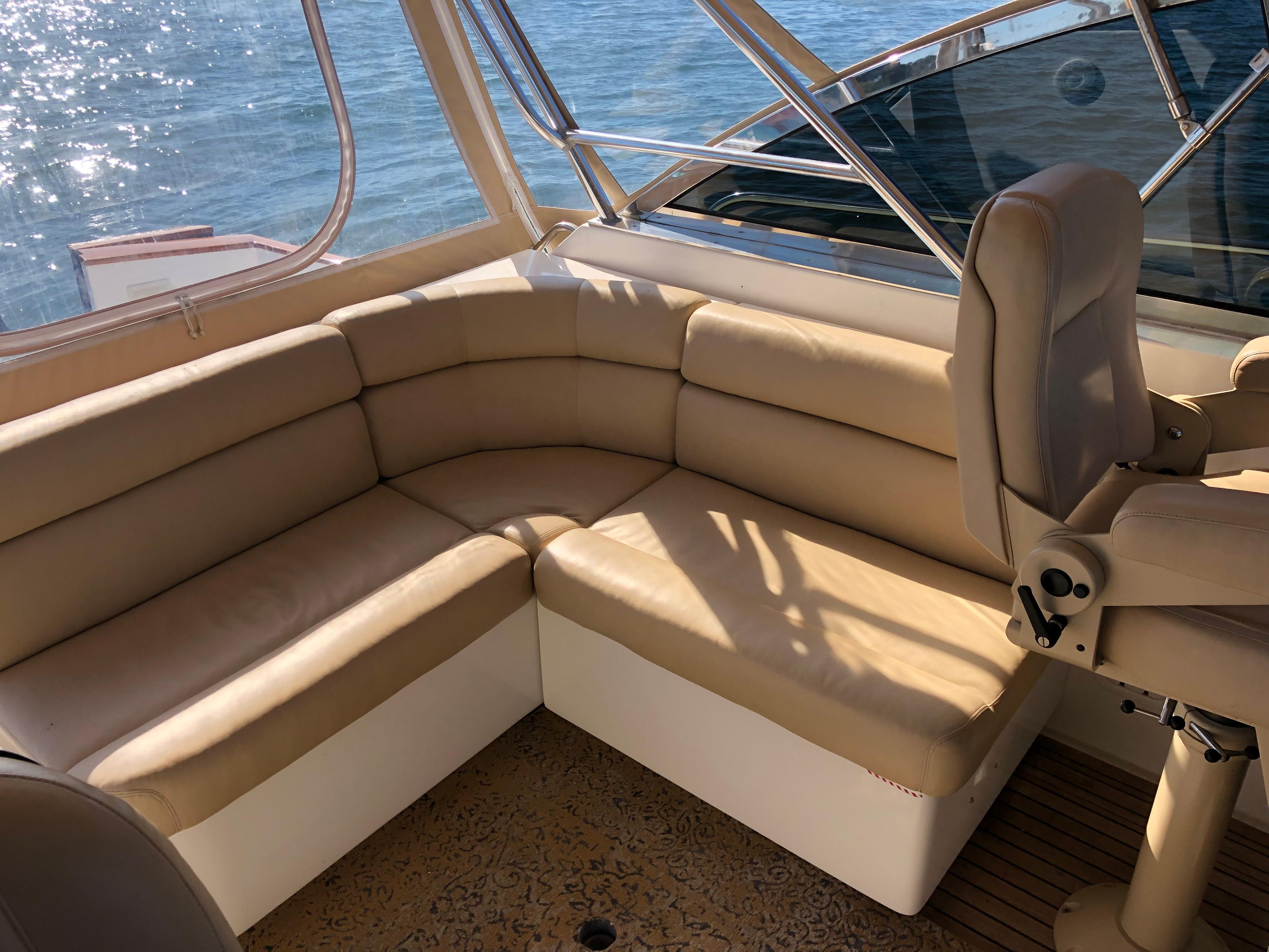 The helm station is forward to starboard with recessed electronics. The steering wheel is varnished teak. Stidd seat to port and L-shaped settee are ultra-leather (Recovered in 2013 & 2015)