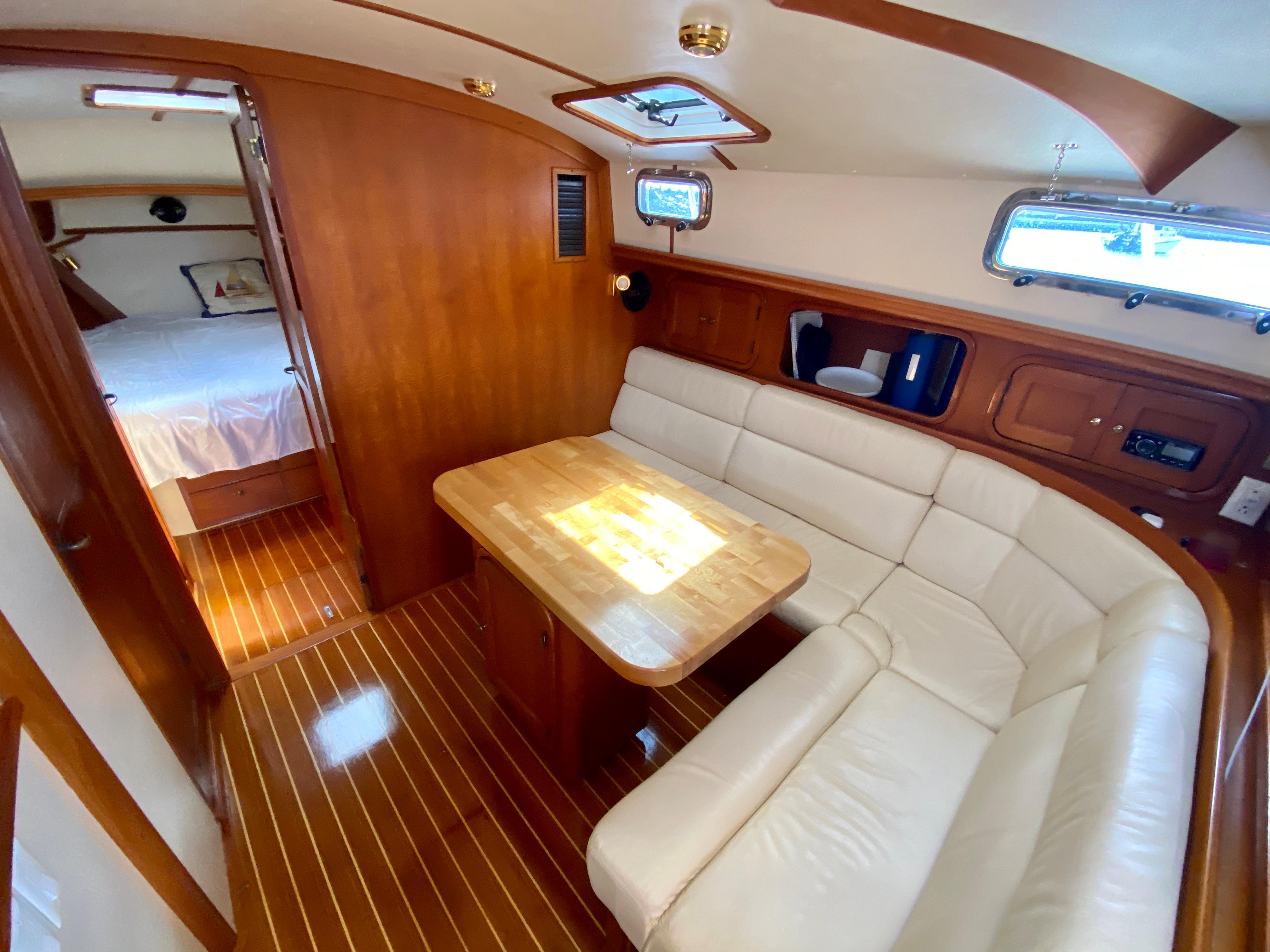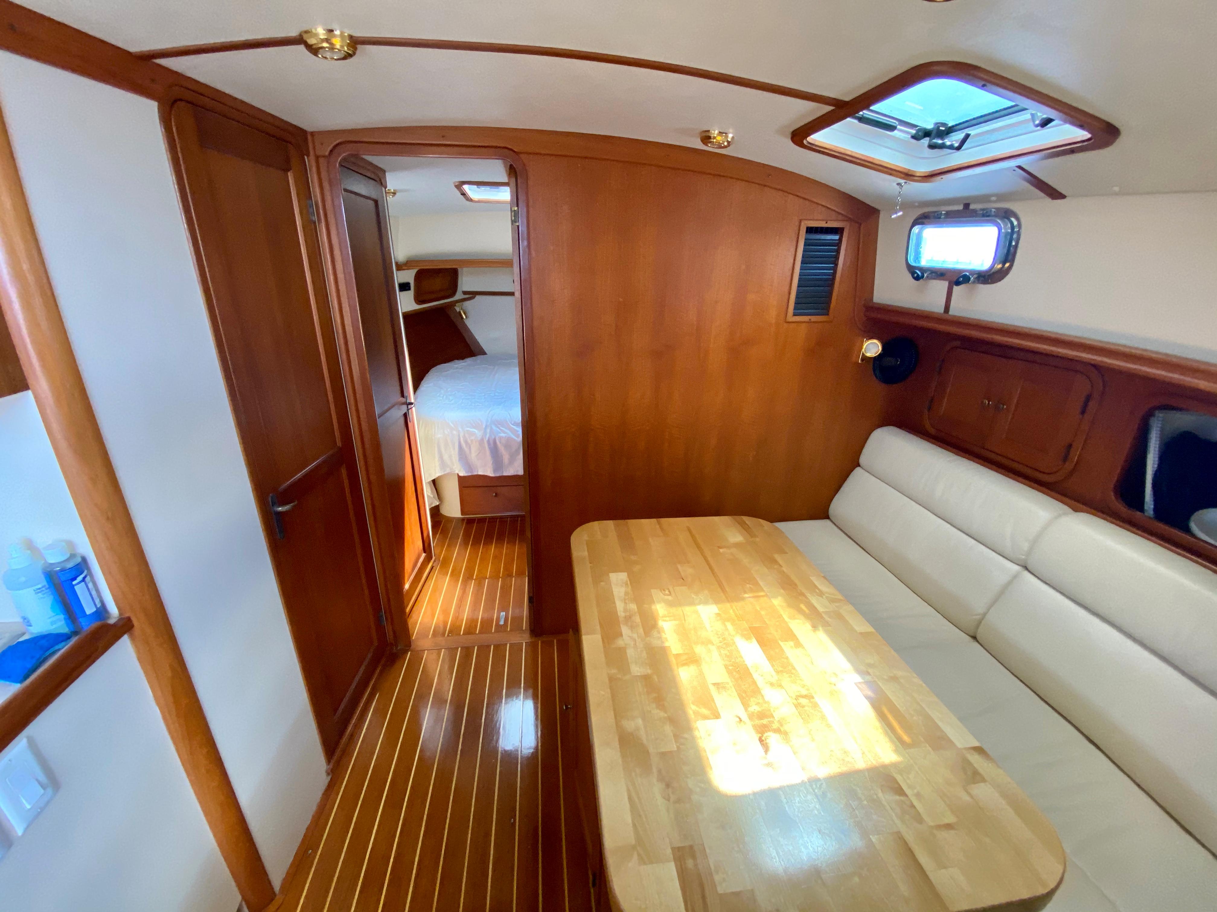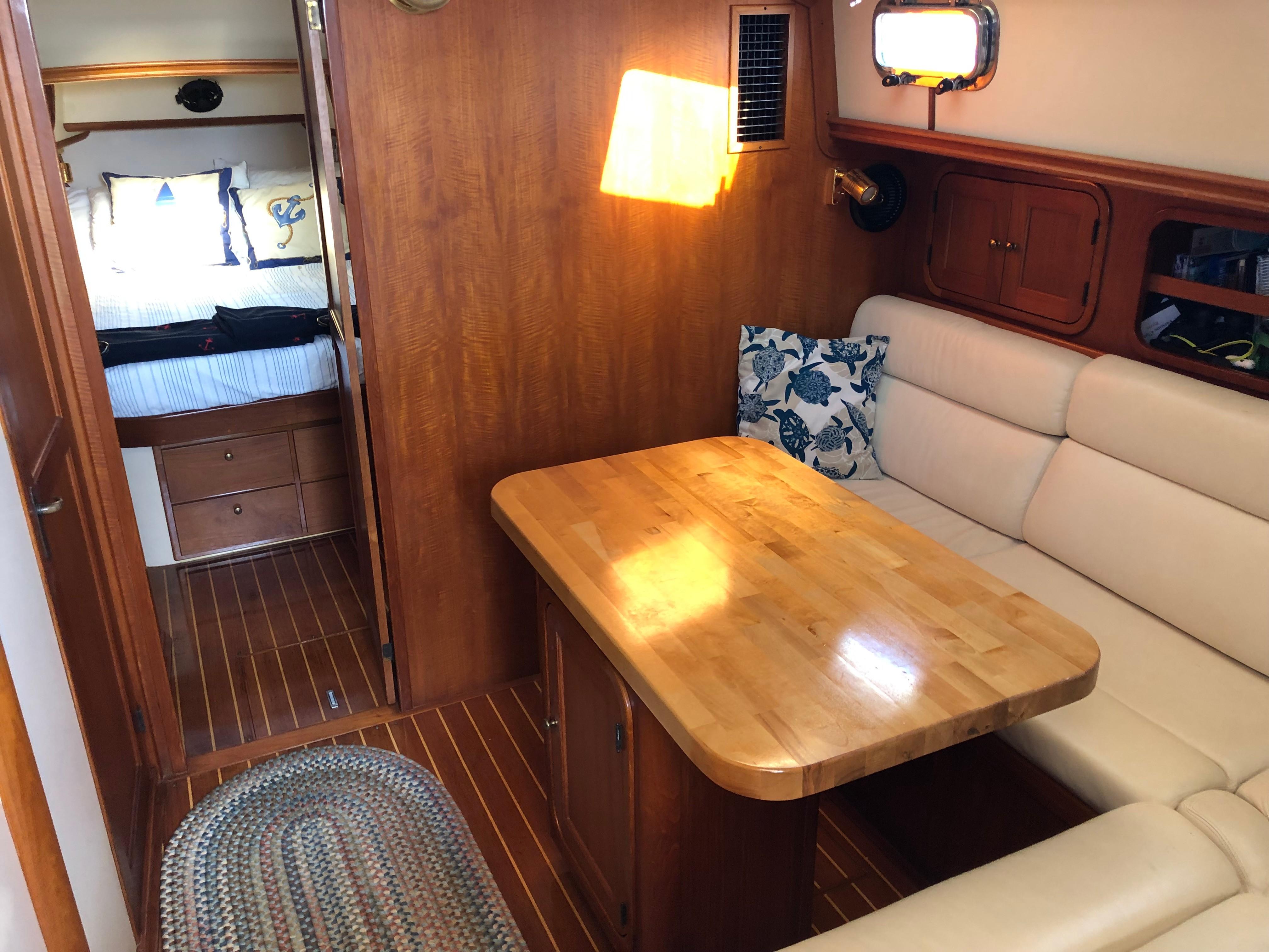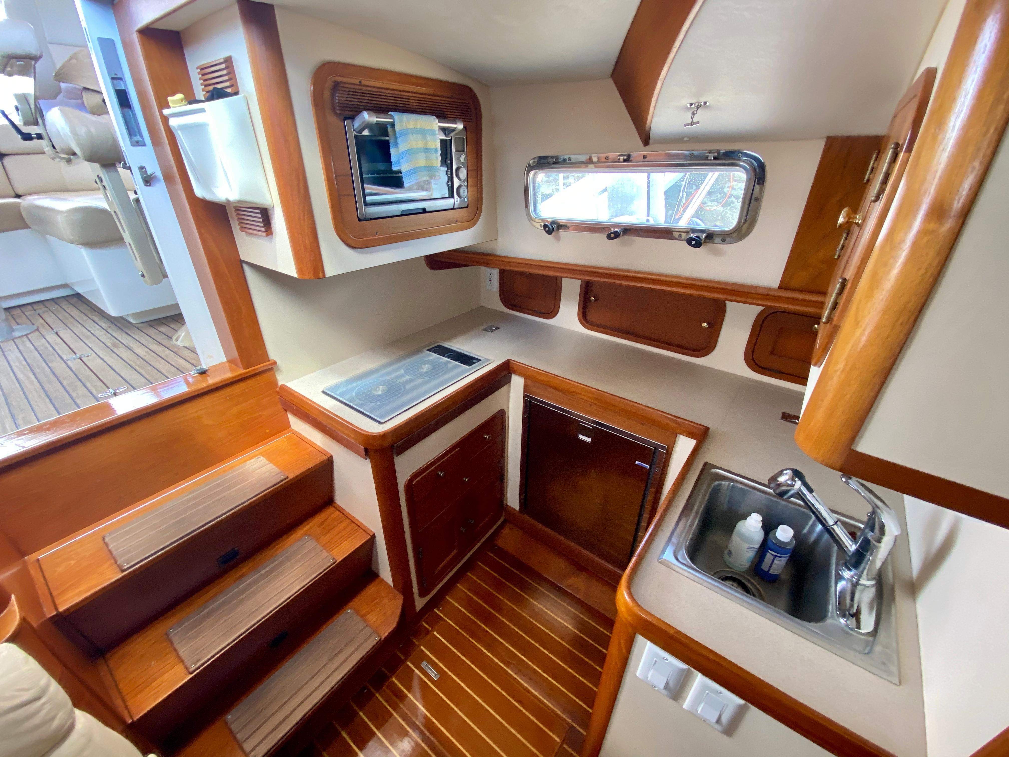 An ultra-leather L shaped settee is starboard in the cabin. The dinette comes with (2) options for tabletops, (1) original Legacy oval teak table, and (1) square top. The galley is U-shaped on the port-side