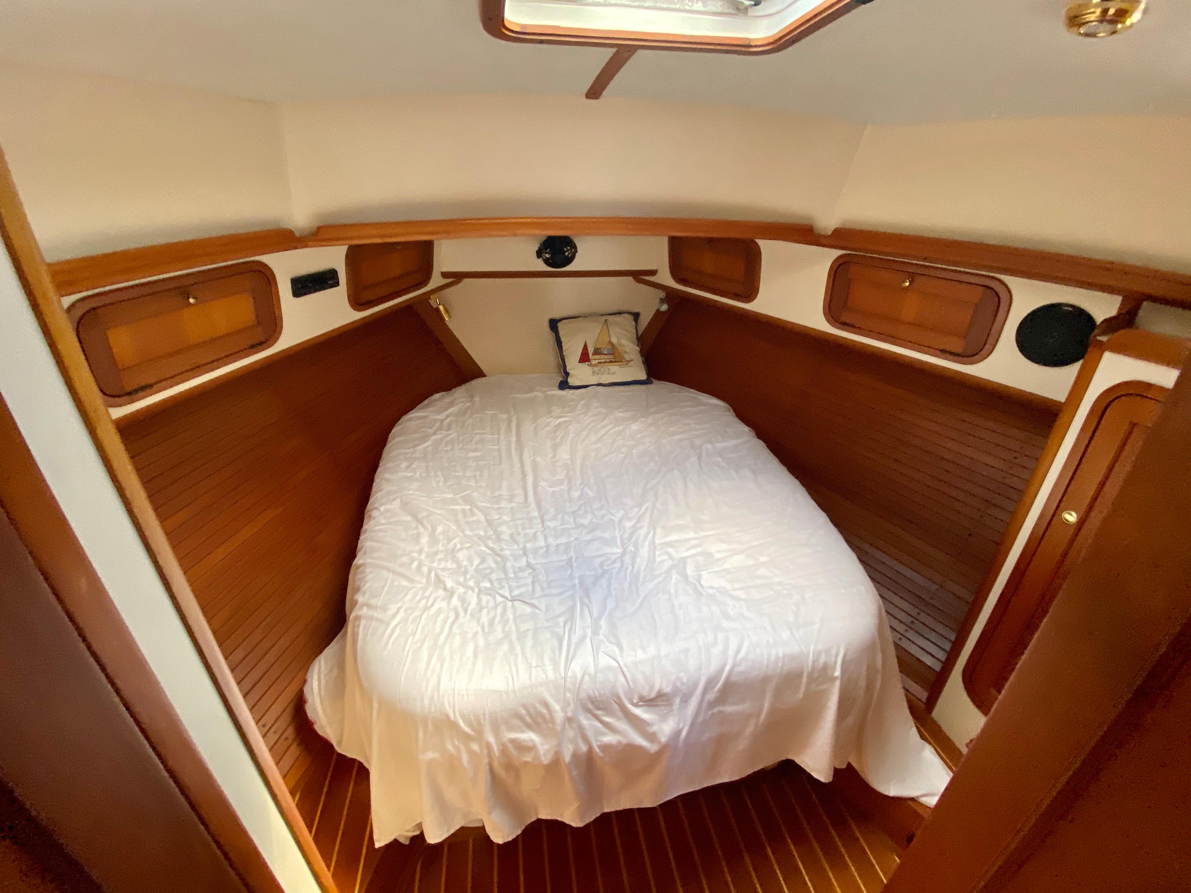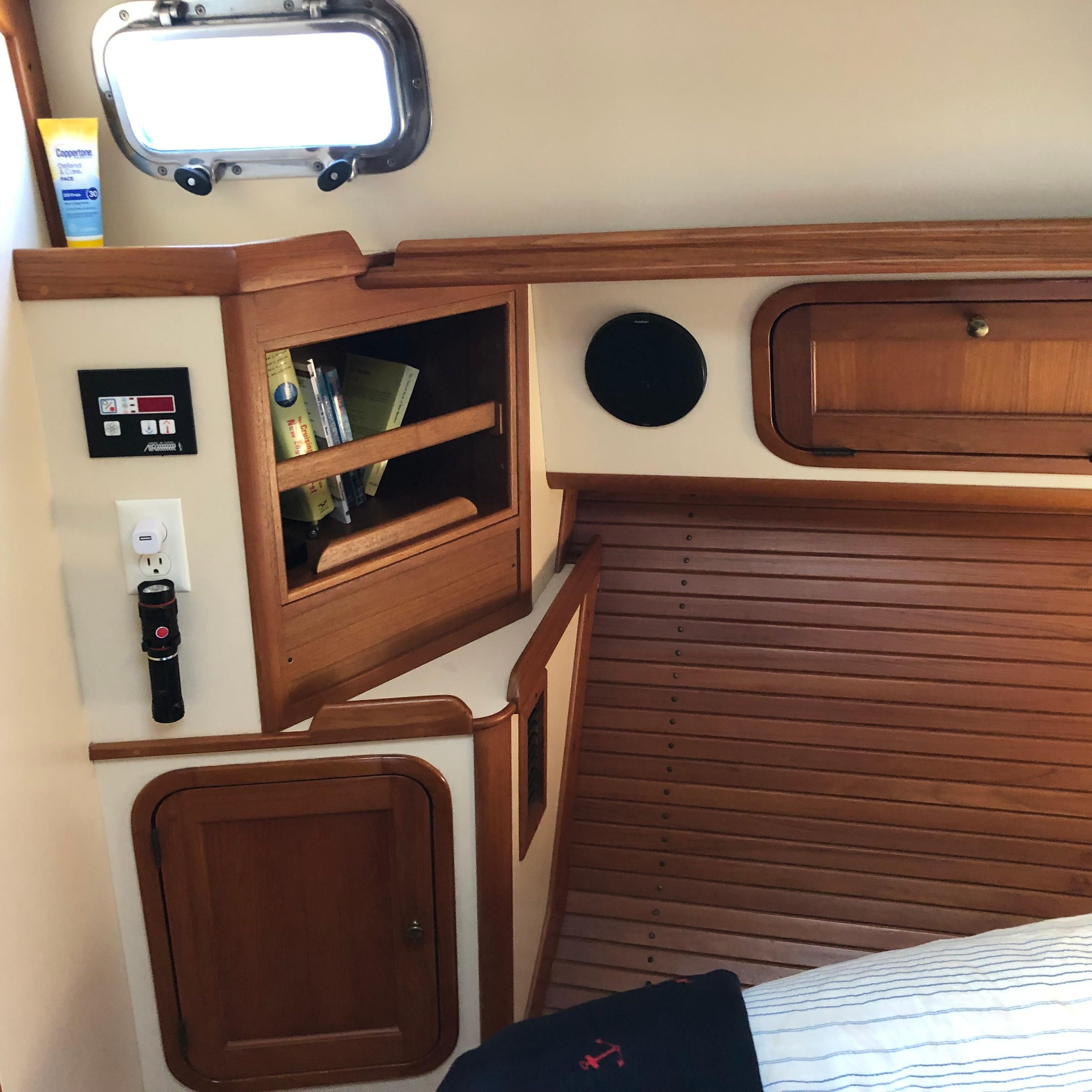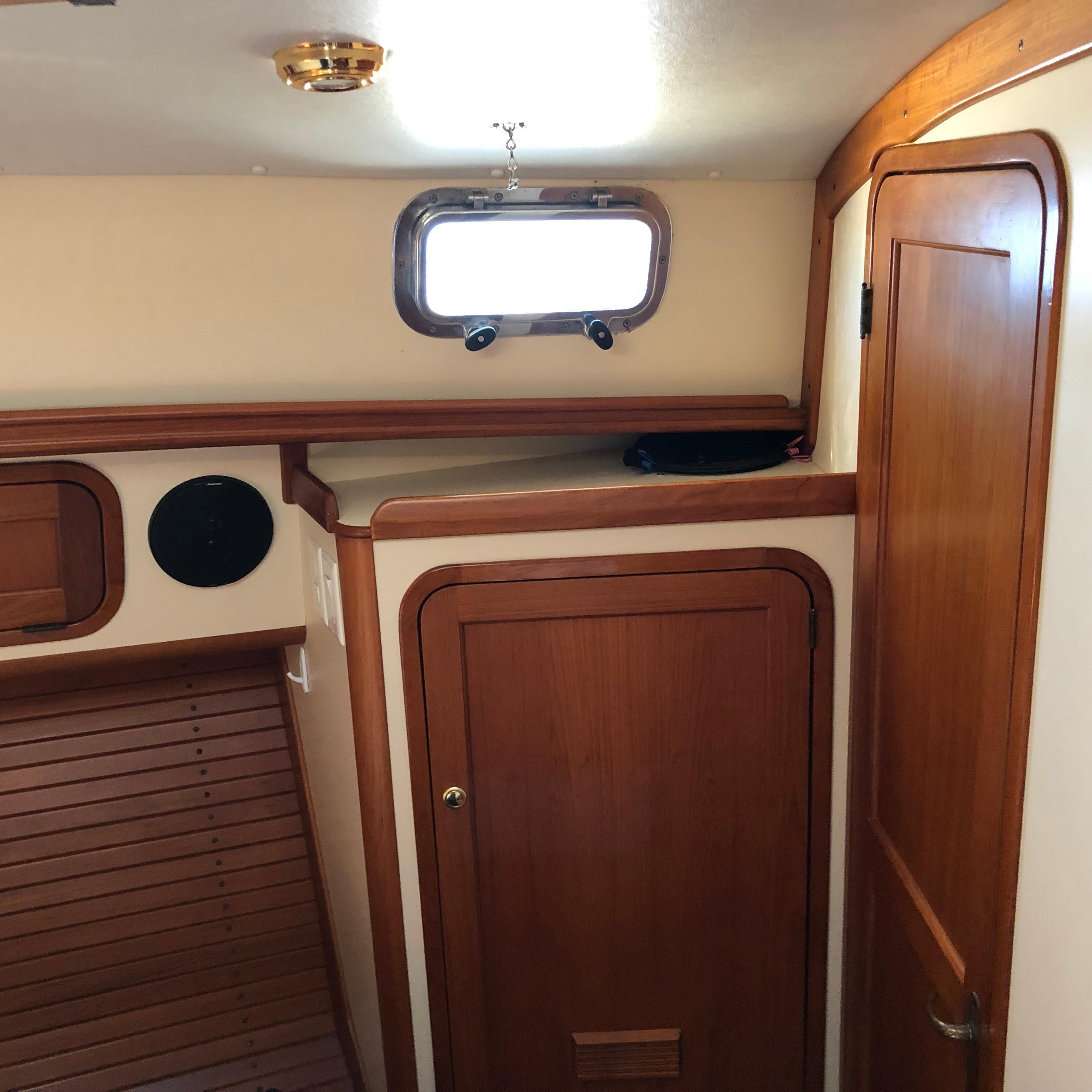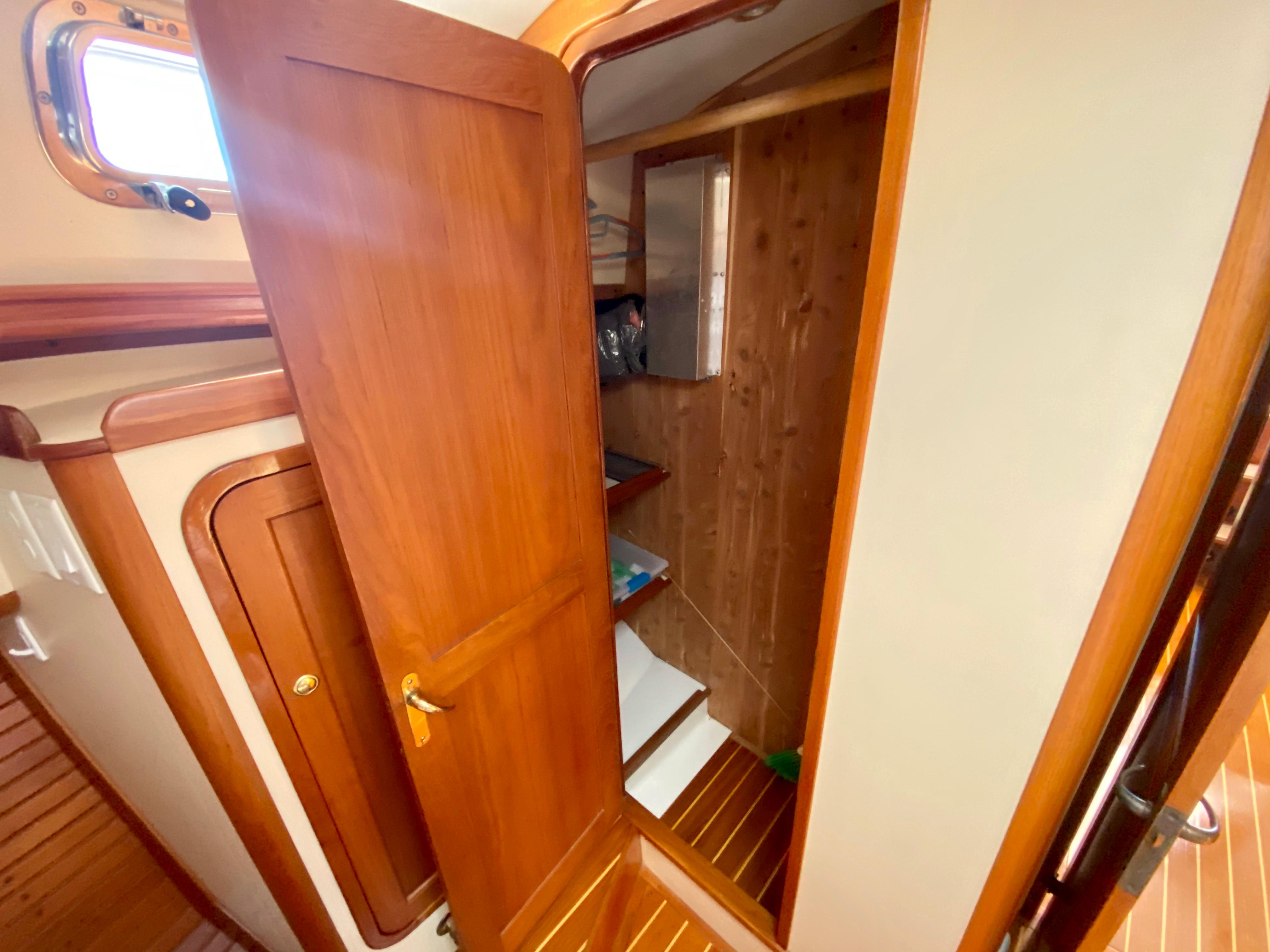 The master stateroom is forward with an island queen berth and en suite head. There are (2) cedar hanging lockers and a full-length locker with shelving.