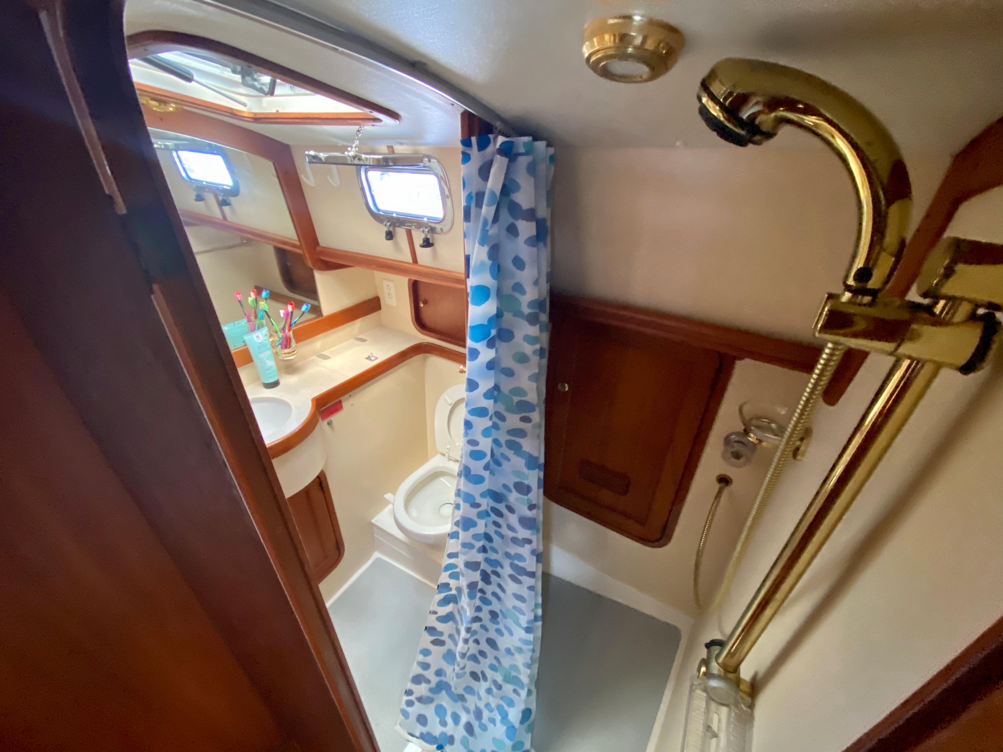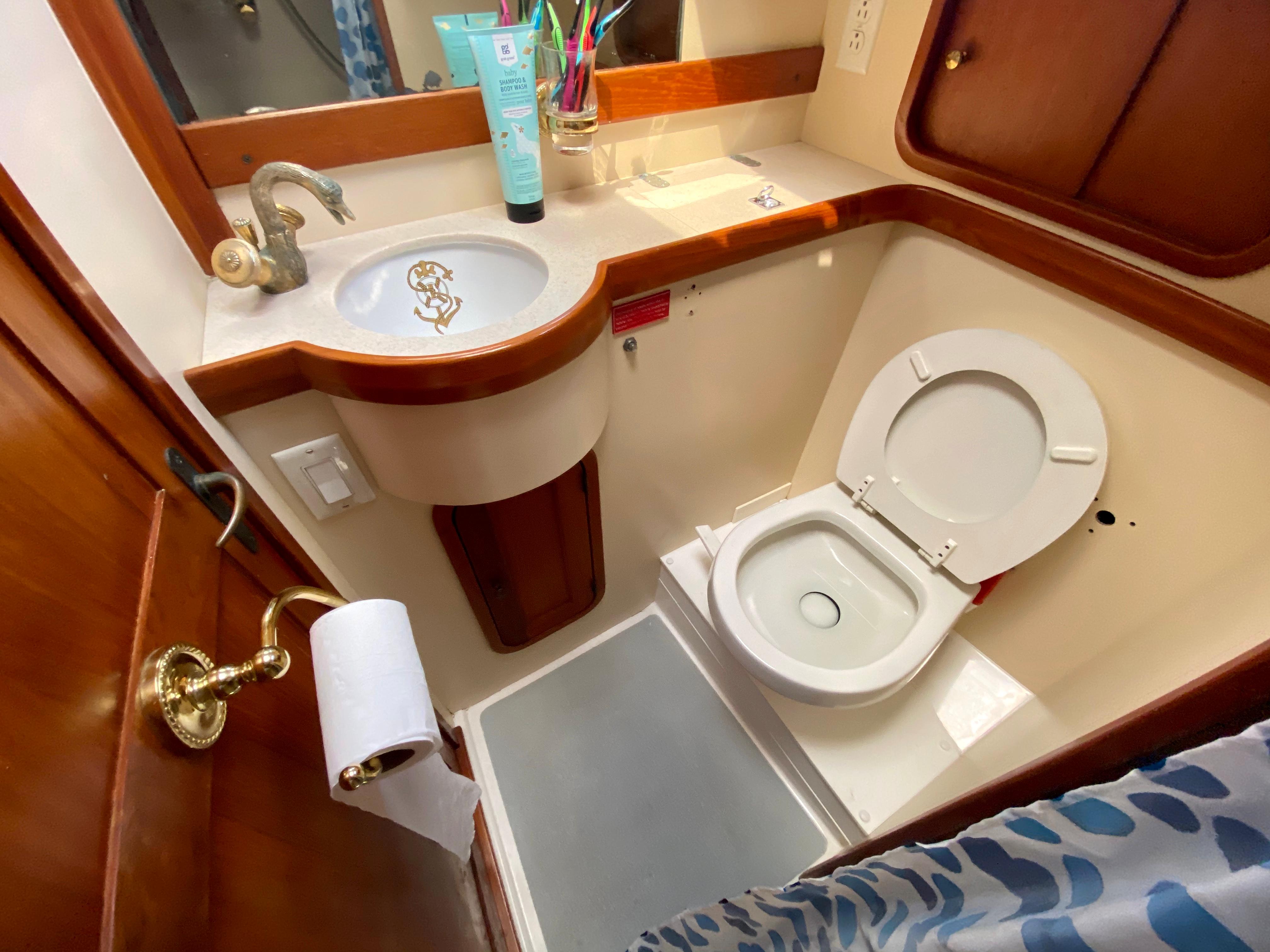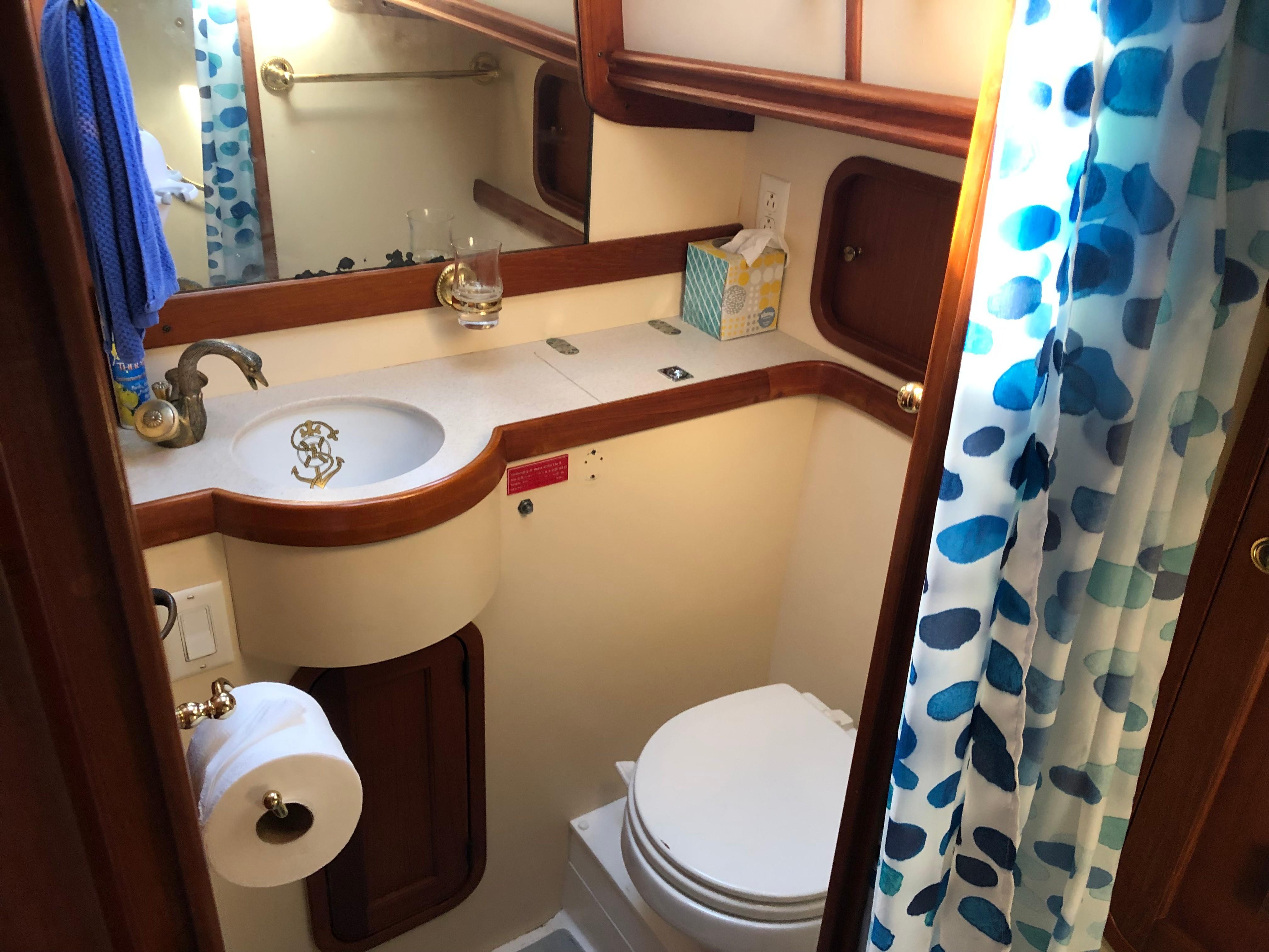 The spacious head is complete with a separate stall shower and Vacuflush head. The Vacuflush head and holding tank were new in 2014.