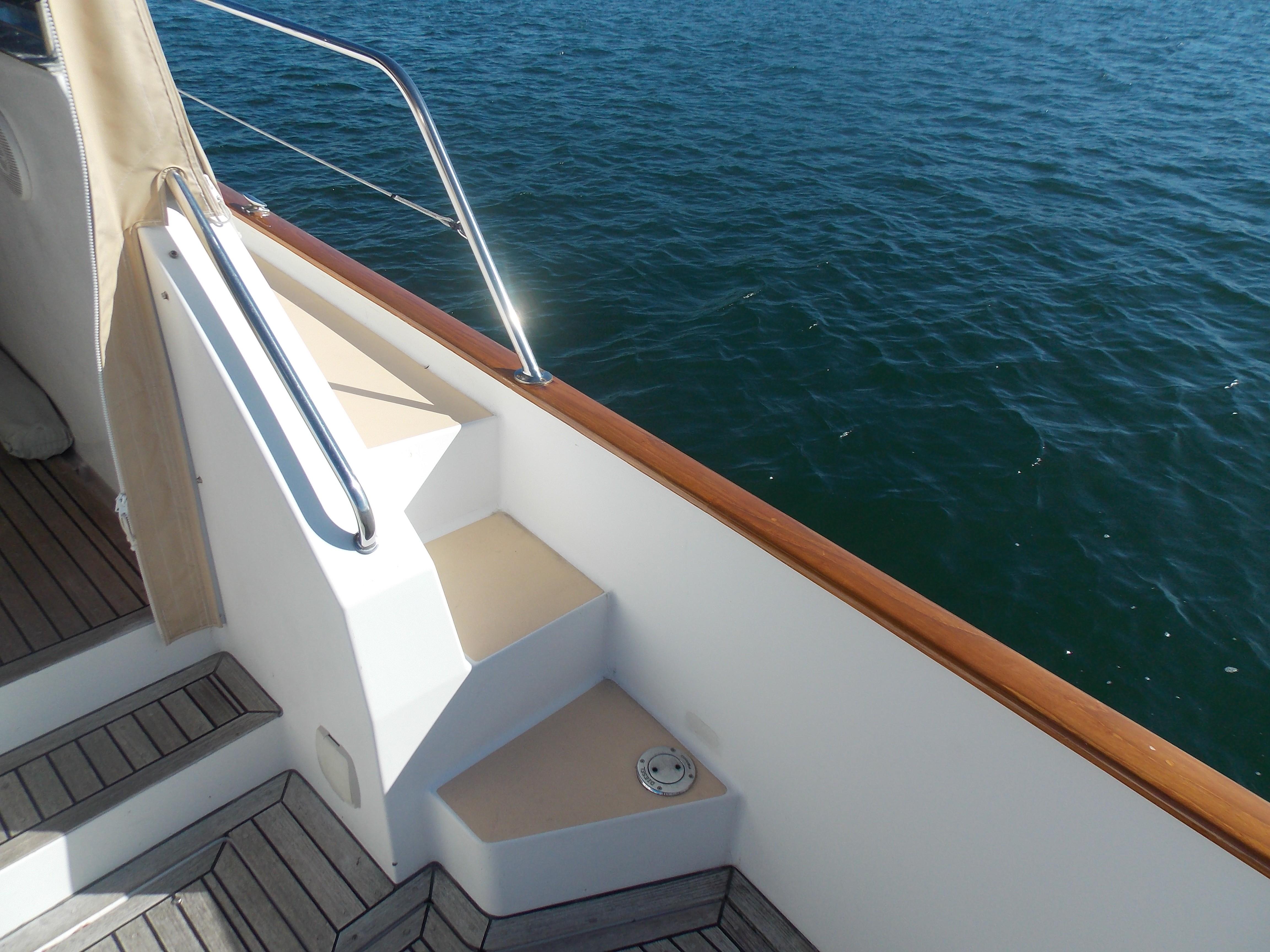 The hull, superstructure, deck, and liners are constructed of hand-laminated FRP with balsa core. The hull to deck joint is a shoe-box type fastened and glued with 3M-5200 sealant. The hull is protected with a molded FRP rub rail and SS half-round rub strip.