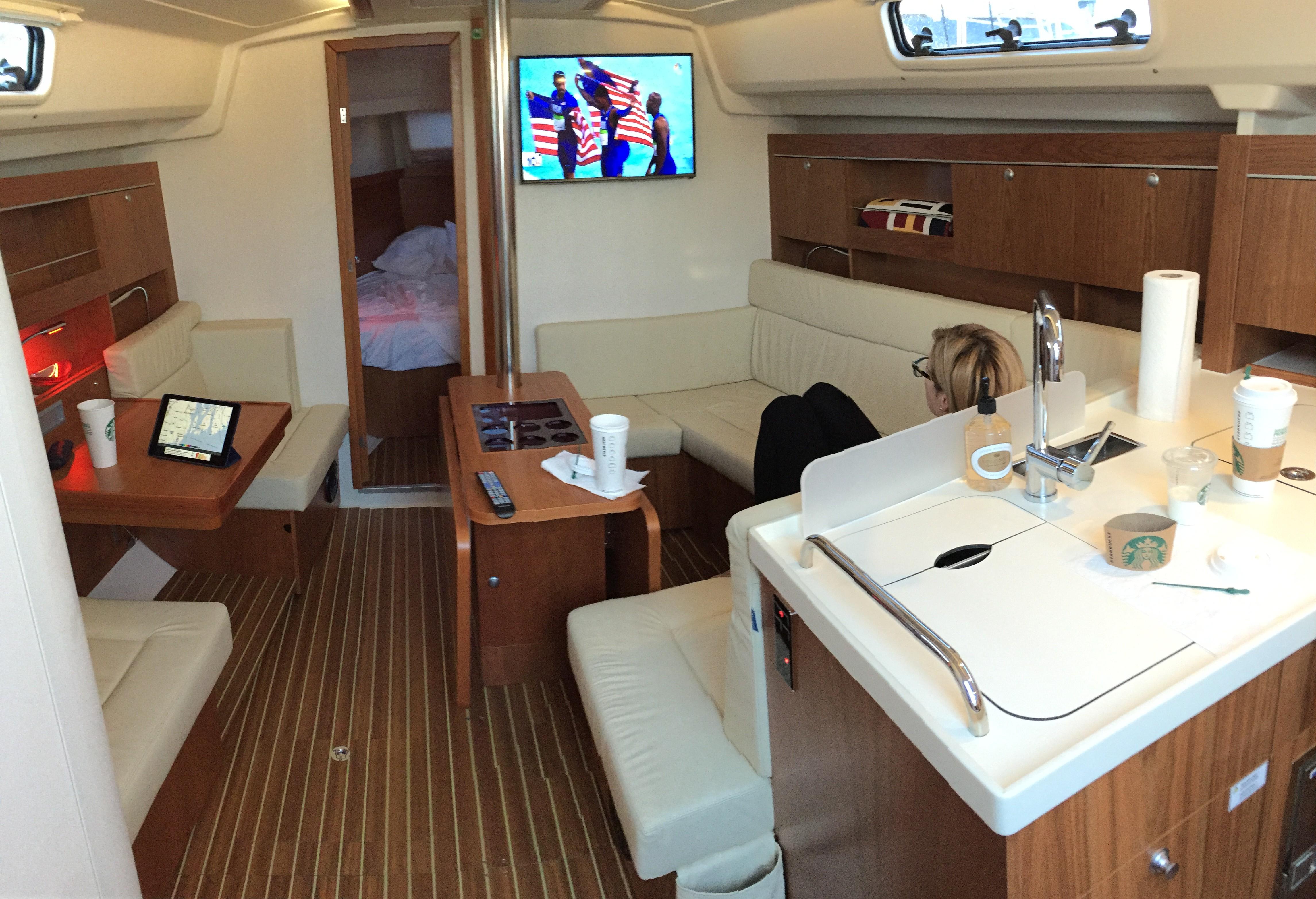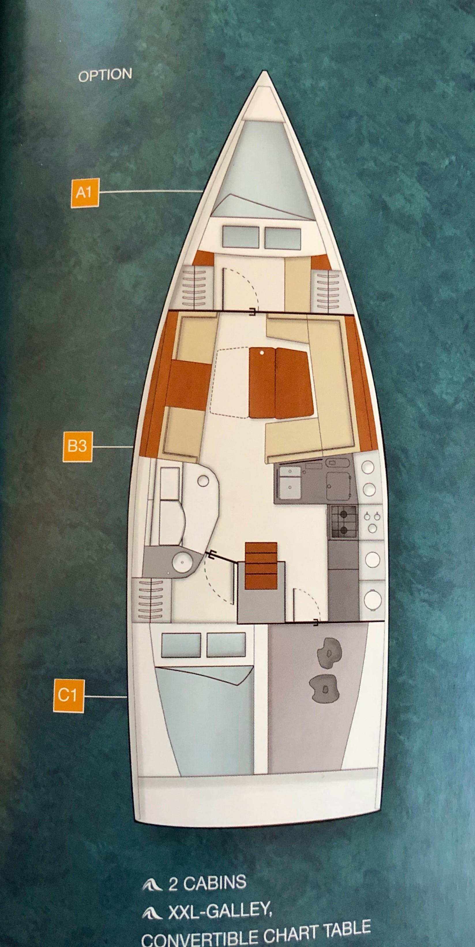 - U-shaped starboard settee converts to double berth; 6’6’’ long