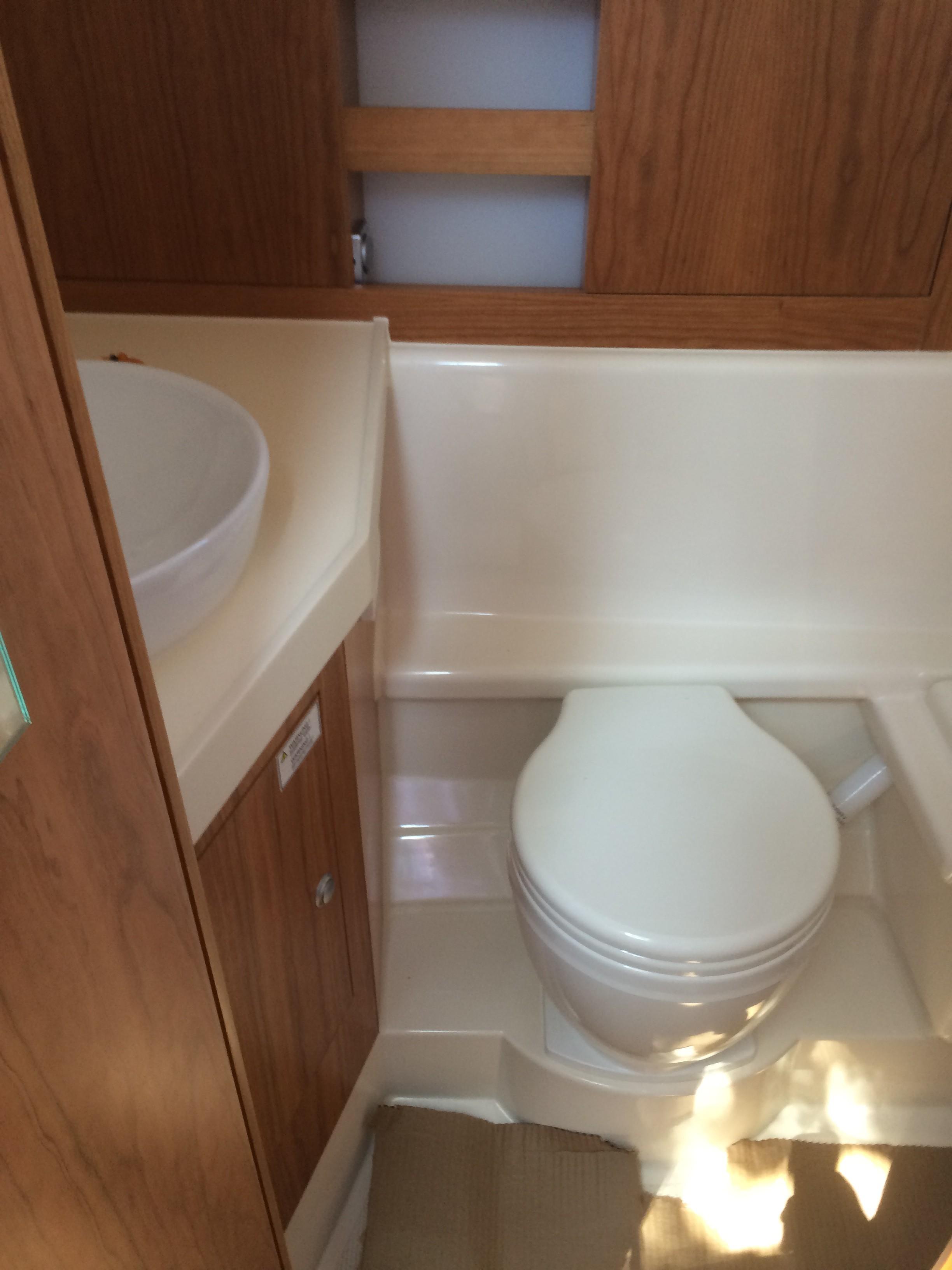 - Spacious head with vessel sink vanity and Jabsco manual head