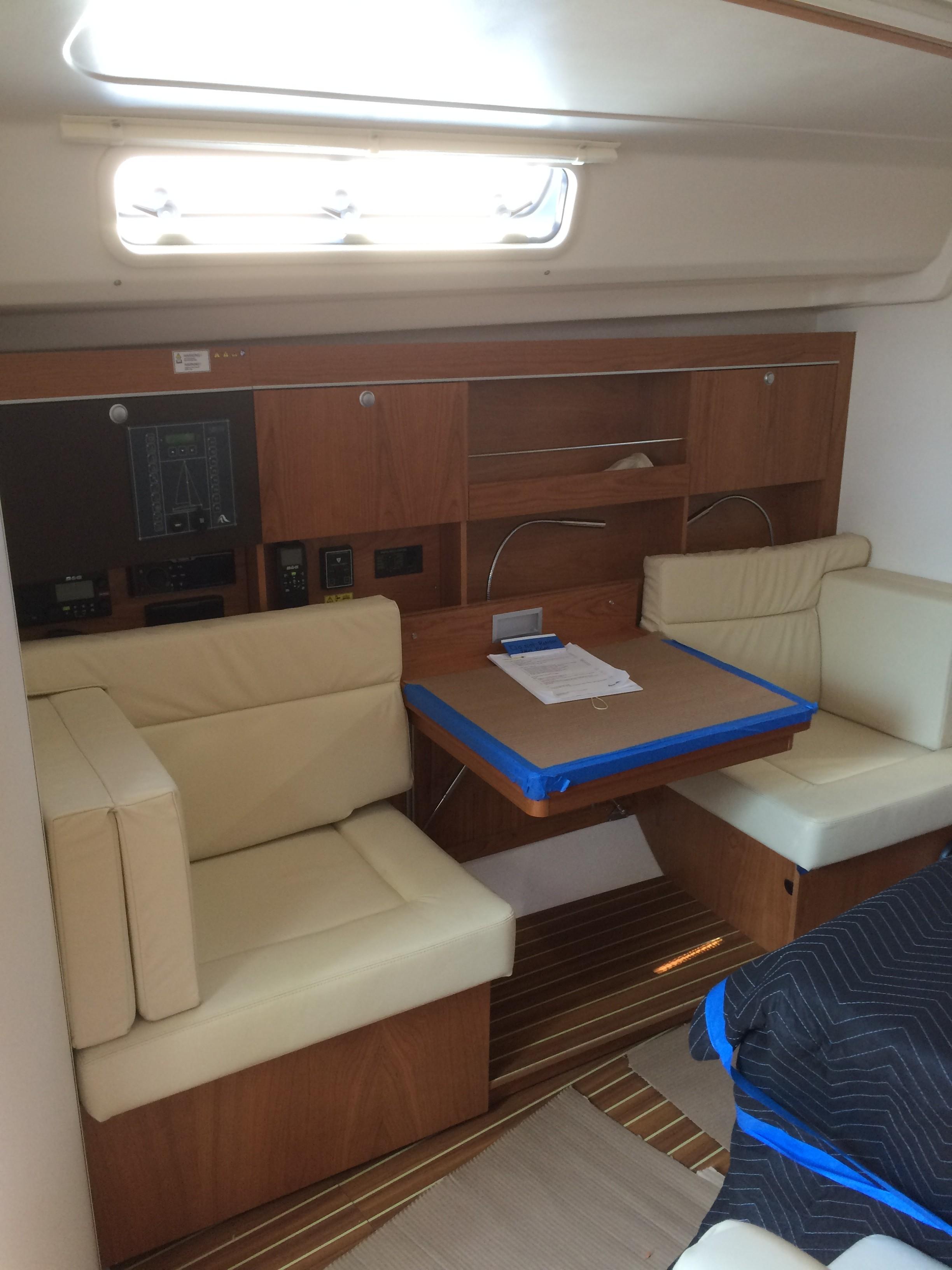 This Hanse 385 features the upgraded battery package and a battery charger. The electric panel is located at the chart table and can be easily serviced thanks to the quickly removable face panel. The 12v and USB outlets at the chart table are readily available for quick charging as well as 120V outlets throughout the yacht.