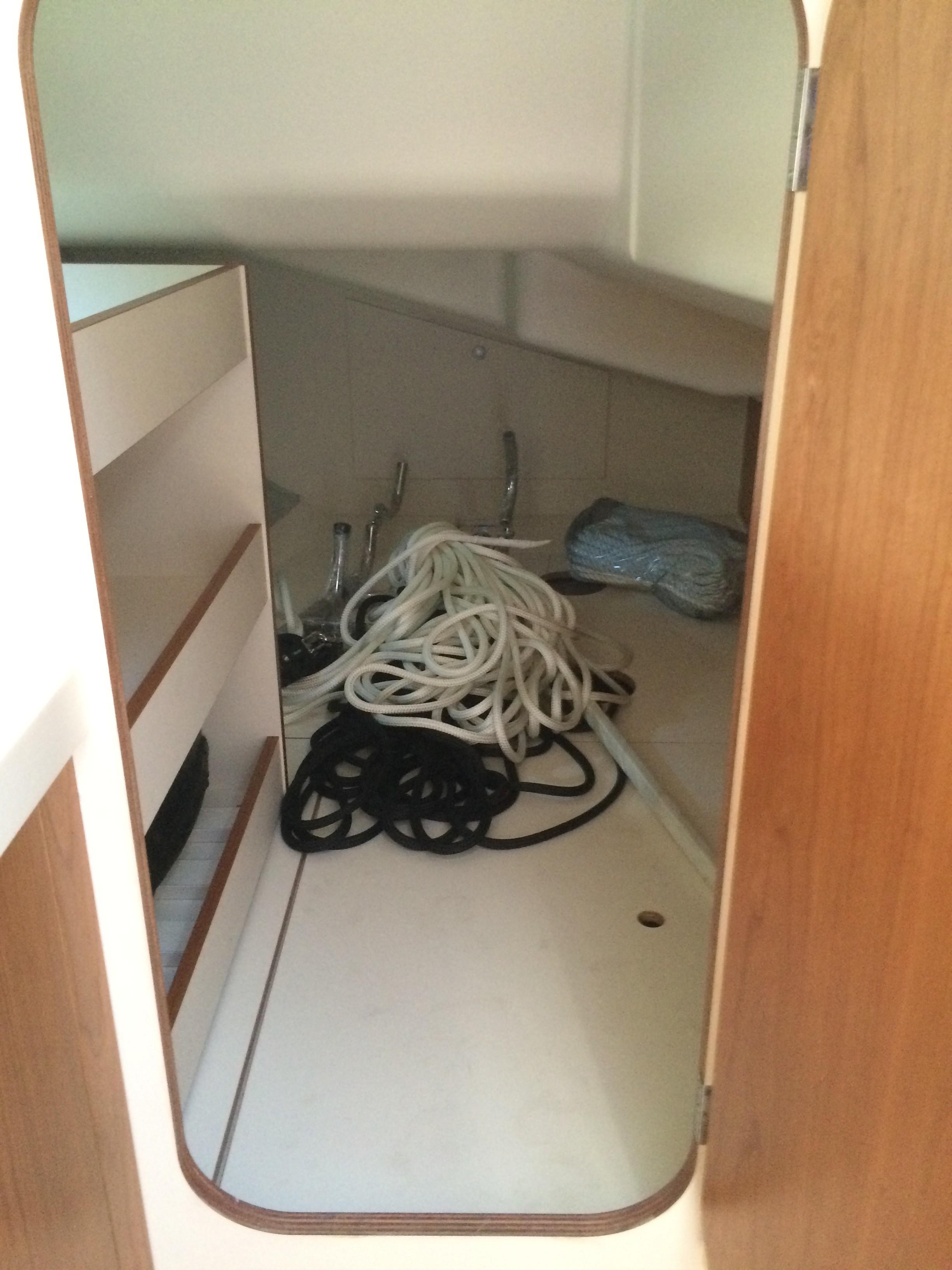 This boat is a two-cabin layout. The second cabin is located aft of the head on the port side. The aft cabin offers a spacious double berth with plenty of privacy. The double berth is 6’10’’ long and has comfortable 4’’ cushions. There is plenty of storage with a deep hanging locker to port and a long storage shelf leading aft. Two opening Lewmar hatches, a fixed side port and an additional skylight from the cockpit provide natural light and ventilation.