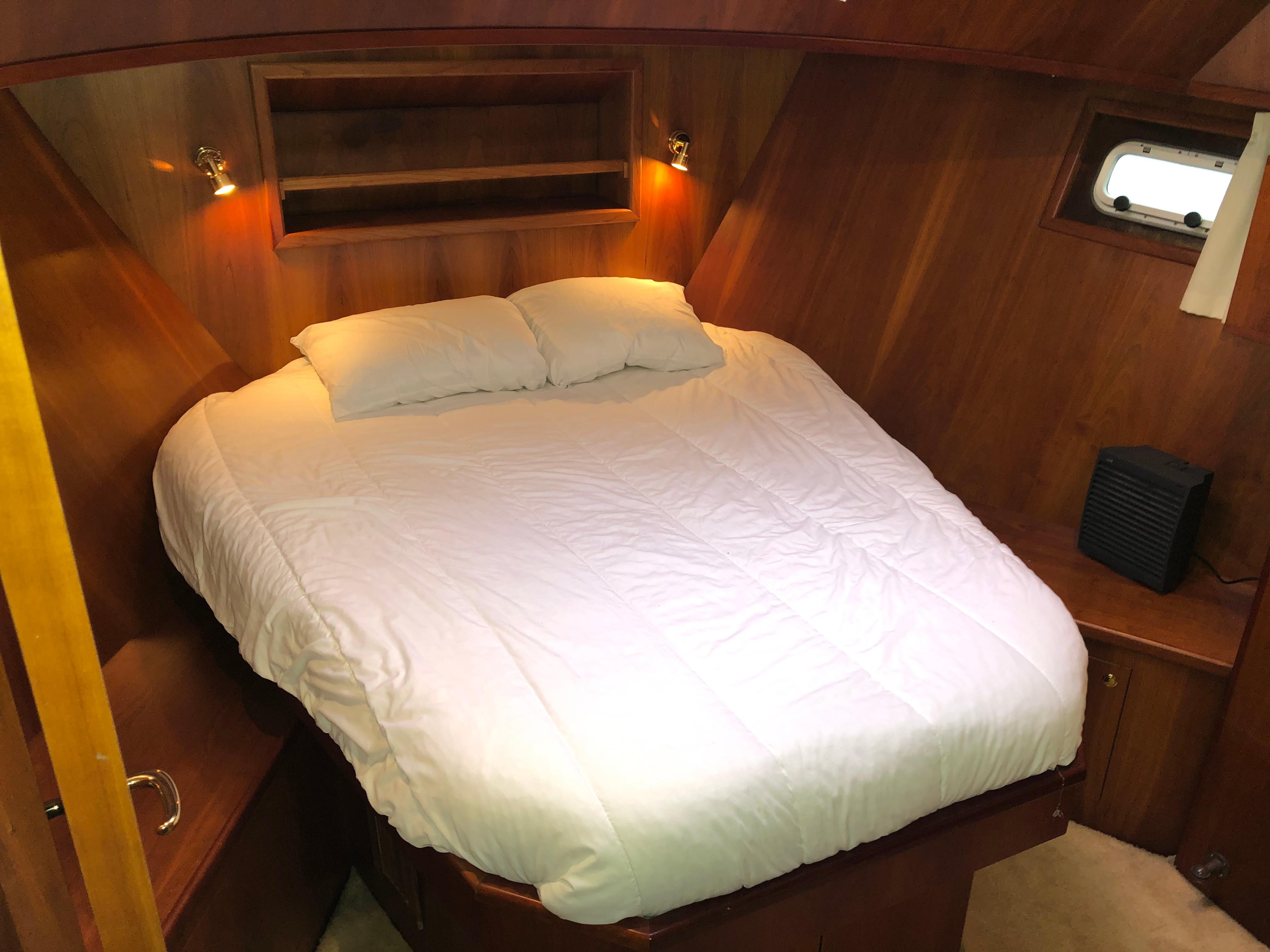 The owner's stateroom is forward. This is a very private space with a centerline workaround berth, ample lockers and storage, and a private ensuite head with separate stall shower.