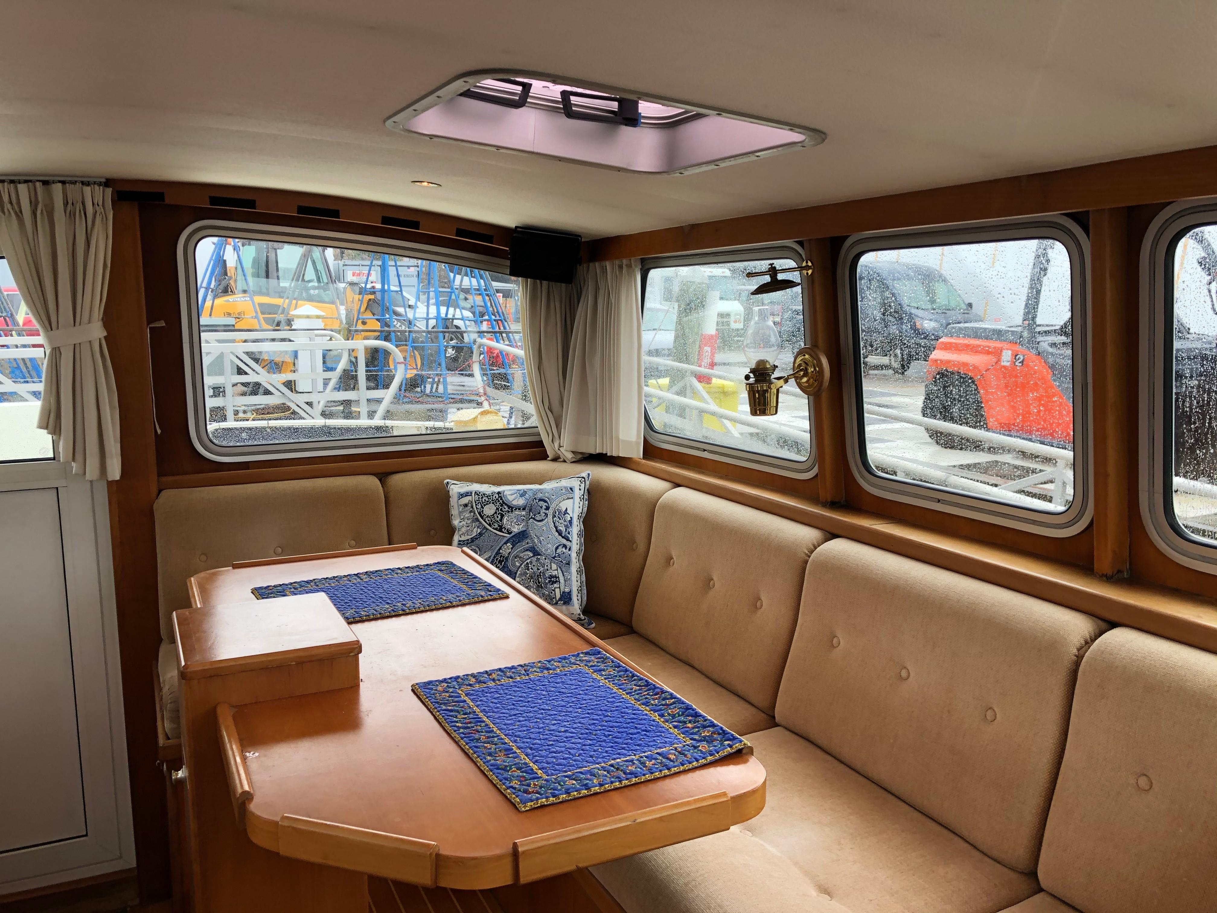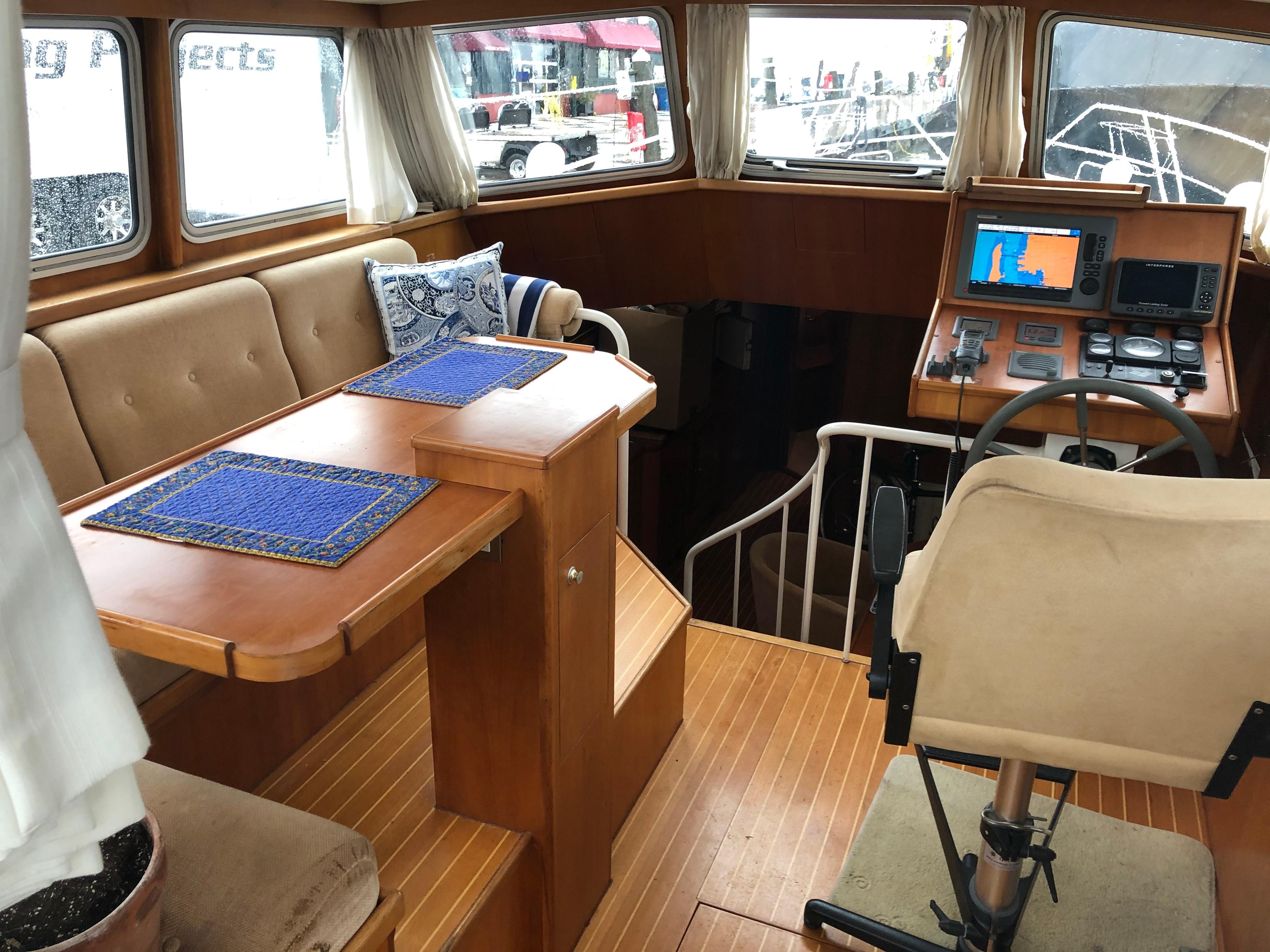 As you enter from the aft deck you are in the pilothouse. The first thing you realize is this space is much more than simply a helm area. The size of the pilothouse creates a complete lounge area for all your guests. A huge L-settee surrounding a table is found along the port side. The settee is on a raised base to make sure anyone seated has a perfect view. Multiple large cabin windows give this space a bright and open feel. The helm area is situated opposite and forward on the starboard side.