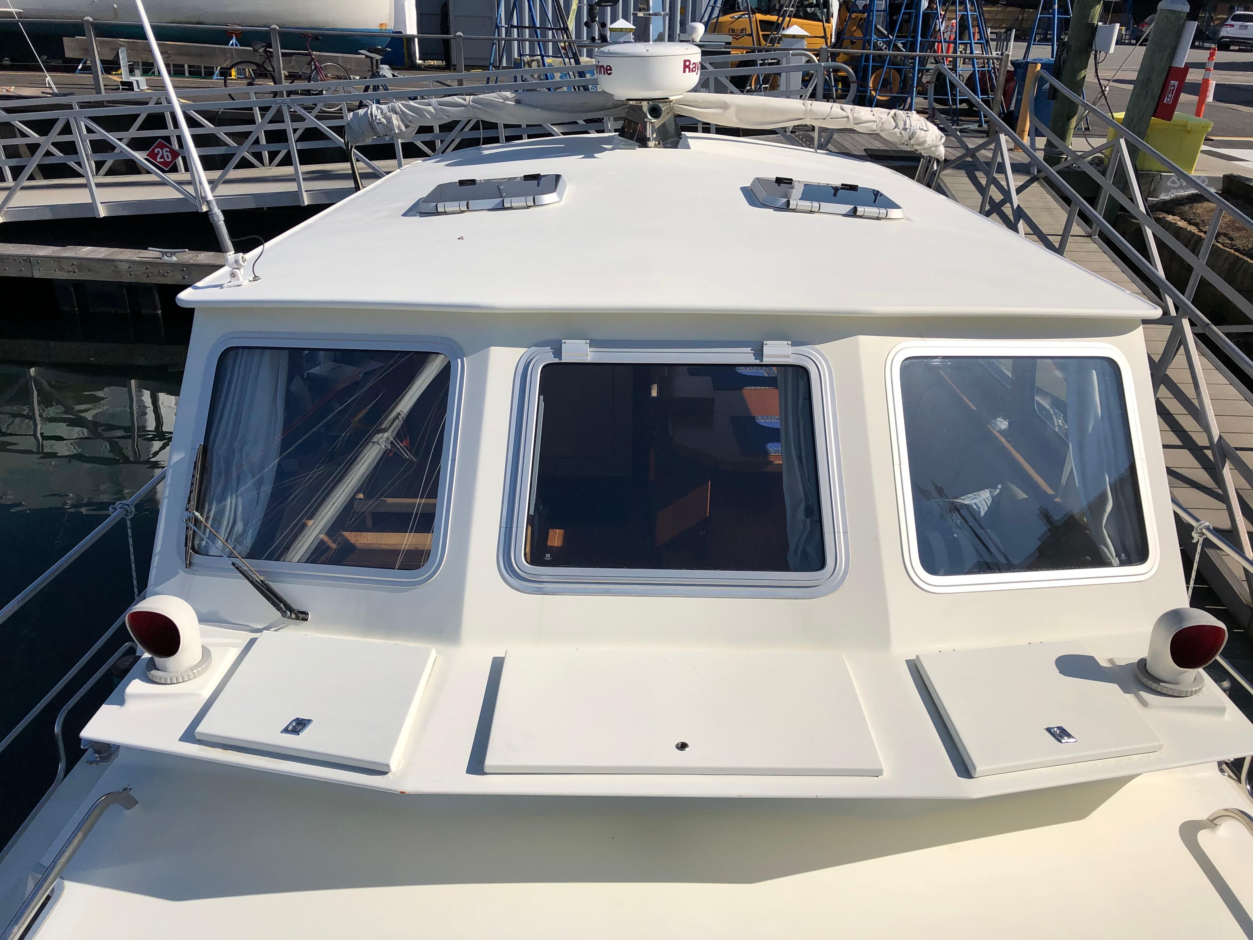 The Pilot 44 is approx.14 tonnes. Built much like a larger ship she is a multi-chine hull made of "A" quality steel. The hull itself is 5mm, the keel is 12 mm and the spray rails and superstructure is 4mm. The superstructure has thermopane windows in anodized aluminum frames. There are (4) 20" x 20" hatches, (6) round portholes and (4) oval portholes all made by Gebo.