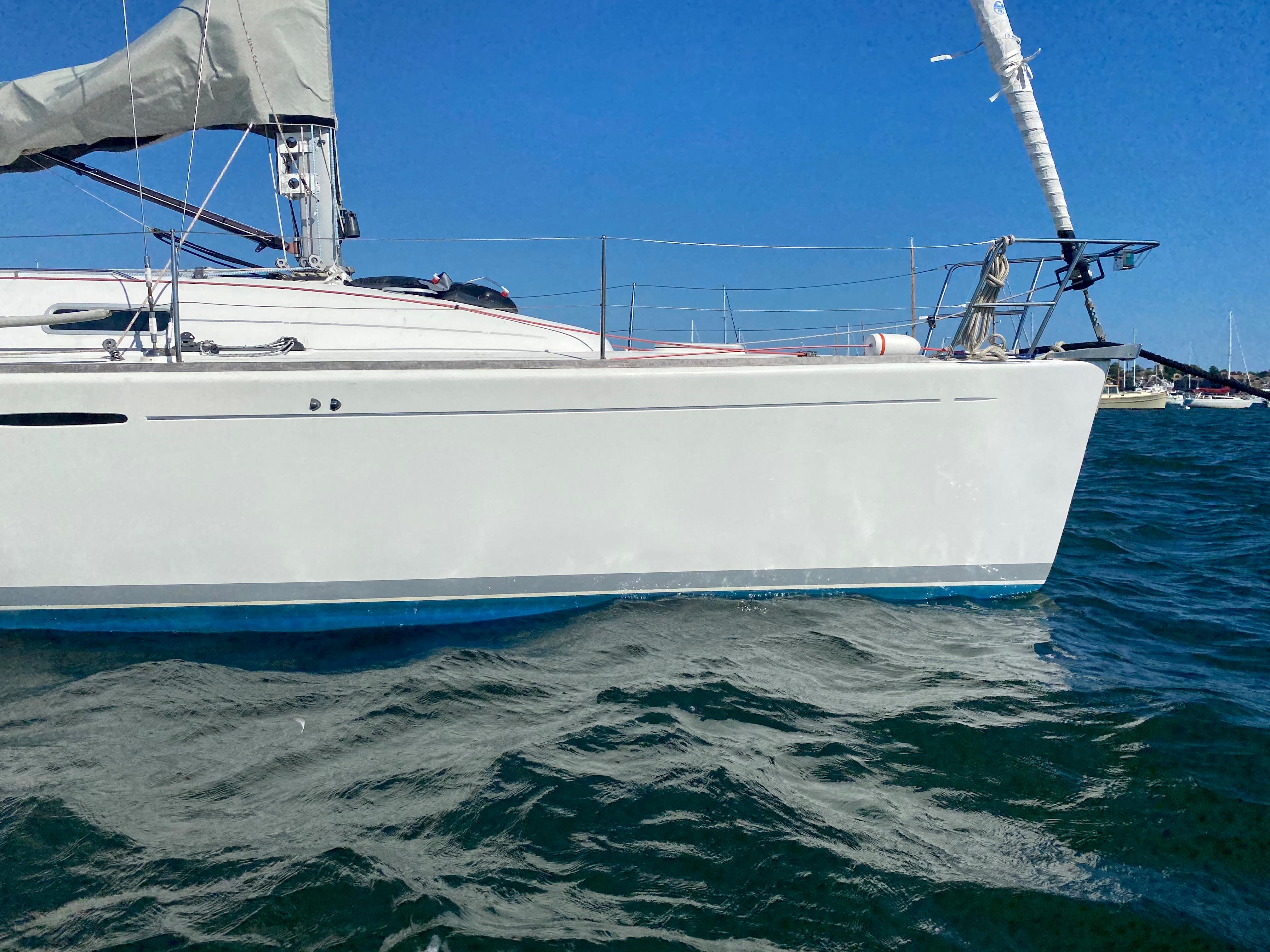 Hull is solid fiberglass/GRP w/ structural hull liner, laminated for load-bearing and distribution. Deck is a fiberglass/ GRP balsa sandwich for rigidity, reinforced with unidirectional rovings, weight saving, insulation, and soundproofing. All bulkheads bonded 360 degrees to hull and deck for structural strength. Carbon fiber rudder and stock