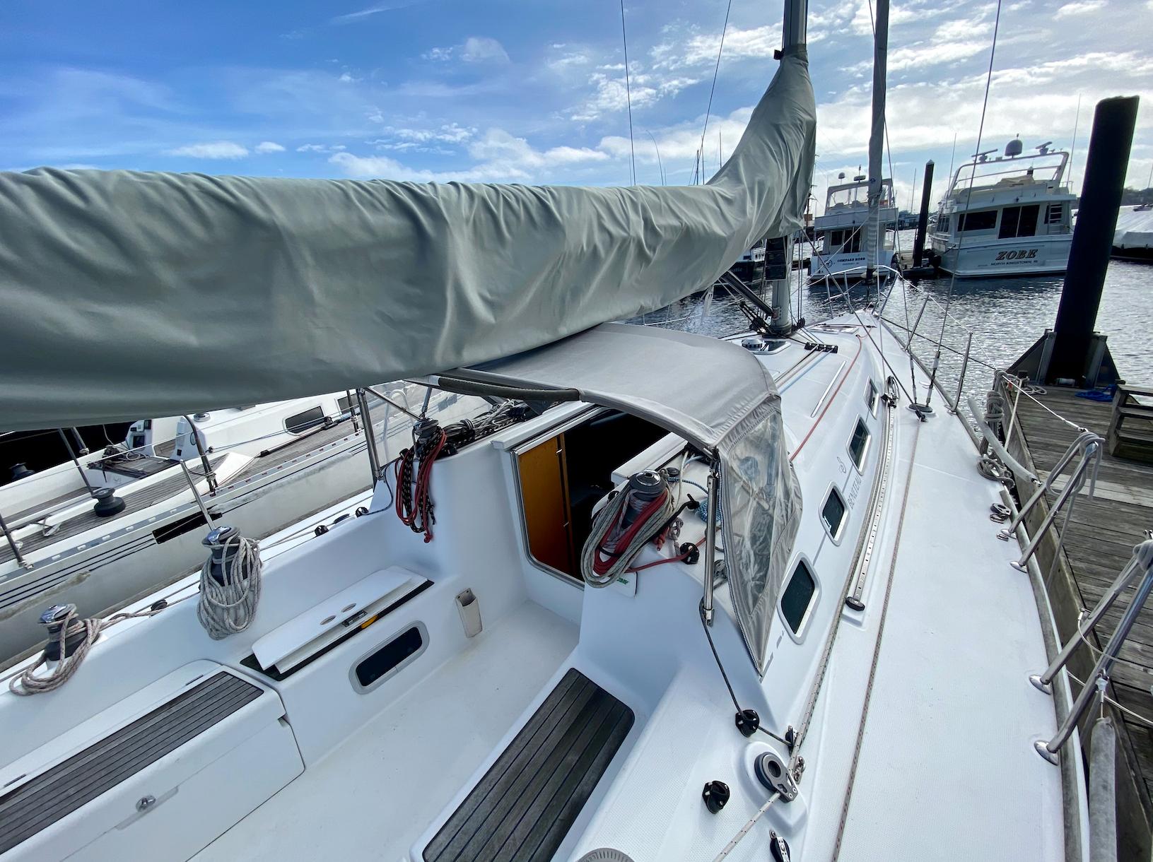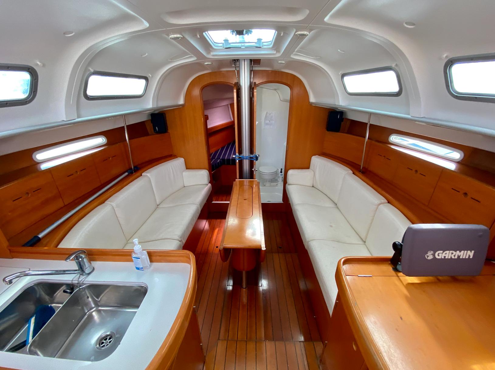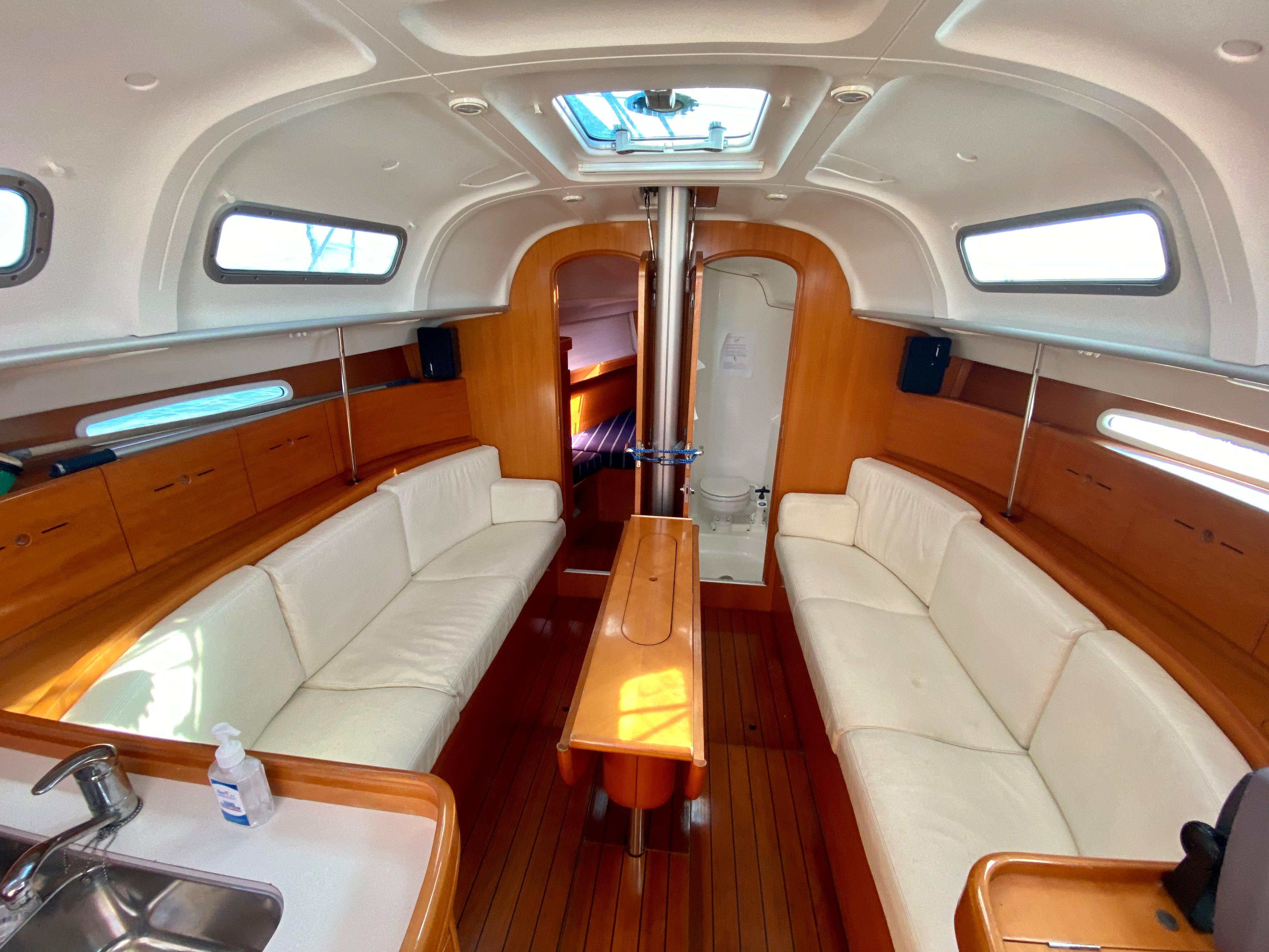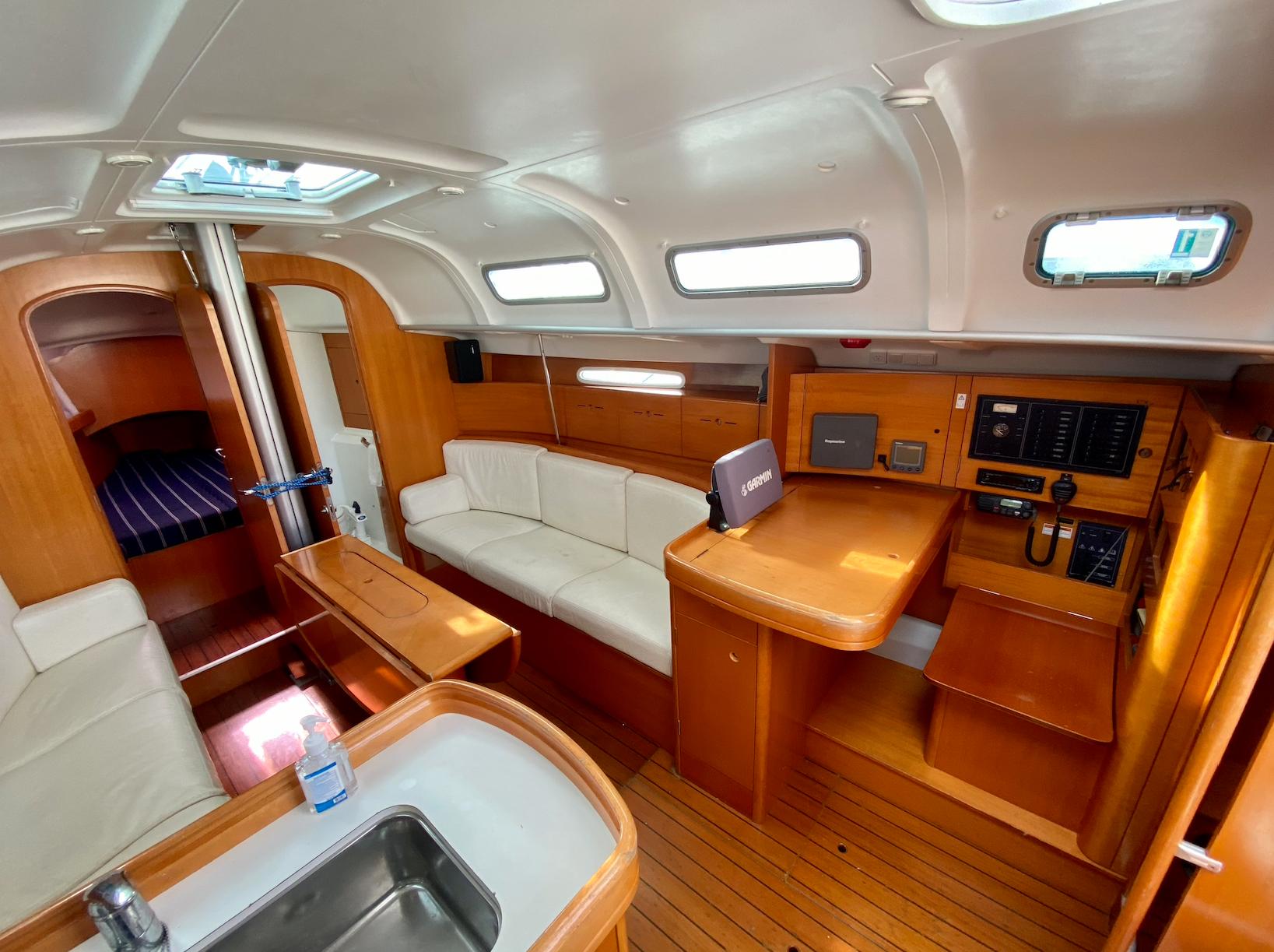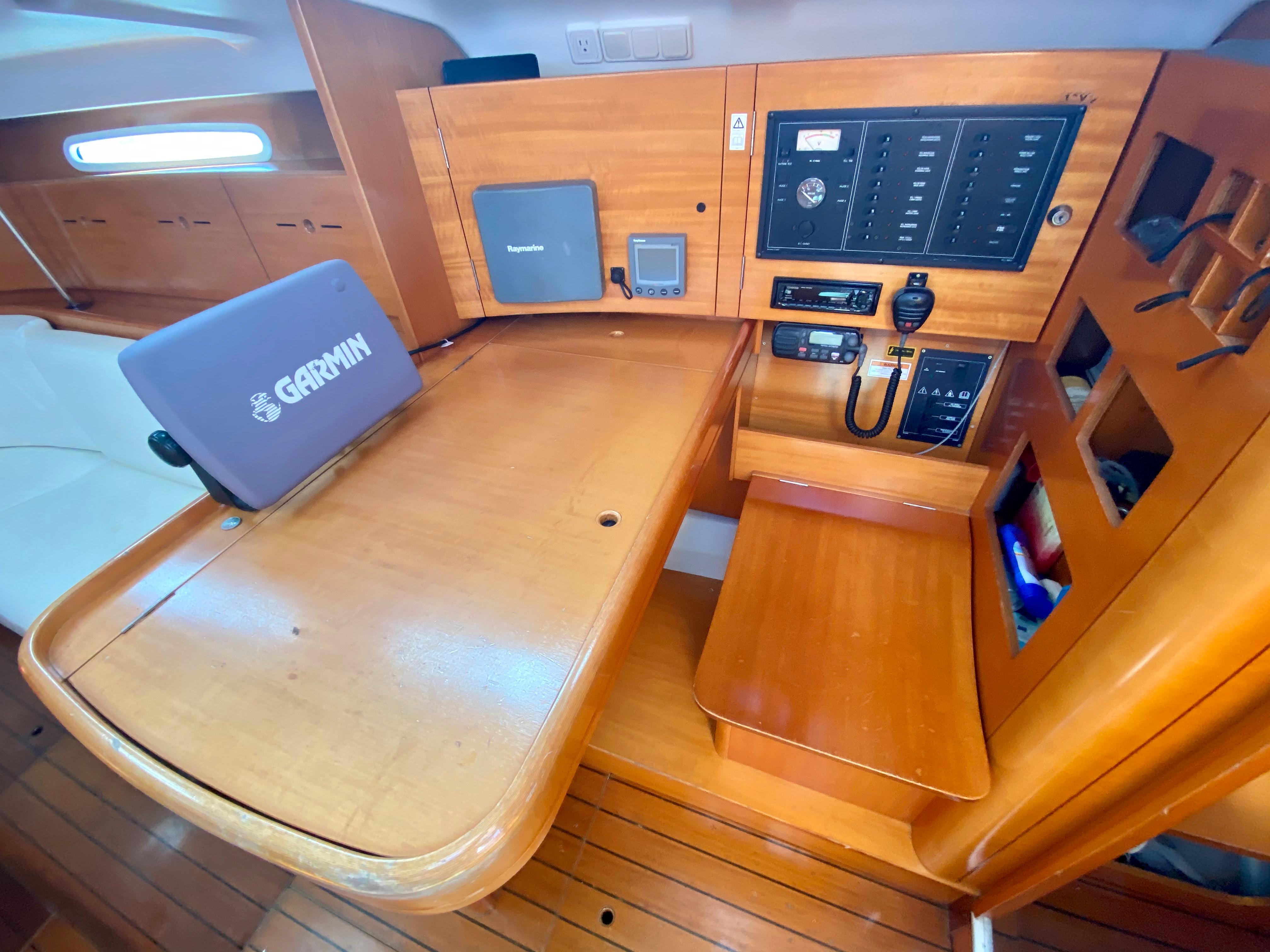 locker and separate access to the head. Her salon features a large centerline table with very comfortable settees to port and starboard. Just aft to port you will find the "L"-shaped galley. Opposite to starboard is a large nav station with a great complement of electronics. Aft of the galley and the nav station she has two identical cabins. She has excellent ventilation throughout the salon and staterooms, provided by the opening ports, hatches, and 12 volt hella fans.