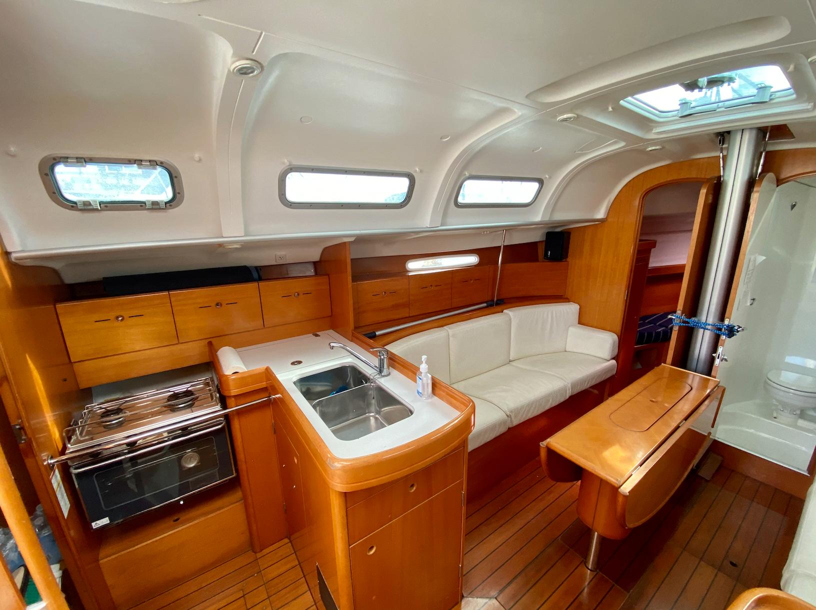 Double s/s sink with mixing tap, 2-burner Eno propane stove with oven, 12 volt Frigoboat refrigeration, Cutlery draw, Trash can, (3) Stowage compartments with doors, (2) Overhead lights, Dust pan in the floor, Lewmar opening porthole.