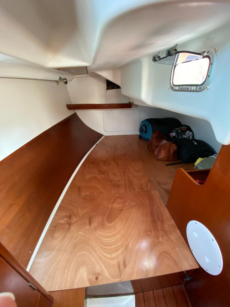 Entry down 3 steps into the main salon has master stateroom aft to starboard with a private door, queen berth, hanging locker, side opening port windows. Head with private door, sink, shower, storage below, opening port window. Galley to port side aft with top loading refrigerator, stove/oven, top-loading pantry dry storage, double stainless steel sinks, storage above & below. Large salon with nav/chart table, single settee to port and starboard, dinette table converts into double berth with filler cushion. Storage below both settees. Forward stateroom with private sliding pocket door to the v-berth, hanging locker, top side opening hatch, side port windows, 12-volt lighting.