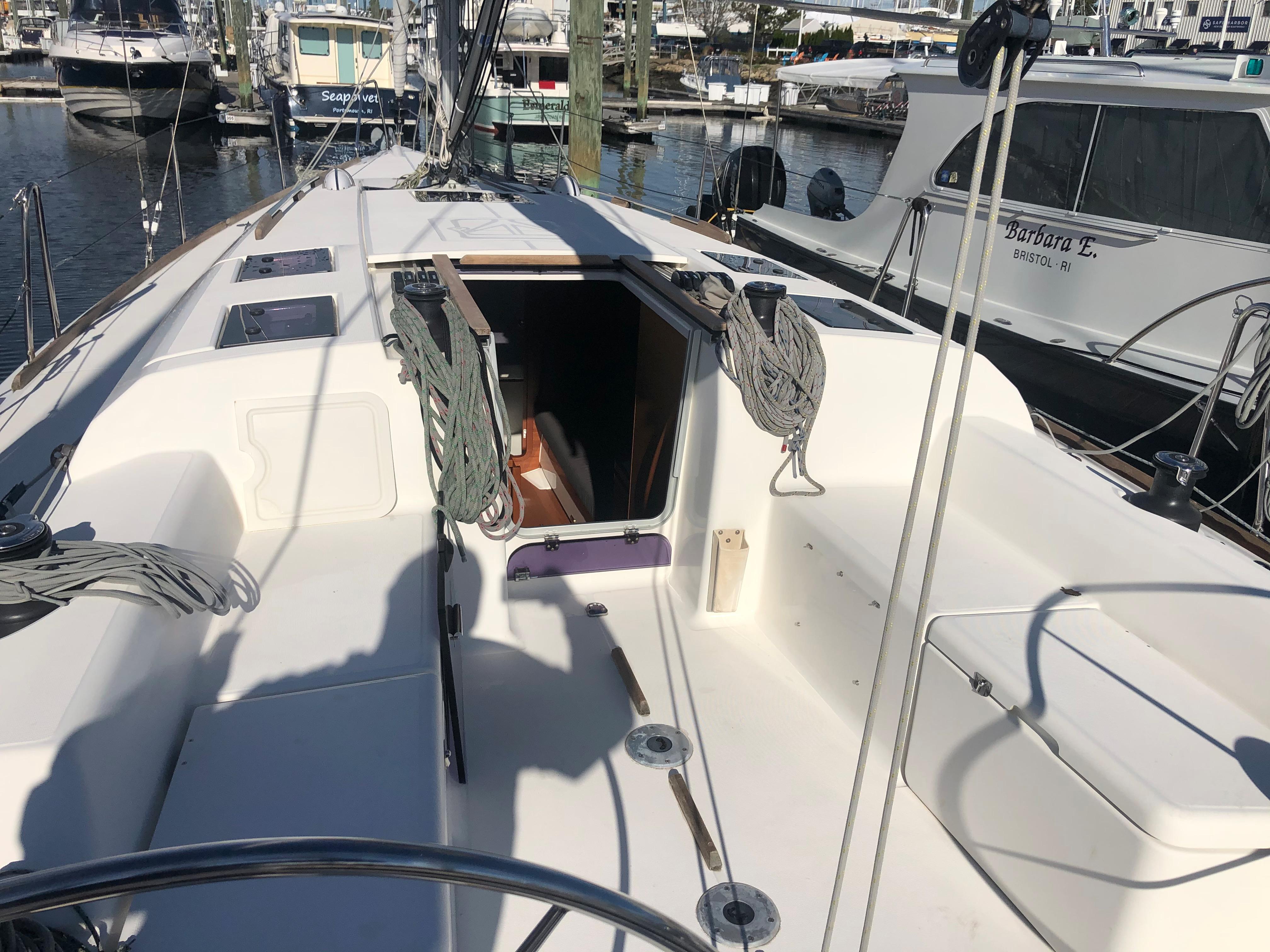 Access to the forward cabin is through two large opening doors. When they are open it makes the interior feel like a much larger boat. She has an enormous V Berth measuring 6'10" by 6' 6" With a large storage area underneath. Port and Starboard Hanging Lockers with selves and shoe storage below. An overhead opening Hatch with Ocean Options retractable screens and sun shades. In fact, all deck hatches come equipped with these screens and shades.