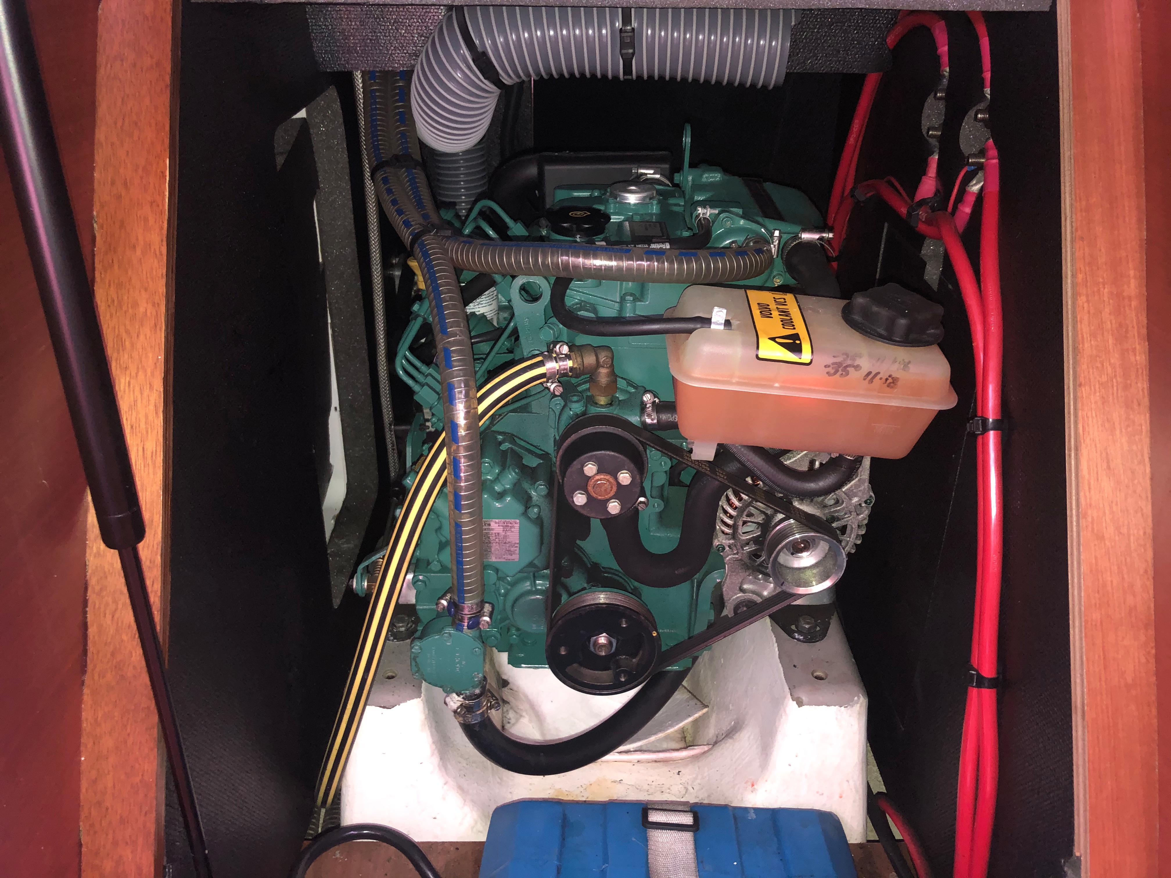 Volvo D1-30 30HP engine with SailDrive and two-blade folding prop.