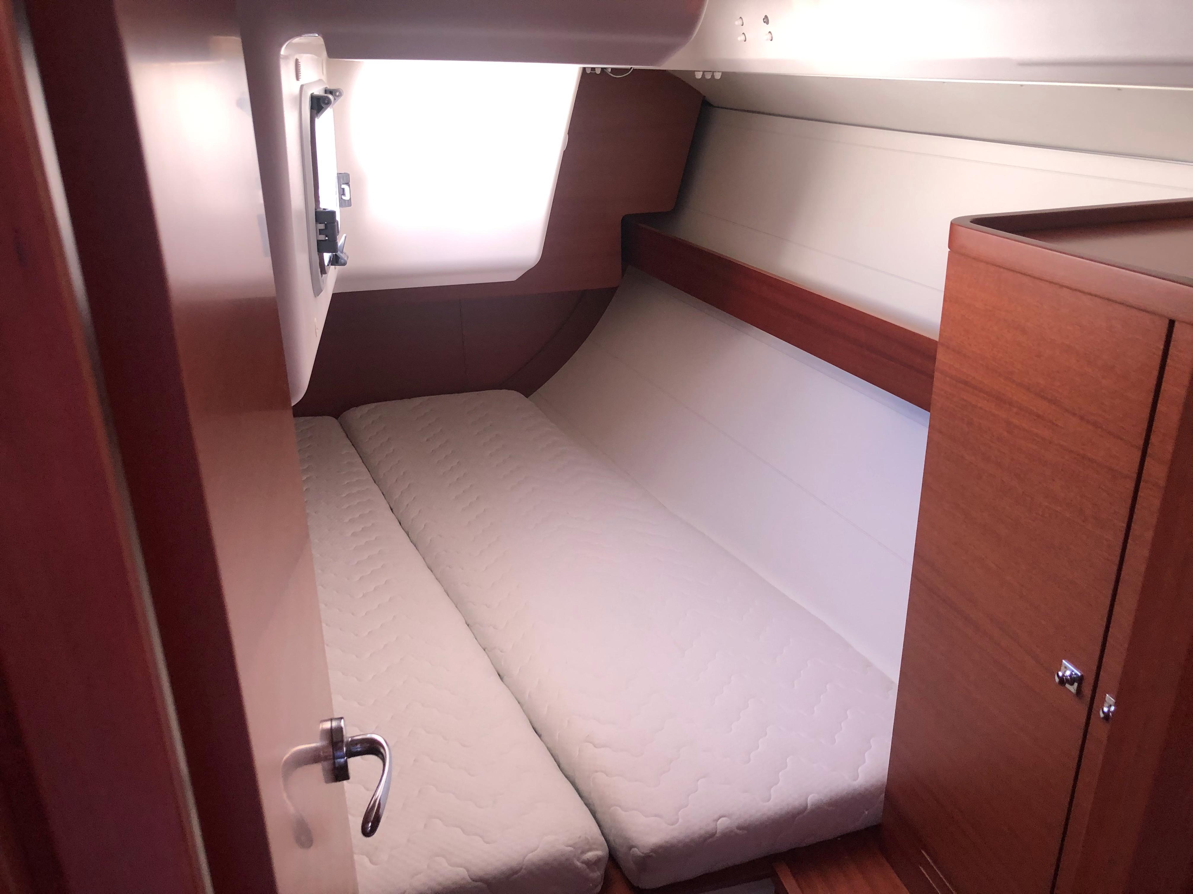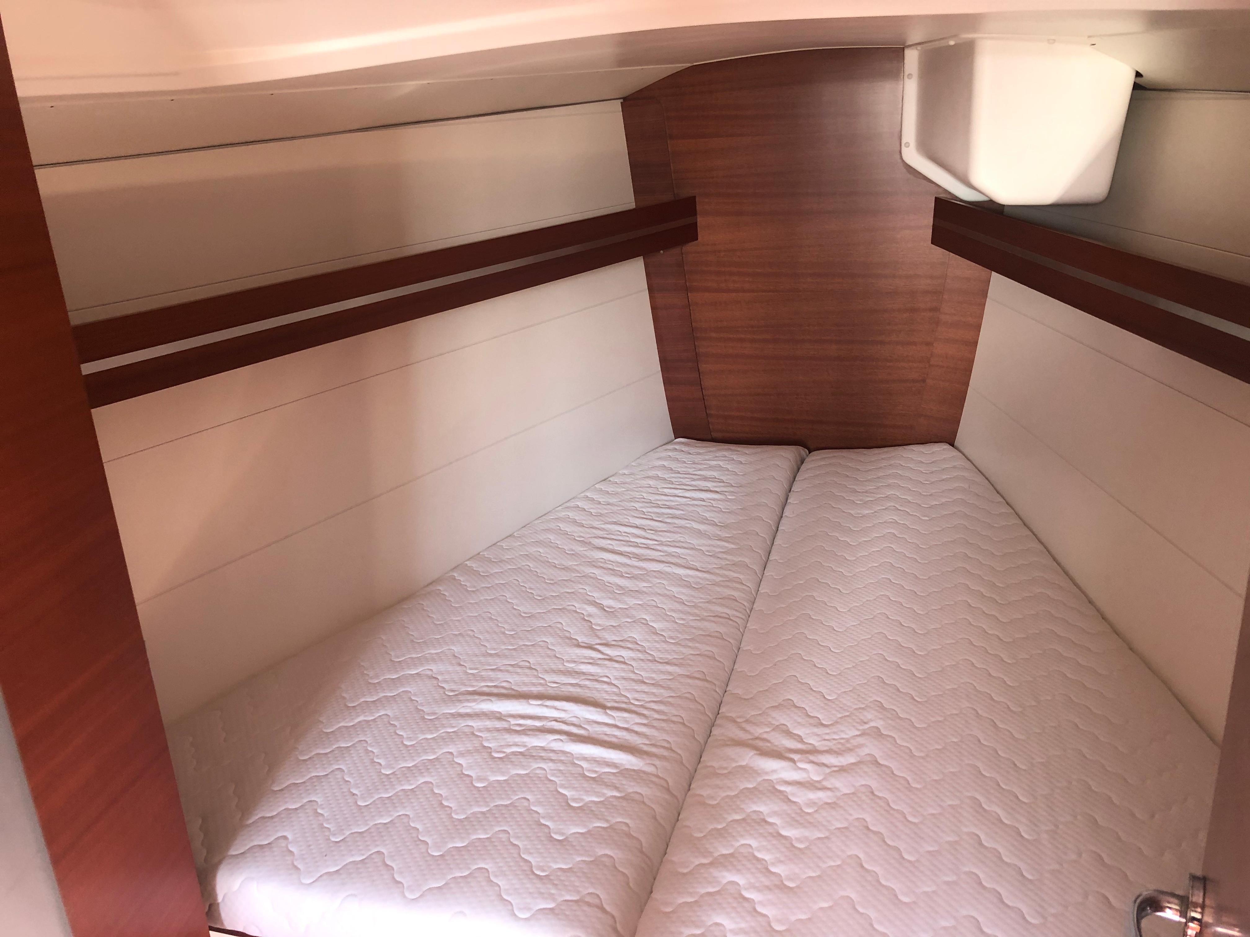 The aft cabin is to Port contains a double berth with an opening deck hatch and an opening port for ventilation. A hanging locker with shelves and storage underneath the berth.