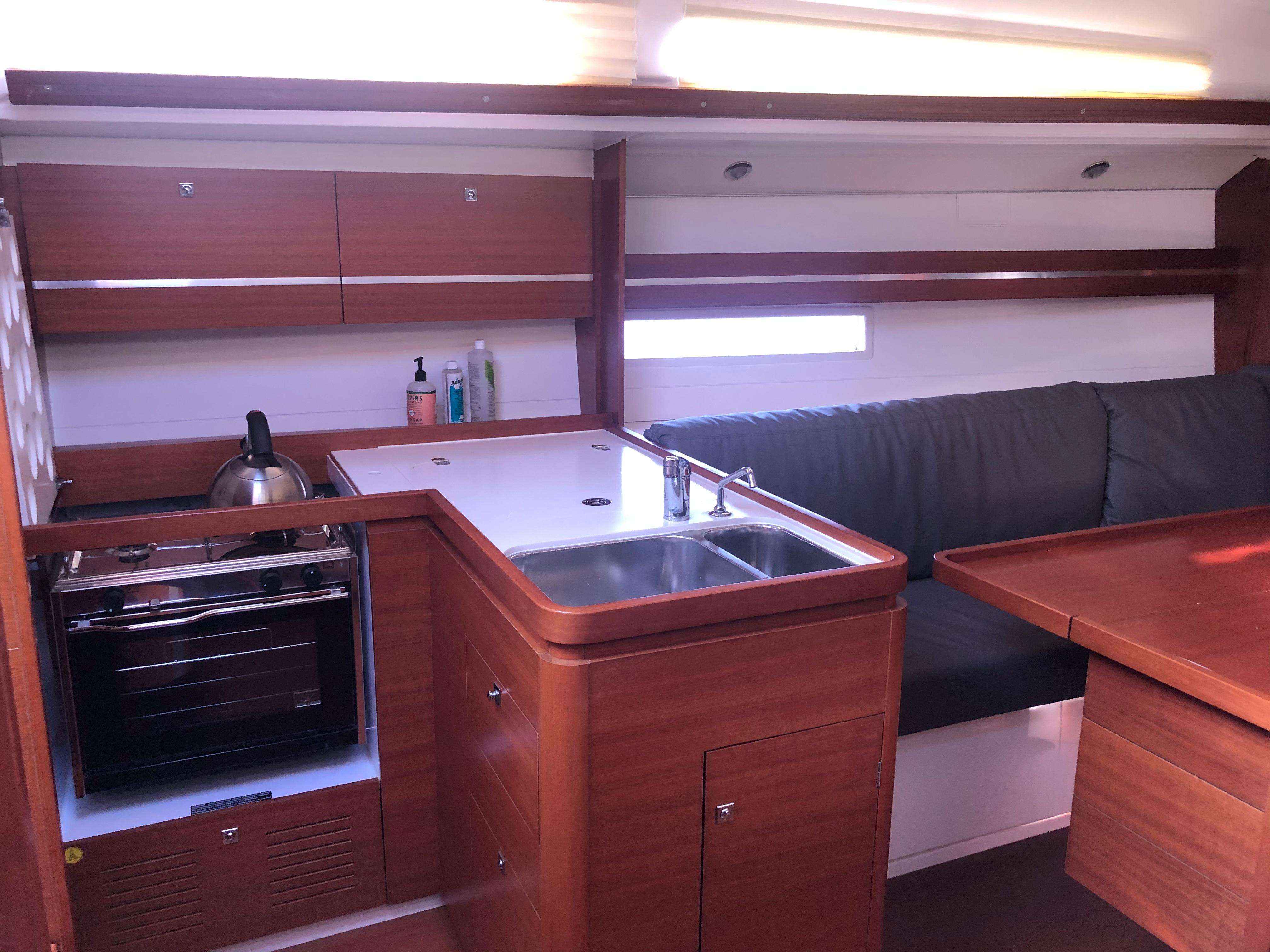 Aft on the Portside is the L-shaped galley. Featuring a (2) burner stove with oven. A large top opening 12-volt refrigerator. Across the cabin to starboard is a proper forward-facing Navigation Station. Complete with storage for the Laptop and easy operation of the Raymarine E7 chart plotter and Icom IC M424 VHF.