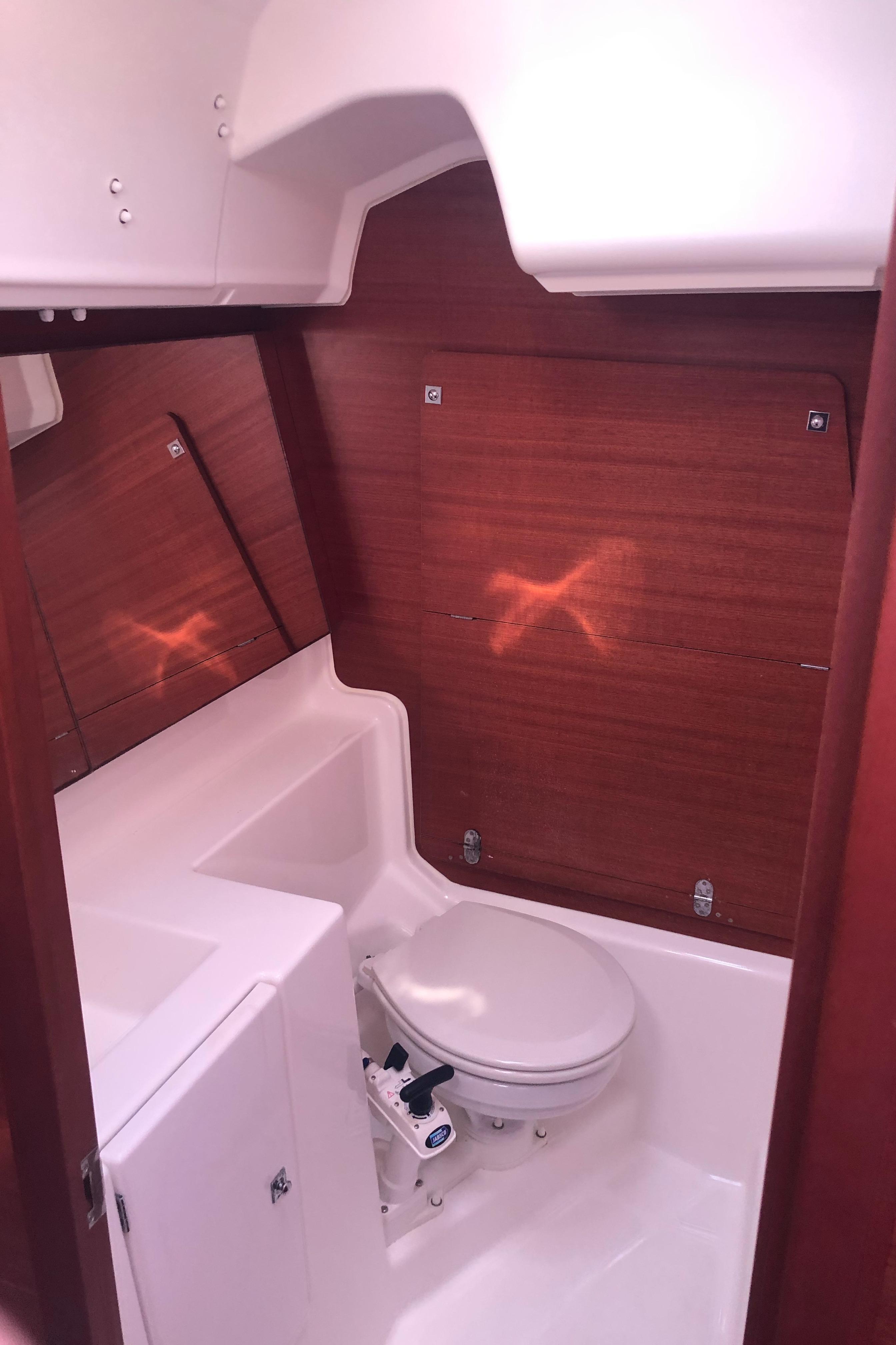 The head is to starboard, aft of the Nav Station. It features an upgraded larger toilet, Molded fiberglass countertop with hot and cold pressure water at the sink, deck hatch for ventilation, and storage cabinets above and below. Aft of the head is an enormous storage area. This area has hanging space forward, general storage aft along with cockpit access.
