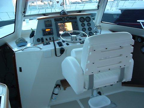 - Center-line flip-up bolster helm seat becomes leaning post or comfortable chair, with smooth acting seat-slide