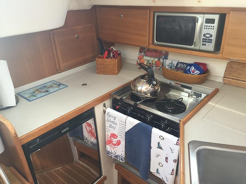 The galley has custom solid surface counter tops and a front-loading stainless steel refrigerator. A top loading, well-insulated icebox can also be used as a refrigerator. Storage is optimized with additional cabinetry and bins.