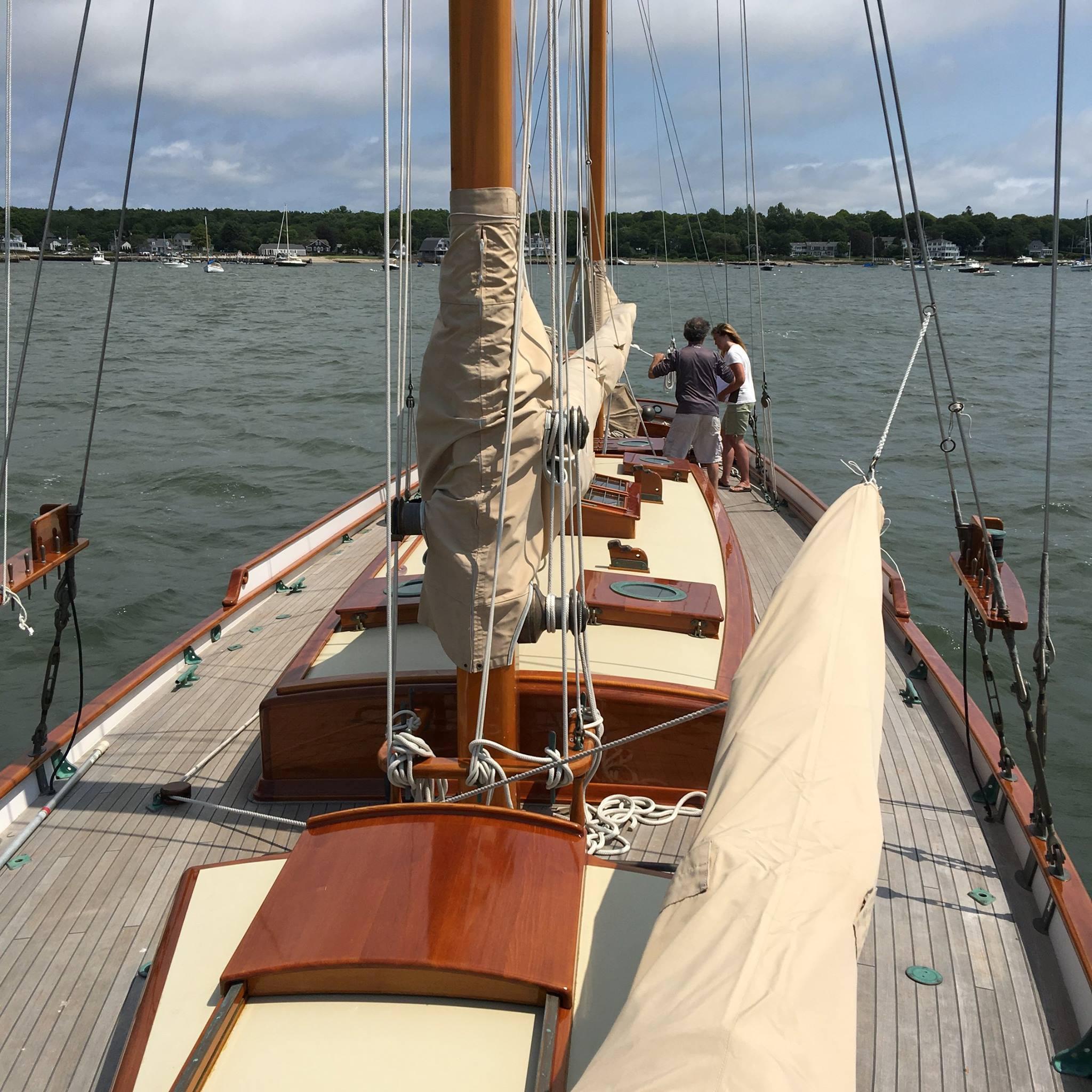In Typical Herreshoff style, the cockpit has a beautiful elliptical shapet with ample seating for a large party for daysailing. Sail/gear lockers Port and Starbord. Beautifully wide side decks provide easy access fore and aft. Thwartship passages between the machinery house and accommodation house. All exterior decking is laid teak, deck houses are solid teak as well. Builder took great pains to replicate all specifications of the original BOUNTY. All hardware was cast as per L. Francis Herreshoff's original drawings by Mystic Valley Foundry. Attention to every small detail was made including matching sail covers, dodger ( to be installed) radar dome, etc.. Hardware was all cast to match original Herresoff designs.