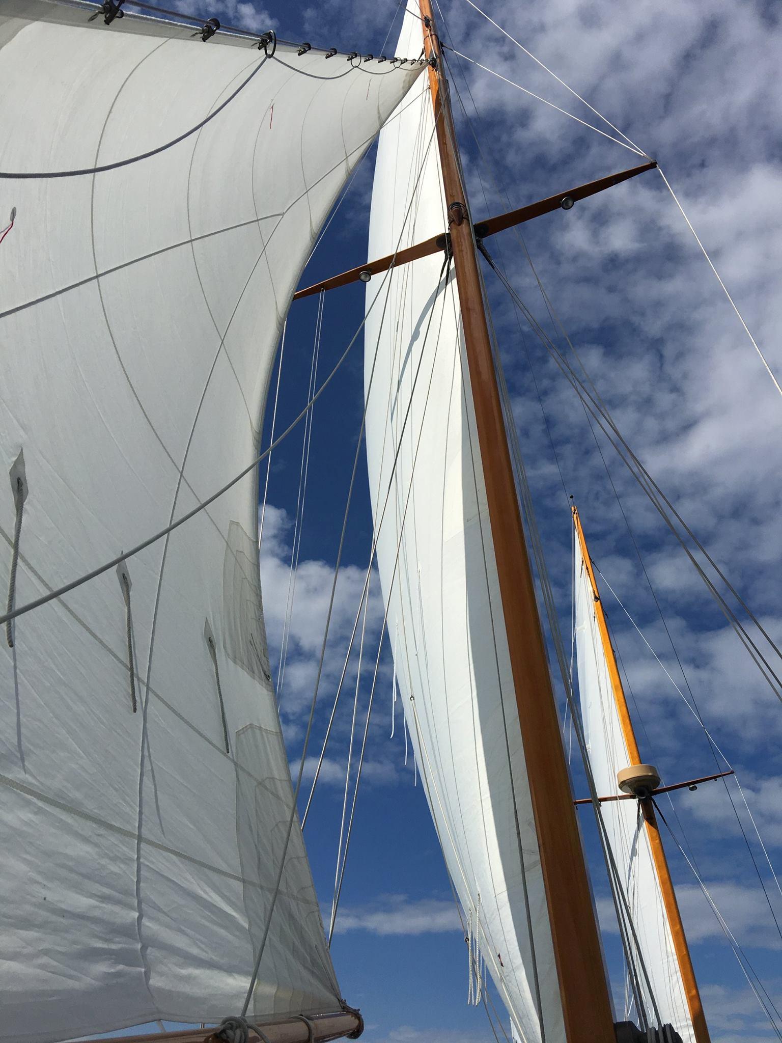 Varnished Sitka Spruce keel stepped spars with 1 X 19 wire rigging.