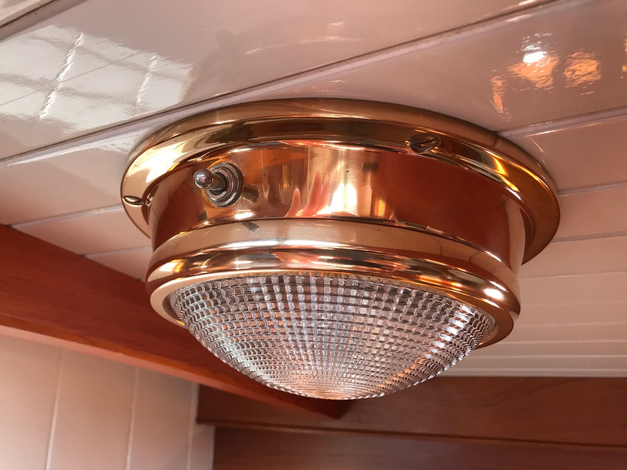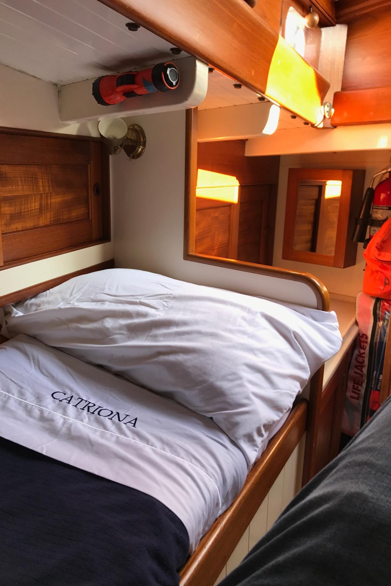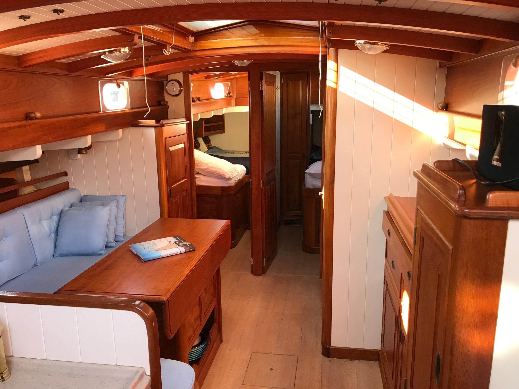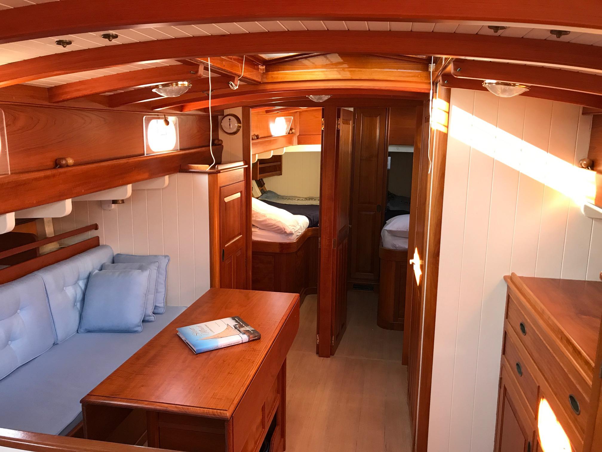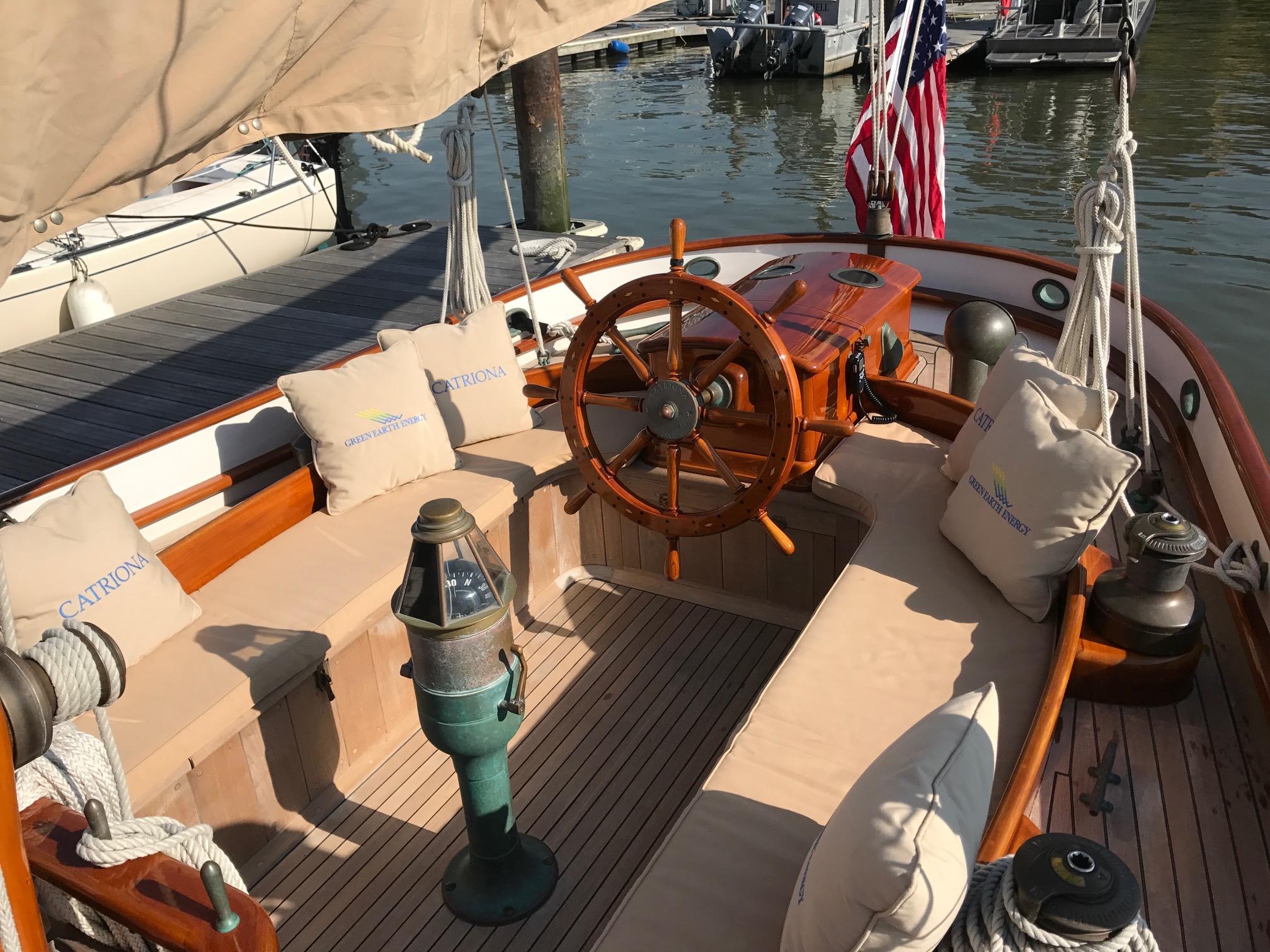 "Catriona" has an old world elegance about her below decks as well as above with simple accommodations in 2 staterooms. An additional crew's quarters is separate and forward of the main salon. The finish is done Herreshoff style with teak sole accented by varnished teak trim on white flat panels . Twelve (12) opening ports in the owner's quarters and four (4) hatches, all with screening bring excellent cross ventilation. An night, lighting is provided by 12 volt reading lamps at all berths and settees and there are a number of overhead dome lamps as well.