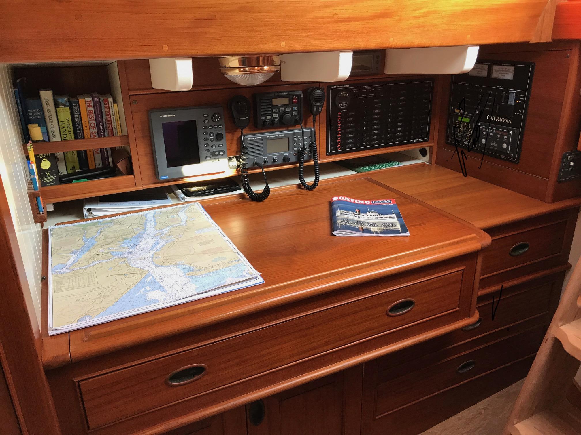 The primary navigation electronics and communications equipment is located at the navigation station at the foot of the companionway with some repeaters carefully housed in varnished teak joiner work, so as to be unobtrusive, in the cockpit.
