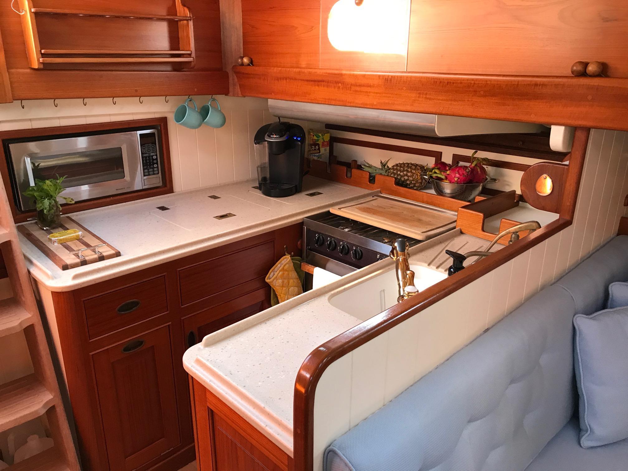 Across from the Nav. Station, to port, is the U shaped Galley where old meets new. The galley has all the amenities one might need for cruising including; Grunert holding plate equipped refrigeration and freezer boxes, Force 10 4 burner gimbaled propane stove with oven and GE Microwave, wide Corian counter tops provide an abundance of work space as well as storage below in 2 drawers and 2 lockers as well as a flip out trash bin and a drop face locker under the stove. Outboard at the head of the U are dish racks.