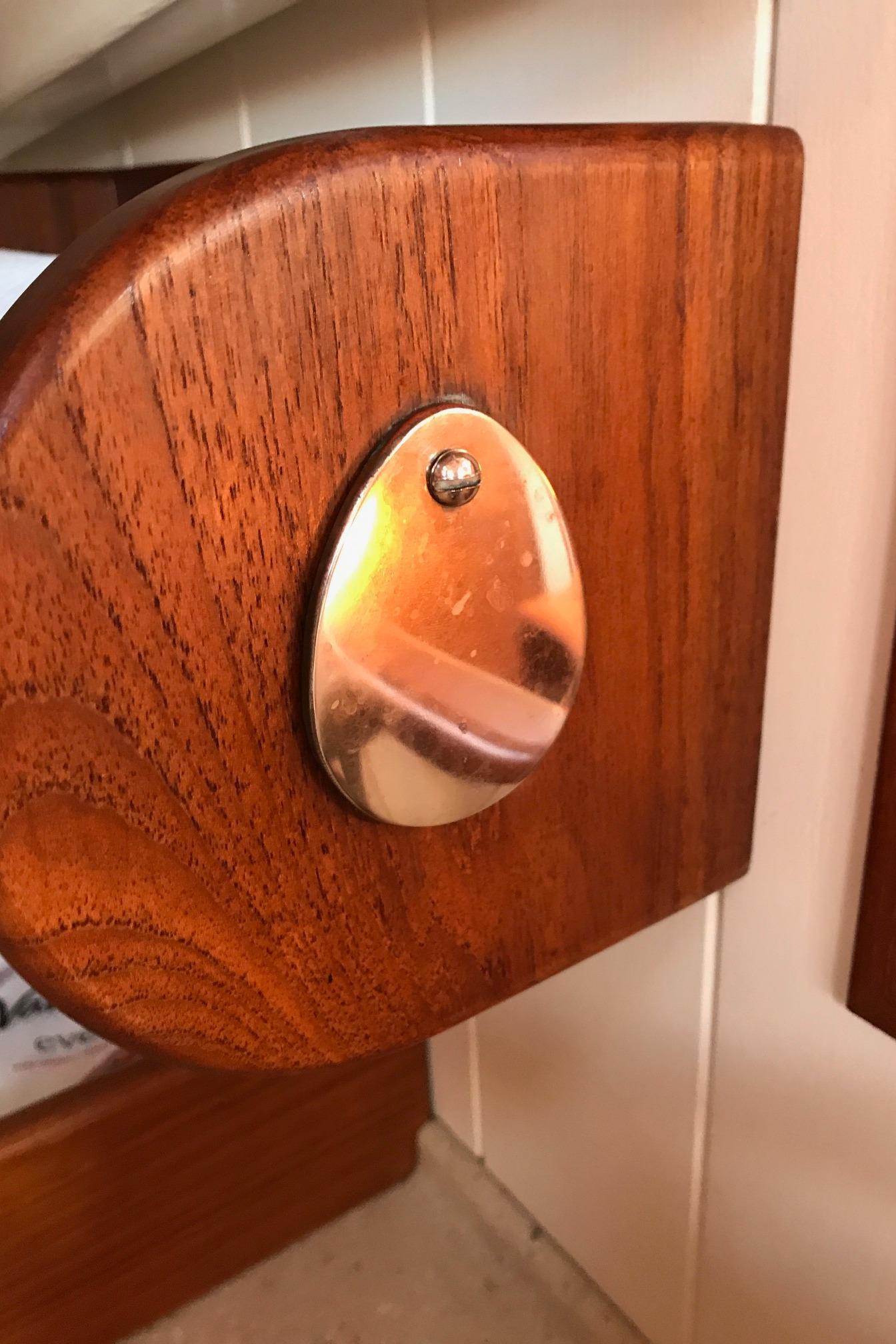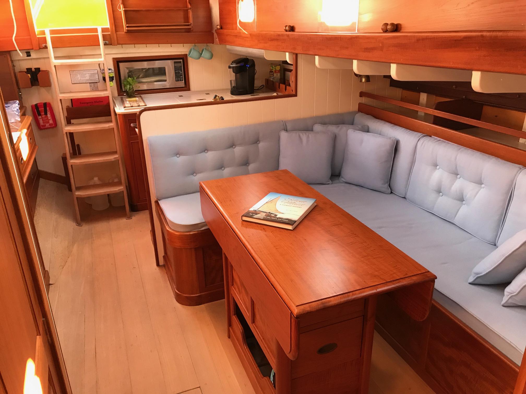 The Main Salon is especially bright and airy. Fwd and to port is a large hanging locker that is deep enough to have shelves outboard. Aft of the hanging locker is an L-Settee with storage behind the settee back and on a shelf with a fiddle above. There is bin type storage under the settee. Dining is from a large varnished teak drop leaf table that has 2 large drawers fitted at each end. Opposite the settee is a bureau with 3 drawers and a locker under and a drop face locker over. Just aft of the bureau is a second hanging locker. Continuing aft on the starboard side is a very generous navigation station. The yacht's electrical distribution panels and navigation equipment are mounted above the flip top chart table. Below the table there is a chart drawer and a storage locker and there are three drawers just aft.