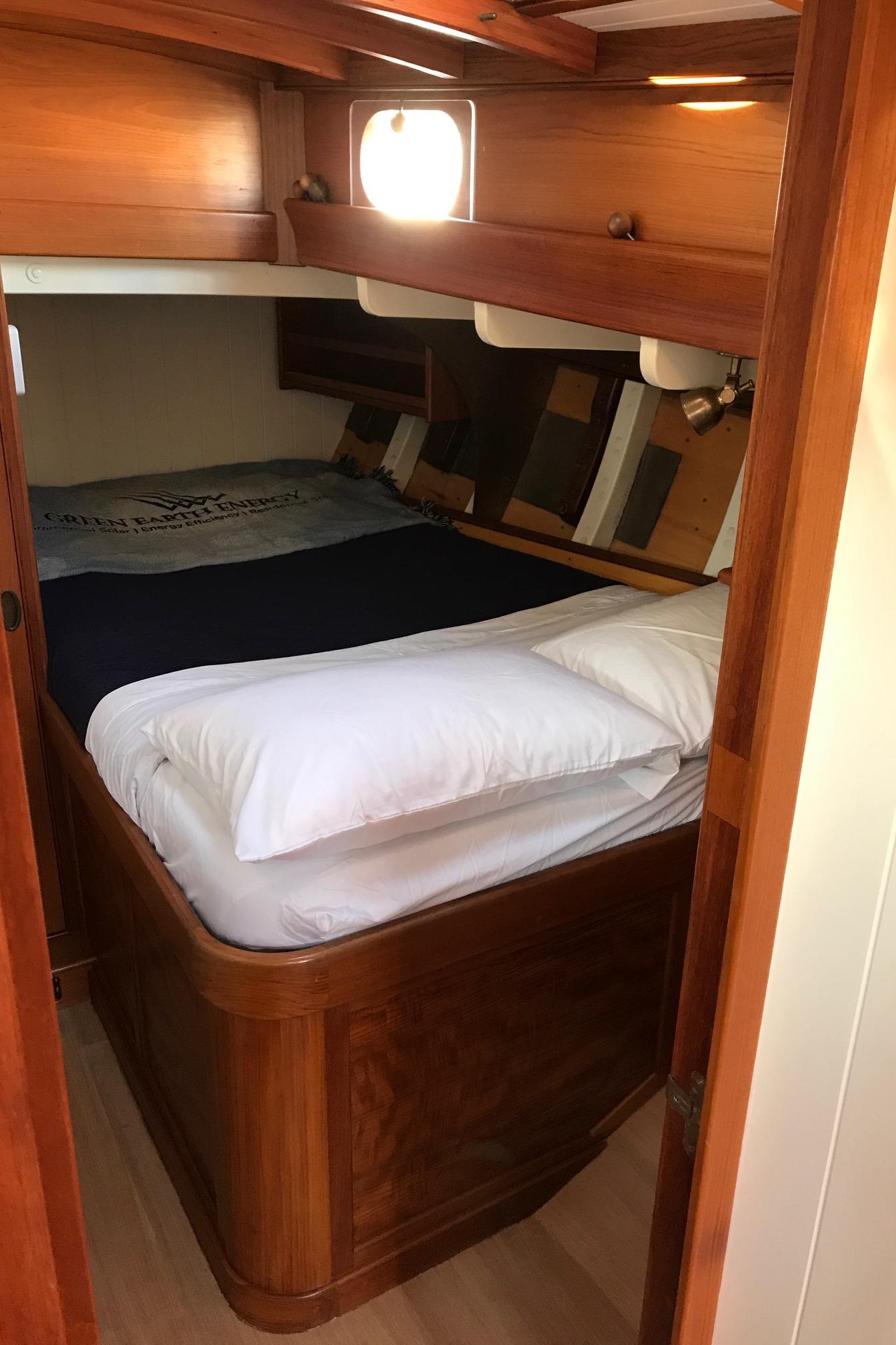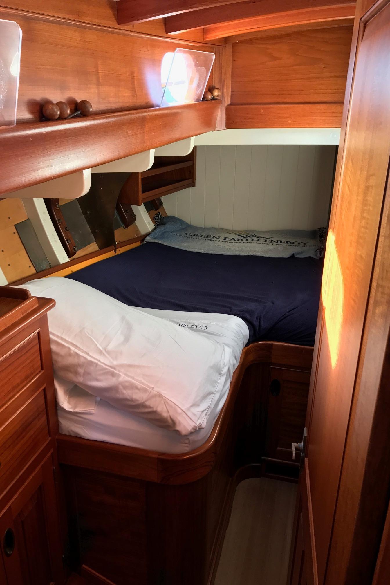 Starting forward in the owner's quarters are spacious owner's and guest staterooms that essentially mirror one another. Generous double berths with some bin type storage and lockers under. Aft of each berth is a bureau with 2 drawers and a locker under. The starboard stateroom has a hanging locker inboard of the berth..