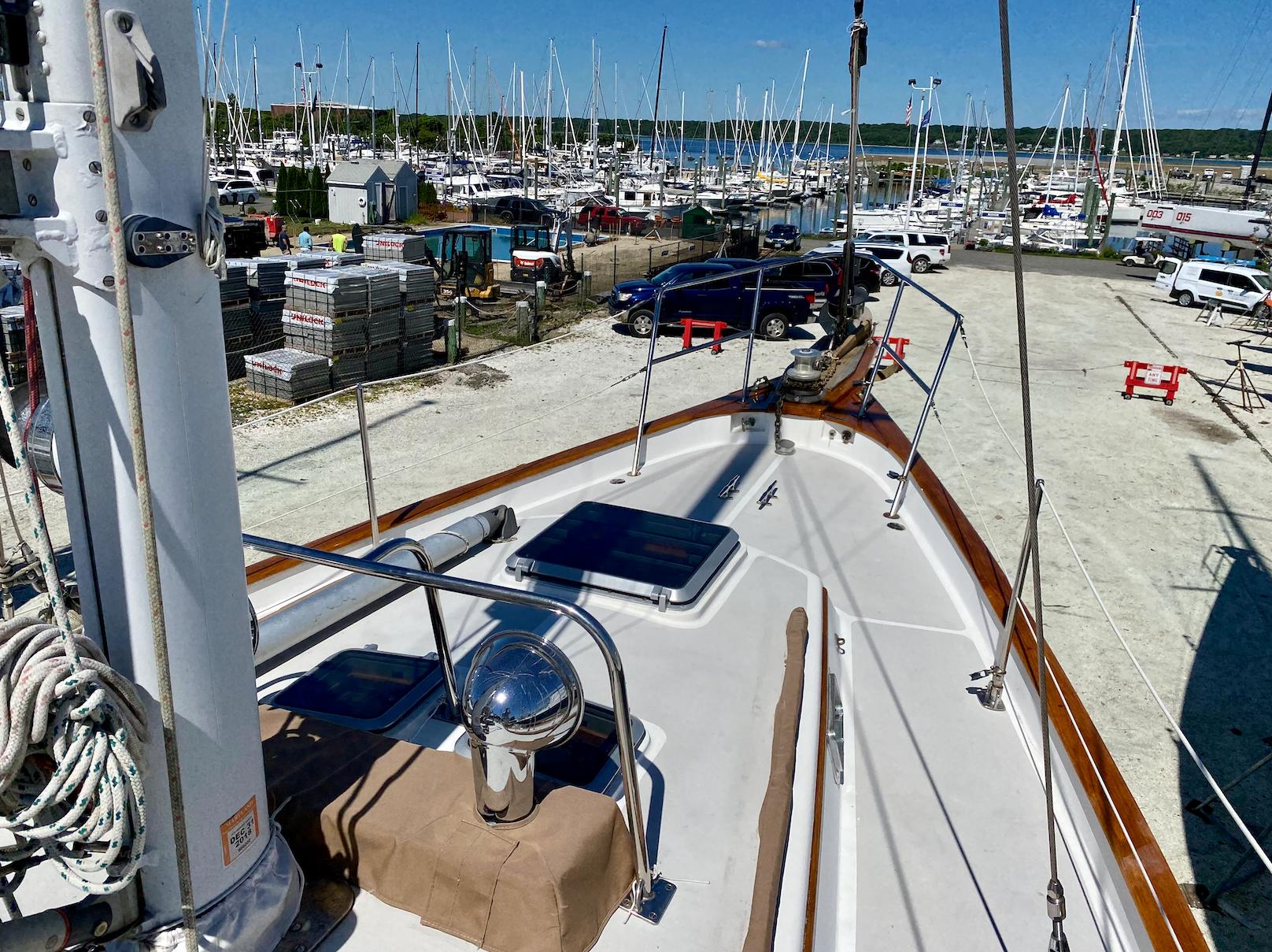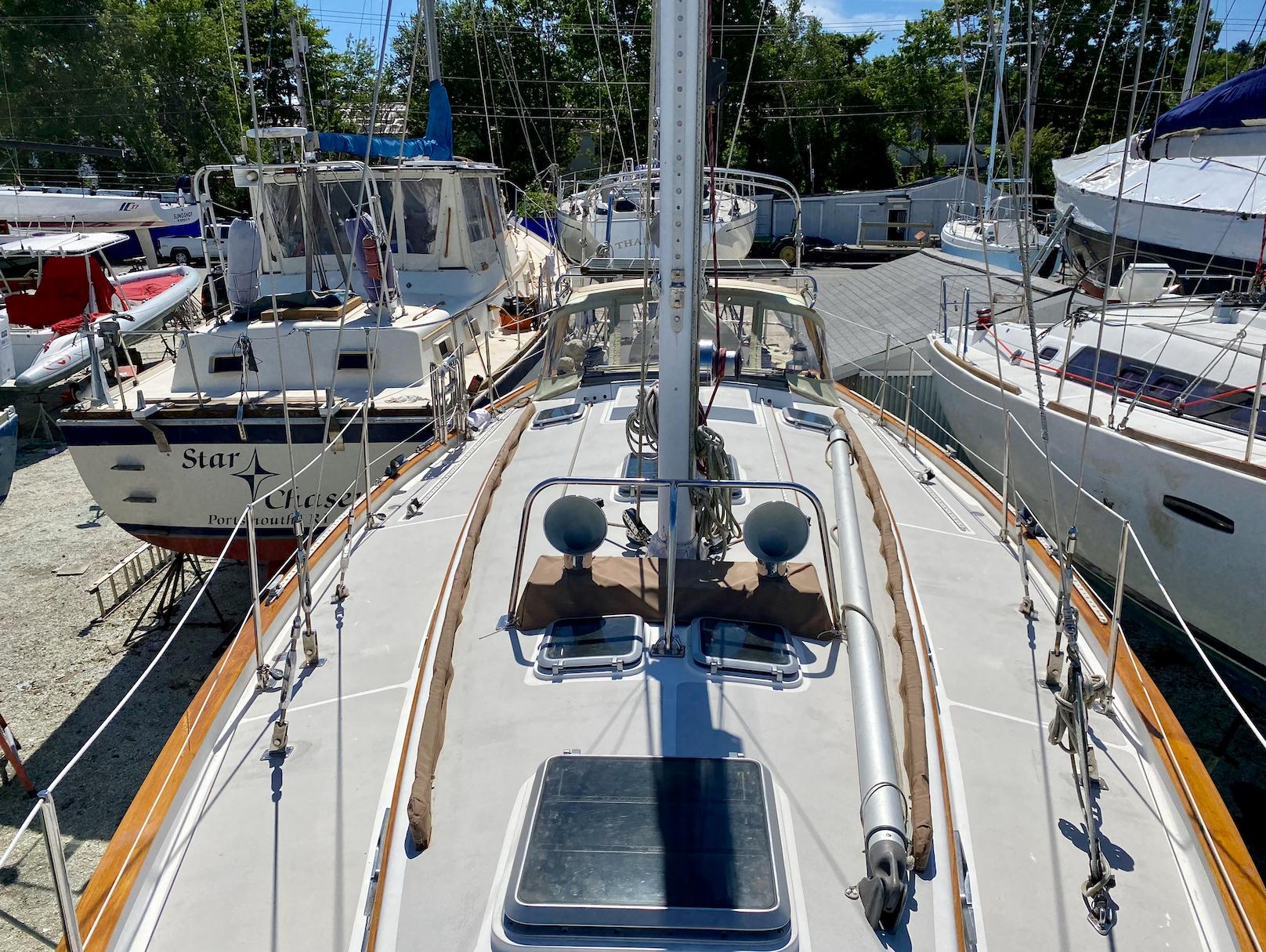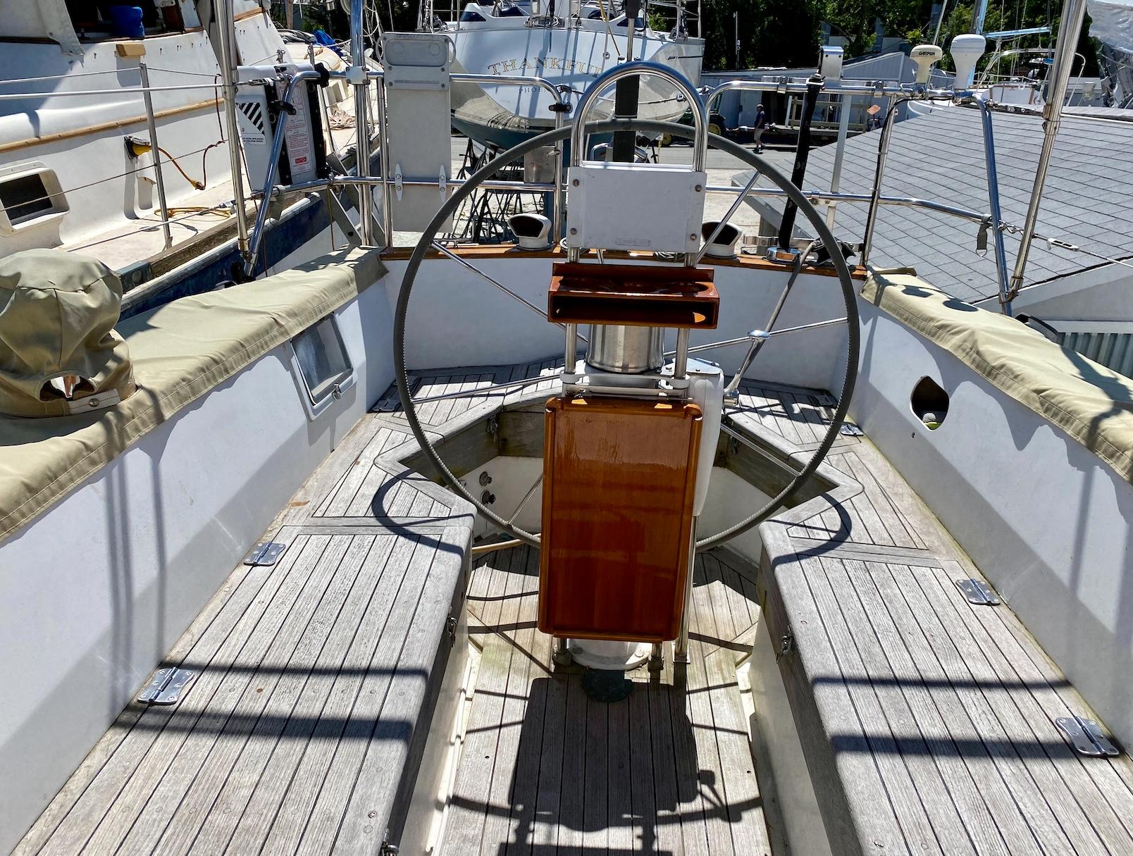 While the Intrepid 40' was a center cockpit sloop, the Robinhood 40' was designed with an aft cockpit. Working with Cape Dory's in-house designers and her original owner Dick Wolfe, who commissioned her construction, Chuck Paine raised the mast (adding more power) and moved the jib stay forward (reducing weather helm). The result was a more robust rig, an important enhancement for Wolfe, who planned to race the boat. Wolfe commissioned an in-depth analysis of sail performance by a well-known Annapolis firm, Design Systems & Services Inc, who projected speeds at varying wind velocities and points of sail, as well as the sloops righting moment. Testimonies from those who sailed her early on, including under spinnaker, conveyed the excitement of her lively performance. She points well and flies on a reach. At the same time, with the destroyer wheel and skeg-hung rudder, my wife and I have found the helm a joy to handle, even in a big blow.