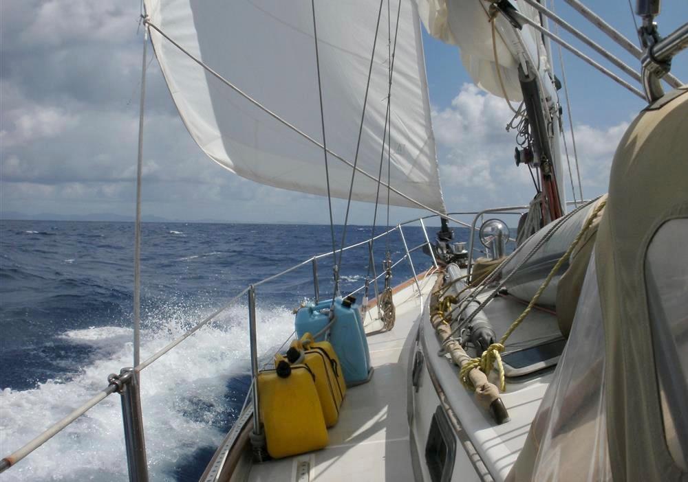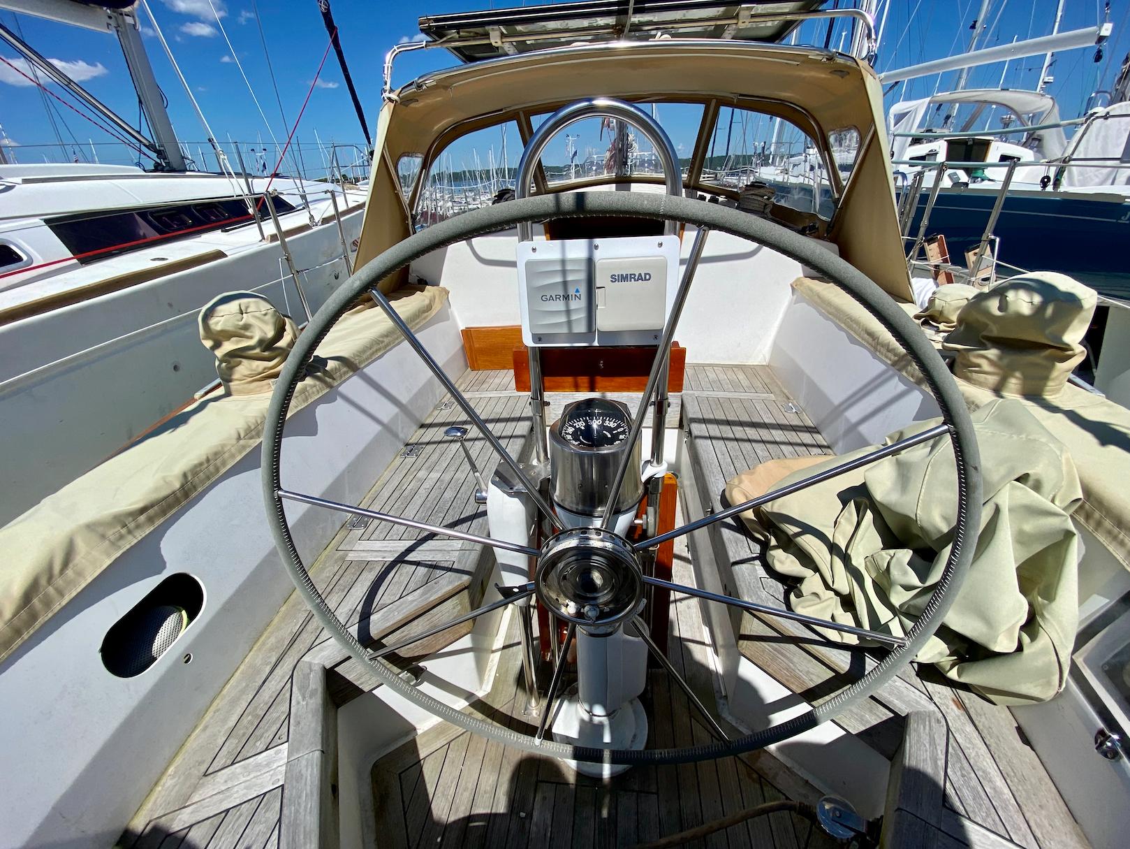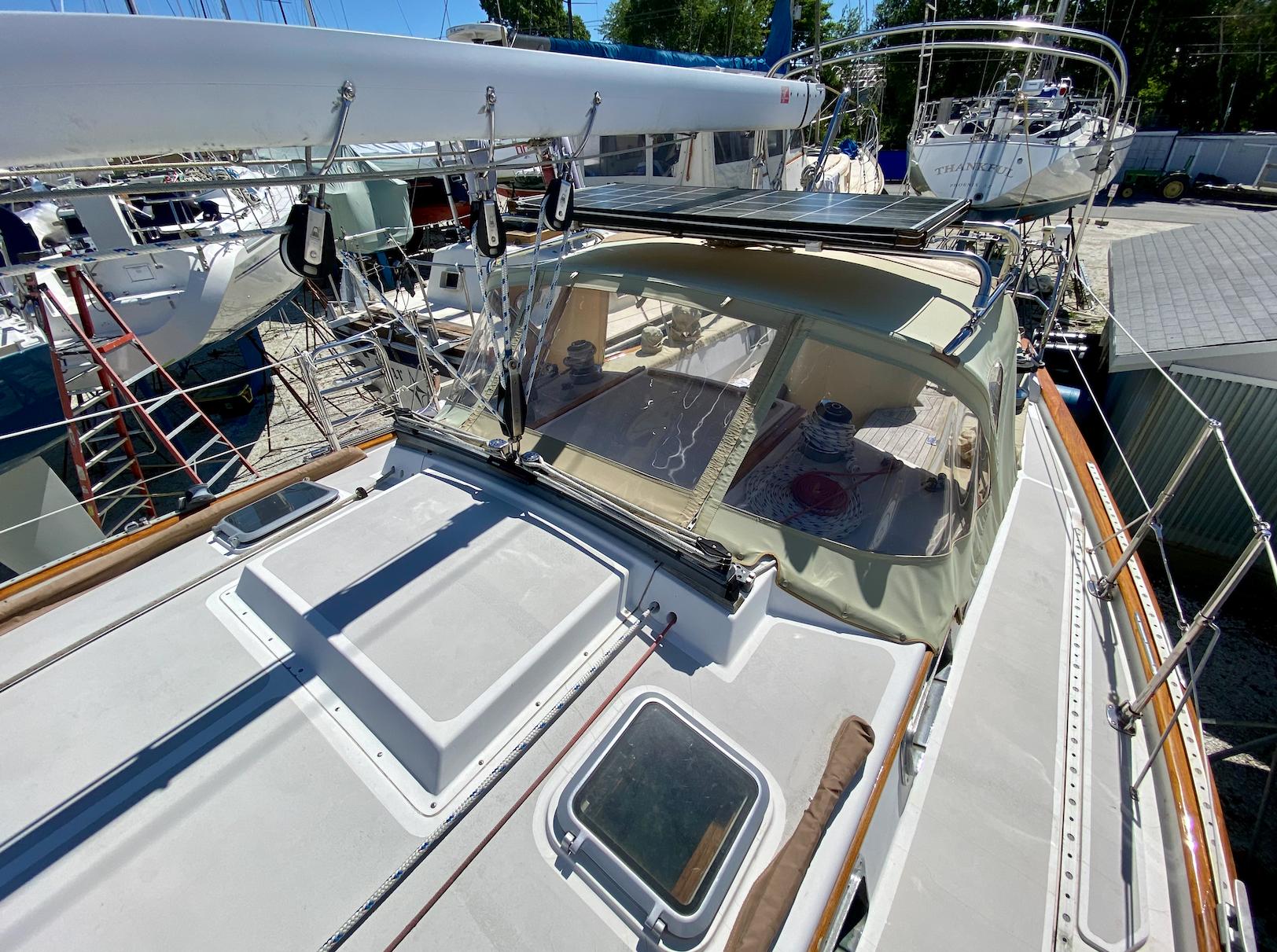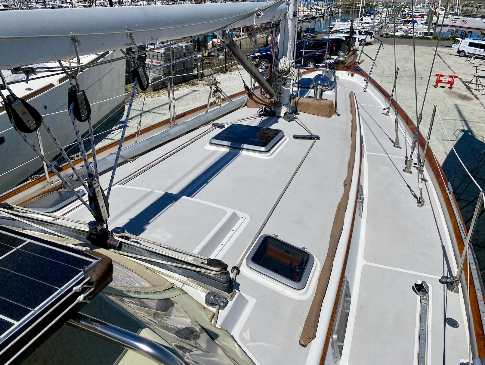 While the Intrepid 40' was a center cockpit sloop, the Robinhood 40' was designed with an aft cockpit. Working with Cape Dory's in-house designers and her original owner Dick Wolfe, who commissioned her construction, Chuck Paine raised the mast (adding more power) and moved the jib stay forward (reducing weather helm). The result was a more robust rig, an important enhancement for Wolfe, who planned to race the boat. Wolfe commissioned an in-depth analysis of sail performance by a well-known Annapolis firm, Design Systems & Services Inc, who projected speeds at varying wind velocities and points of sail, as well as the sloops righting moment. Testimonies from those who sailed her early on, including under spinnaker, conveyed the excitement of her lively performance. She points well and flies on a reach. At the same time, with the destroyer wheel and skeg-hung rudder, my wife and I have found the helm a joy to handle, even in a big blow.