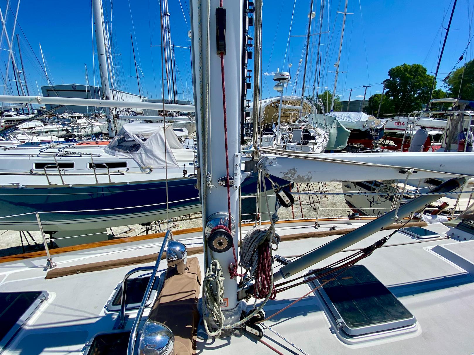 - Hall Spars double-spreading aluminum mast in white (keel stepped)