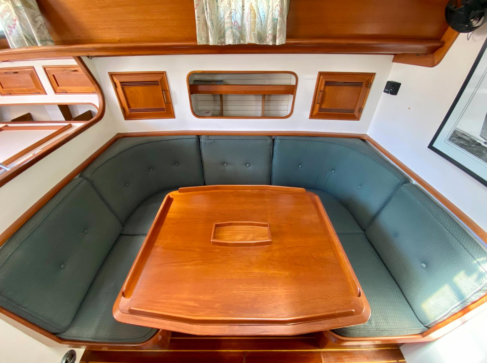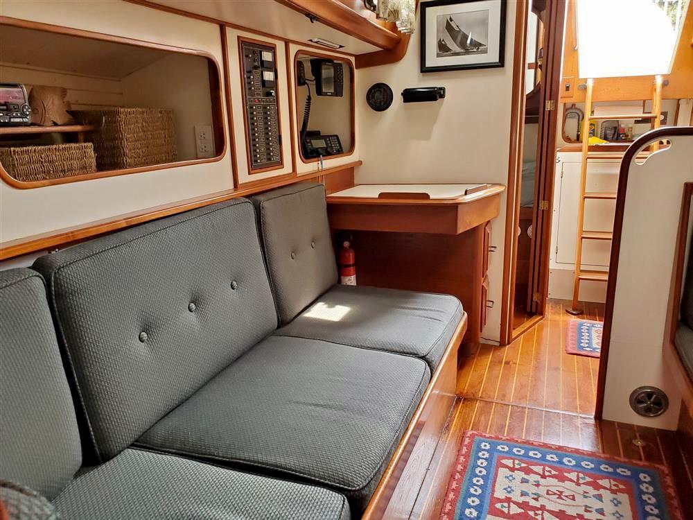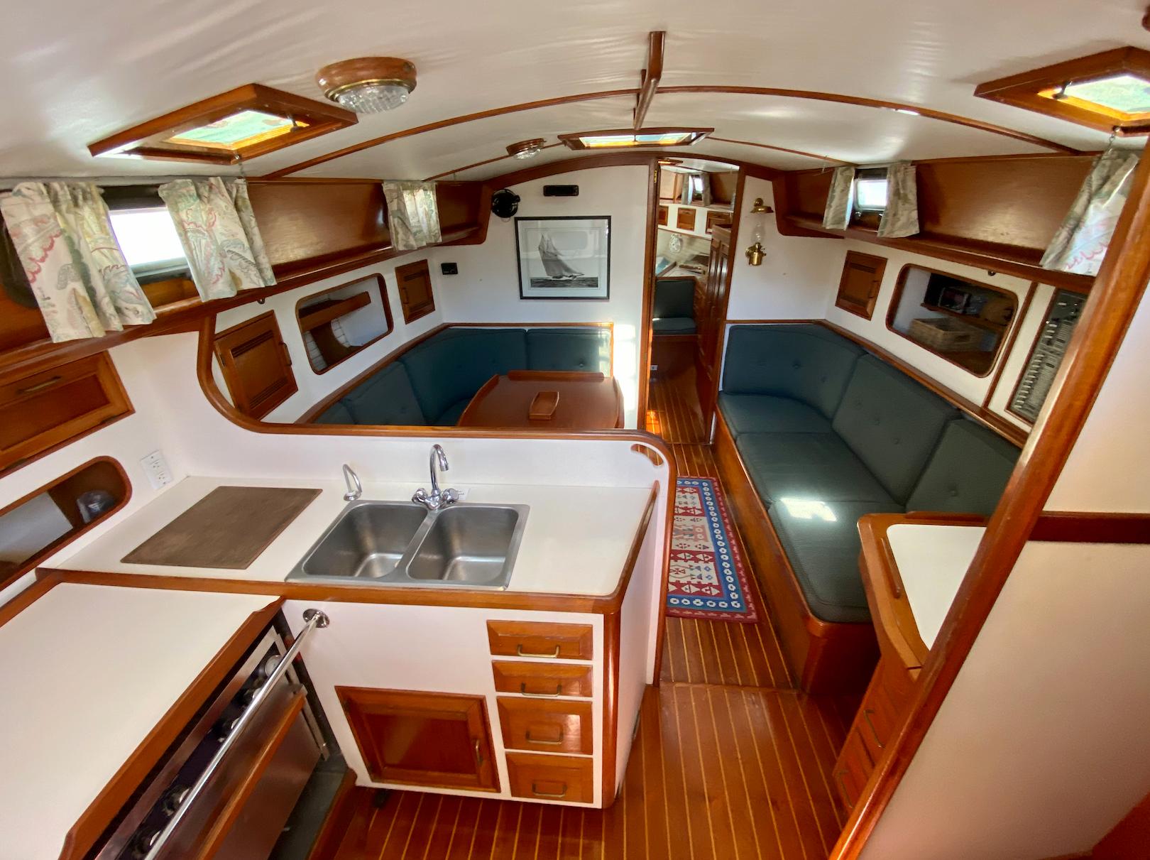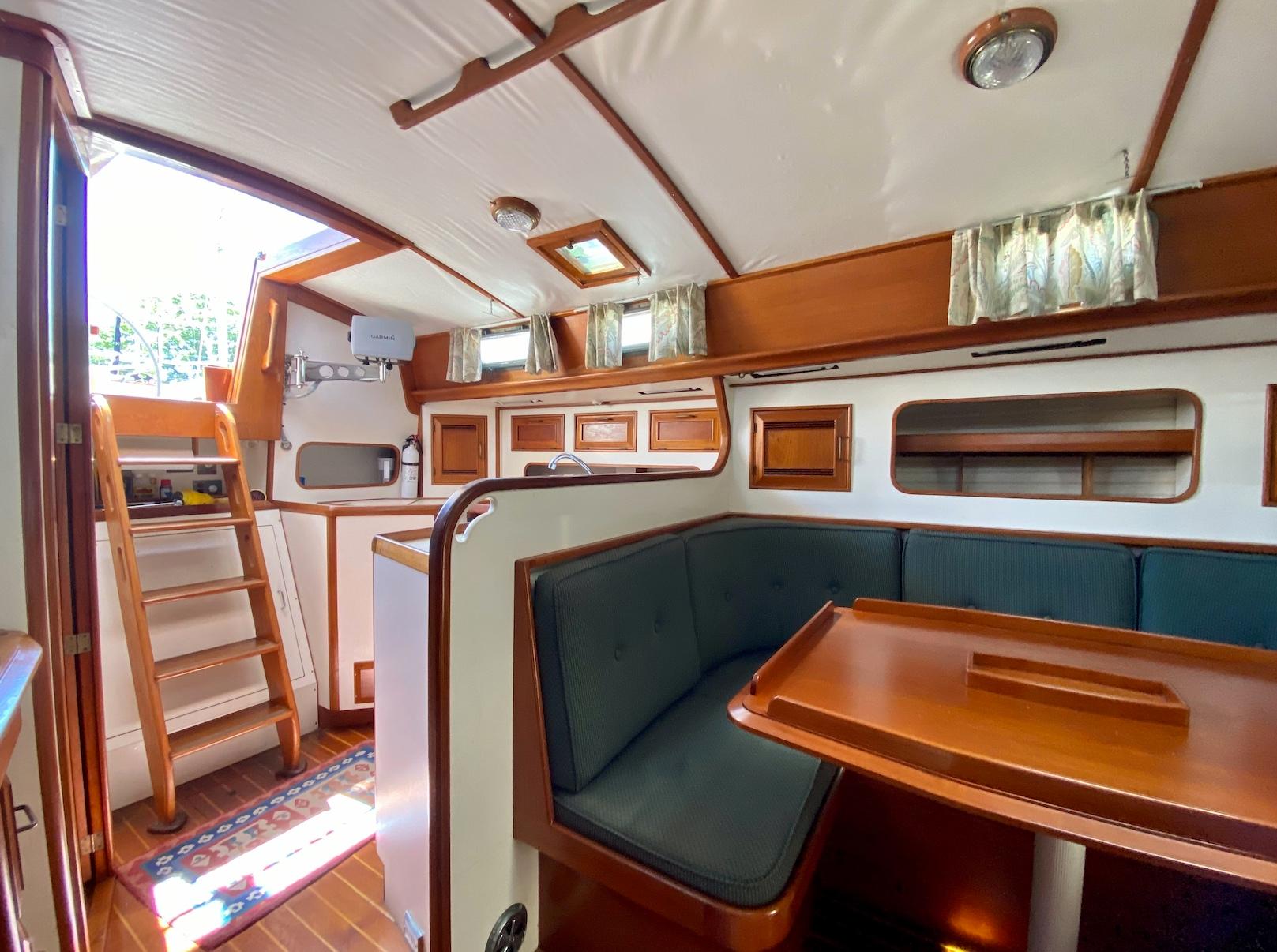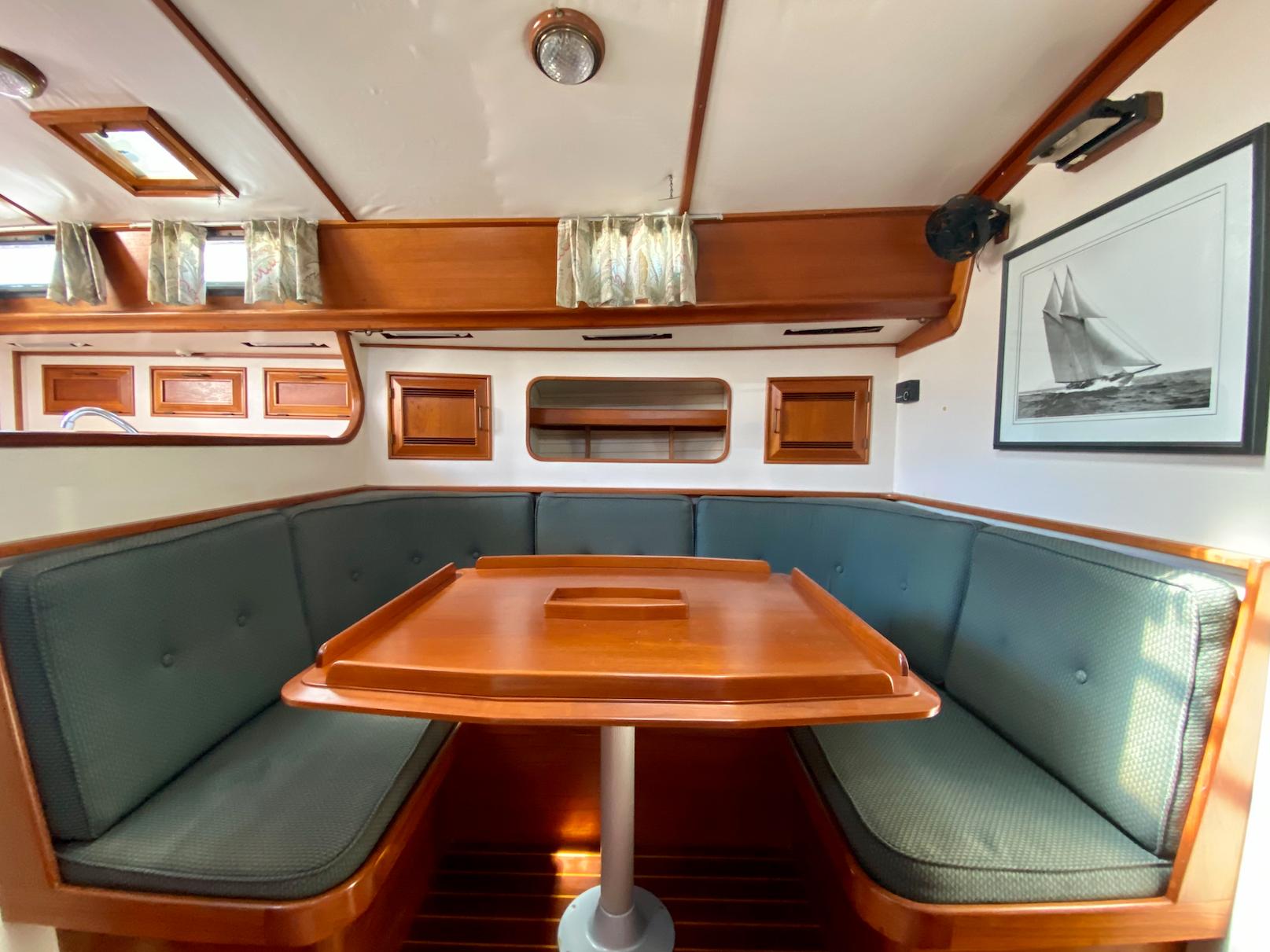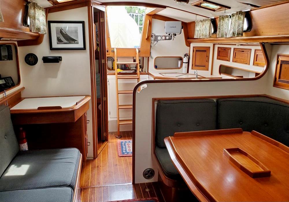 The interior of the Robinhood 40' provides a spacious and practical layout for the cruising couple with occasional guests. The owner's stateroom is forward and offers a generous berth (5ftW x 7ftL) to port with an abundance of storage and hanging locker space. The entire cabin can be closed off with private access to the head. The main cabin features a U-shaped dinette to port with a long settee to starboard. The navigation station is to starboard and has a large recessed area for electronics and gear. The aft-facing nav table is generous with drawers and storage below. The enclosed aft-cabin provides privacy and good storage areas with plenty of ventilation. Large L-shaped galley to port.