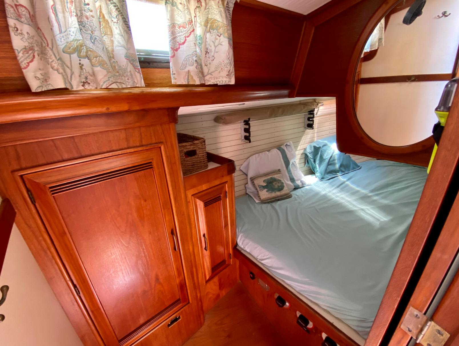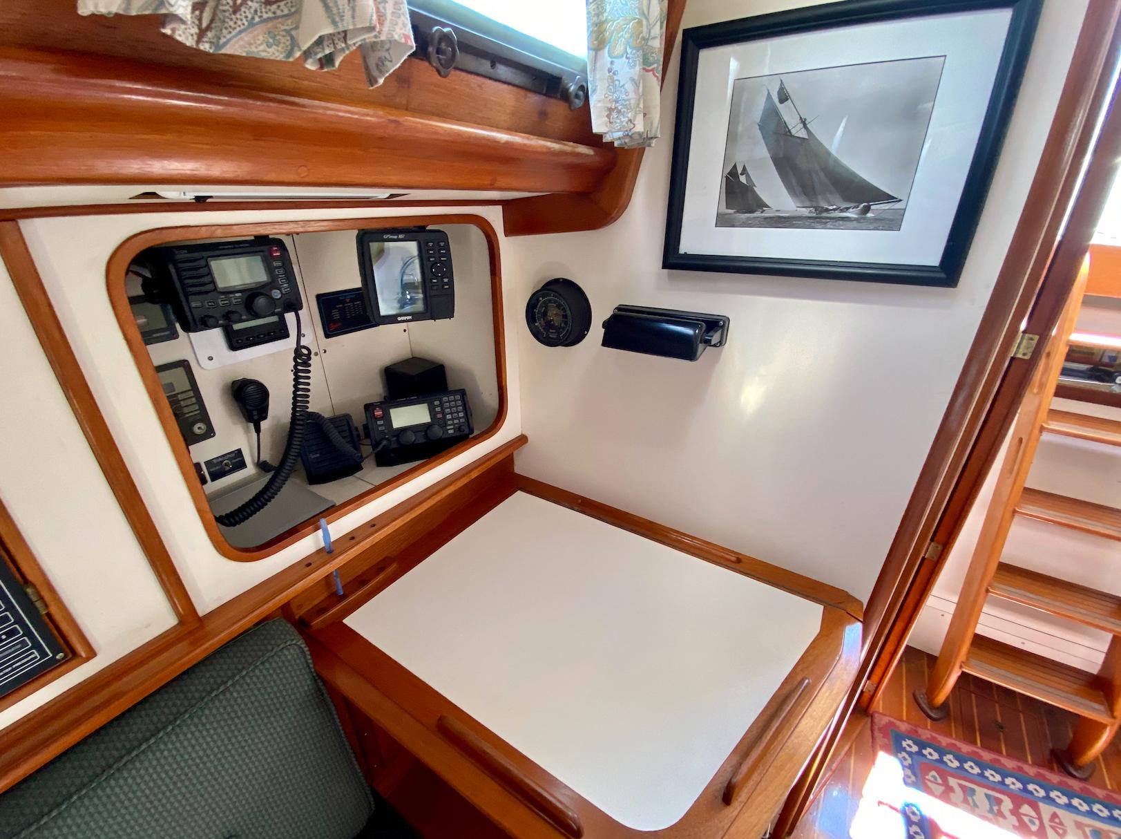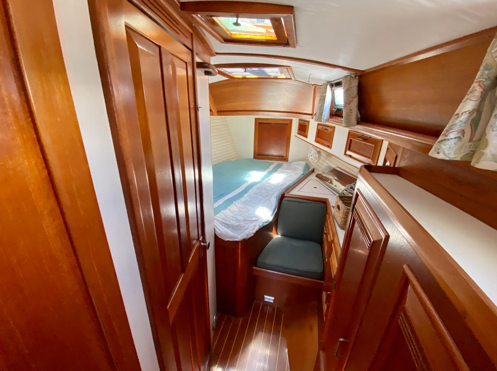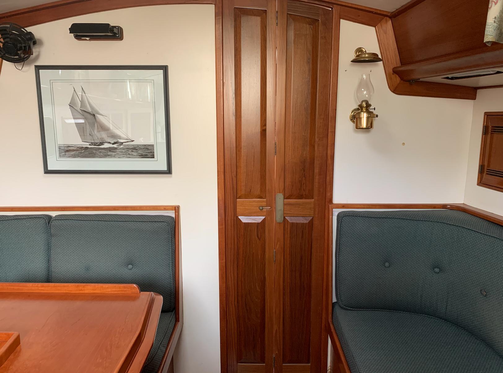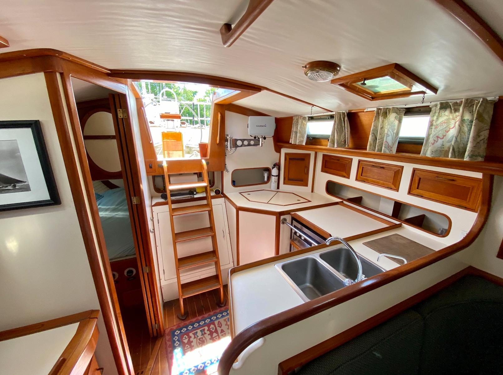 The interior of the Robinhood 40' provides a spacious and practical layout for the cruising couple with occasional guests. The owner's stateroom is forward and offers a generous berth (5ftW x 7ftL) to port with an abundance of storage and hanging locker space. The entire cabin can be closed off with private access to the head. The main cabin features a U-shaped dinette to port with a long settee to starboard. The navigation station is to starboard and has a large recessed area for electronics and gear. The aft-facing nav table is generous with drawers and storage below. The enclosed aft-cabin provides privacy and good storage areas with plenty of ventilation. Large L-shaped galley to port.