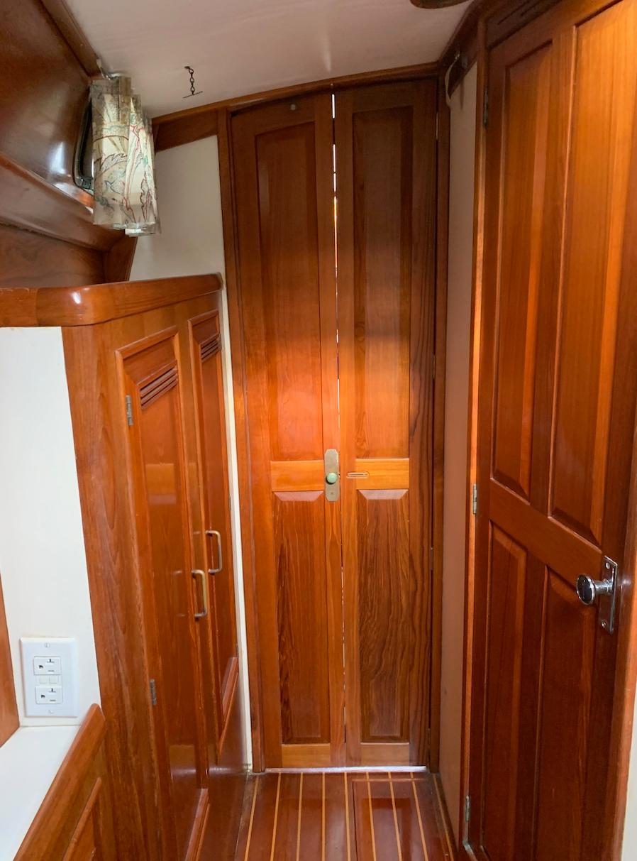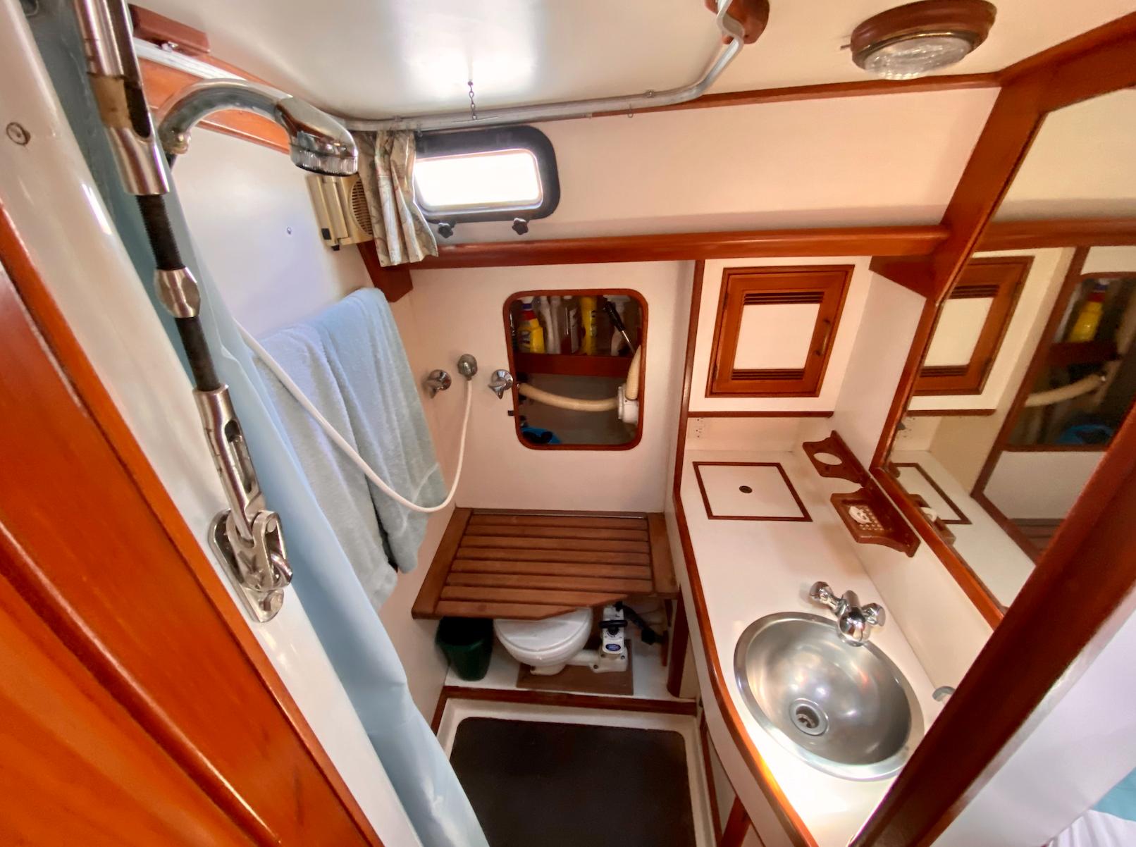 In addition to her design as a spirited performance cruiser, Moonrise also benefited from the craftsmanship of the Maine boatbuilders who fashioned her. While the hull was laid up at the Cape Dory yard in East Taunton, MA, final construction took place at Robinhood, with fine teak joinery and top-flight installation of all plumbing and electrical systems, including bonded bronze sea-cocks, screened hatches and portlights, and many other details too numerous to list here. Apparently, because Wolfe, the original owner, was a very tall man, the cabin offers extra headroom. The result of Chuck Paine's design and Robinhood's craftsmanship is an open and airy cabin, something that sold us on the boat since we planned to live aboard and cruise extensively. I don't think it's hyperbole to place the Robinhood 40' in a class with Morris and Hinckley yachts, though much less expensive.