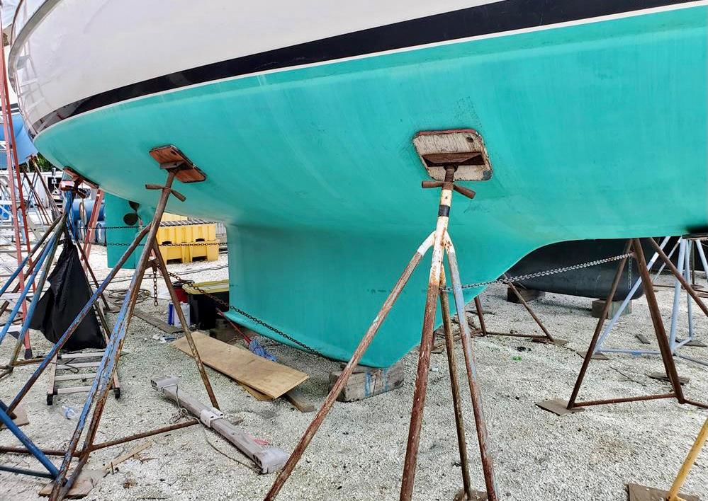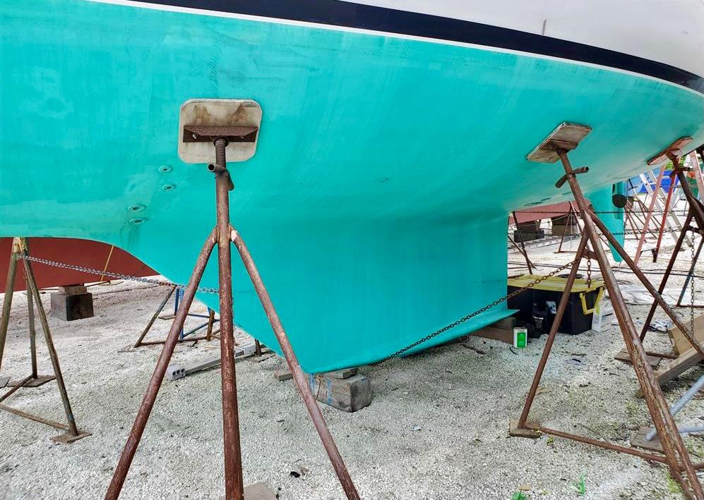 Hull is molded using IsoNpg gel coat, vinylester resins, high strength non-woven bi-axial fiberglass fabrics, and Airex core. Internal bulkheads are fiberglass bonded to the hull. "Paine" keel is full design- poured lead, with a flared foot bolted to the keel sump with (14) 3/4 inch stainless steel bolts. Skeg-hung rudder is supported by a solid bronze shoe. The prop is mounted in a skeg aperture. Raised bulwarks on deck with 28" high stanchions. Molded rub rail with a stainless striker. Varnished teak pulpit with stainless steel strut. Stainless steel bow and stern pulpits with double-through lifelines.