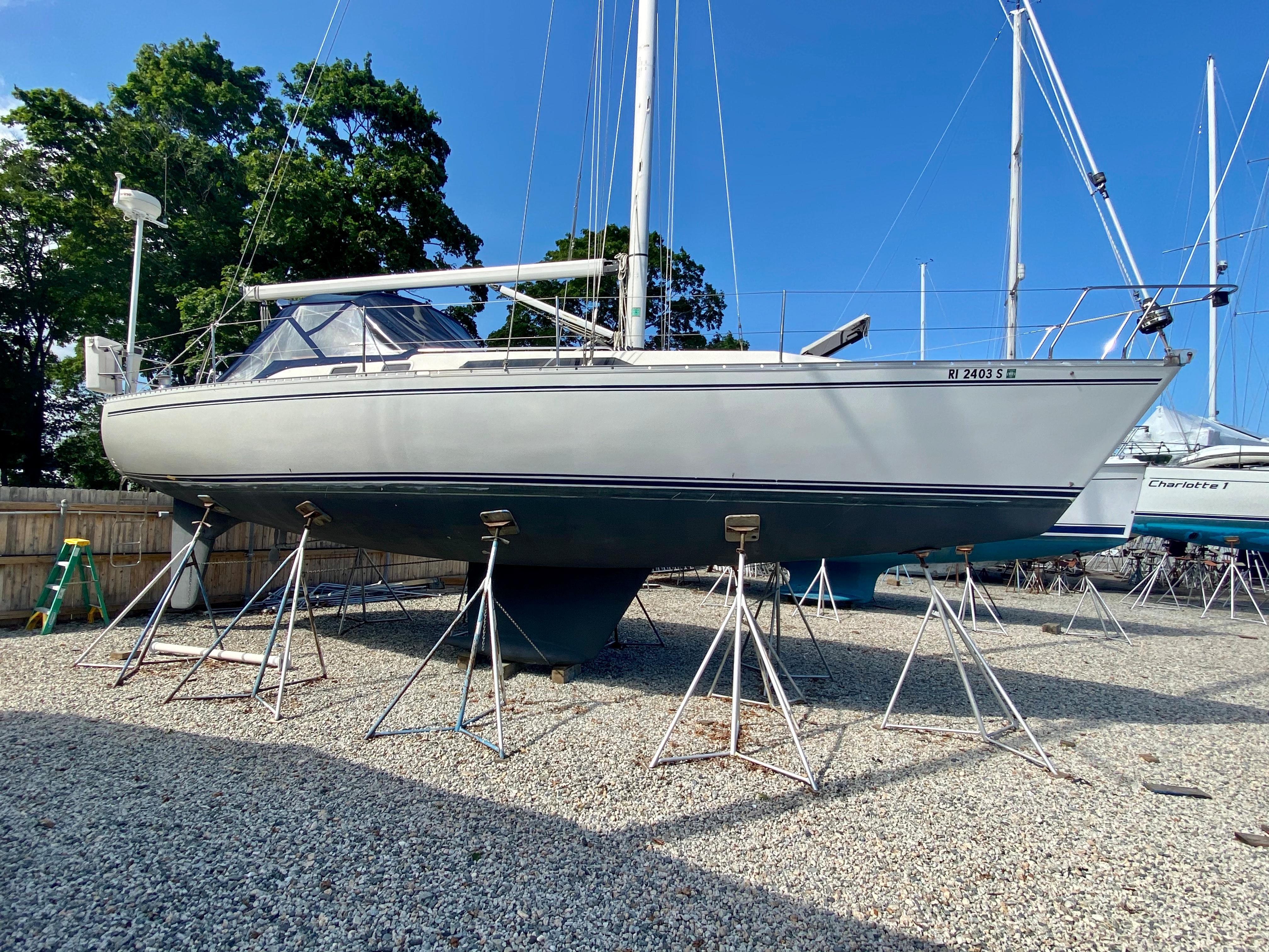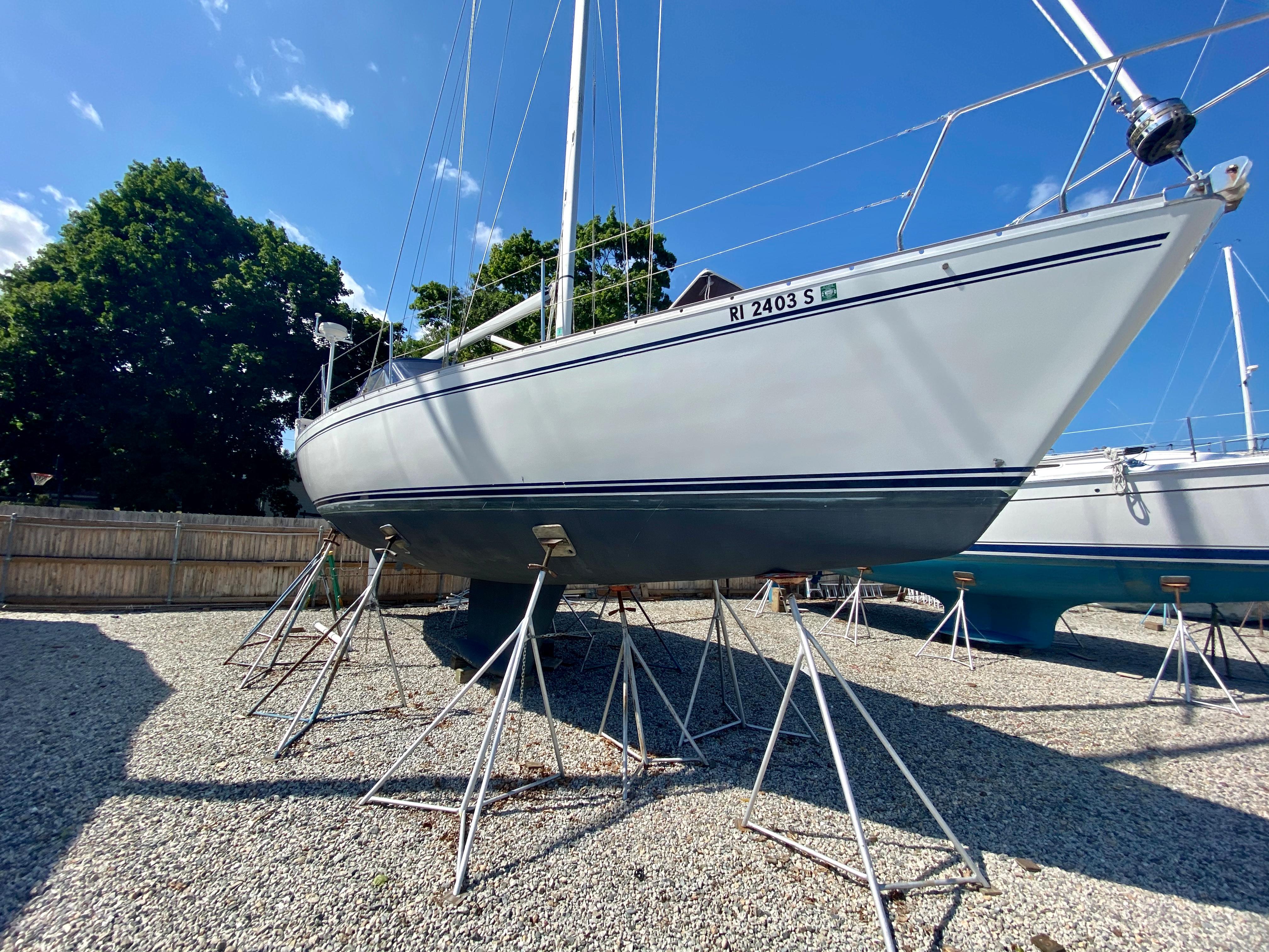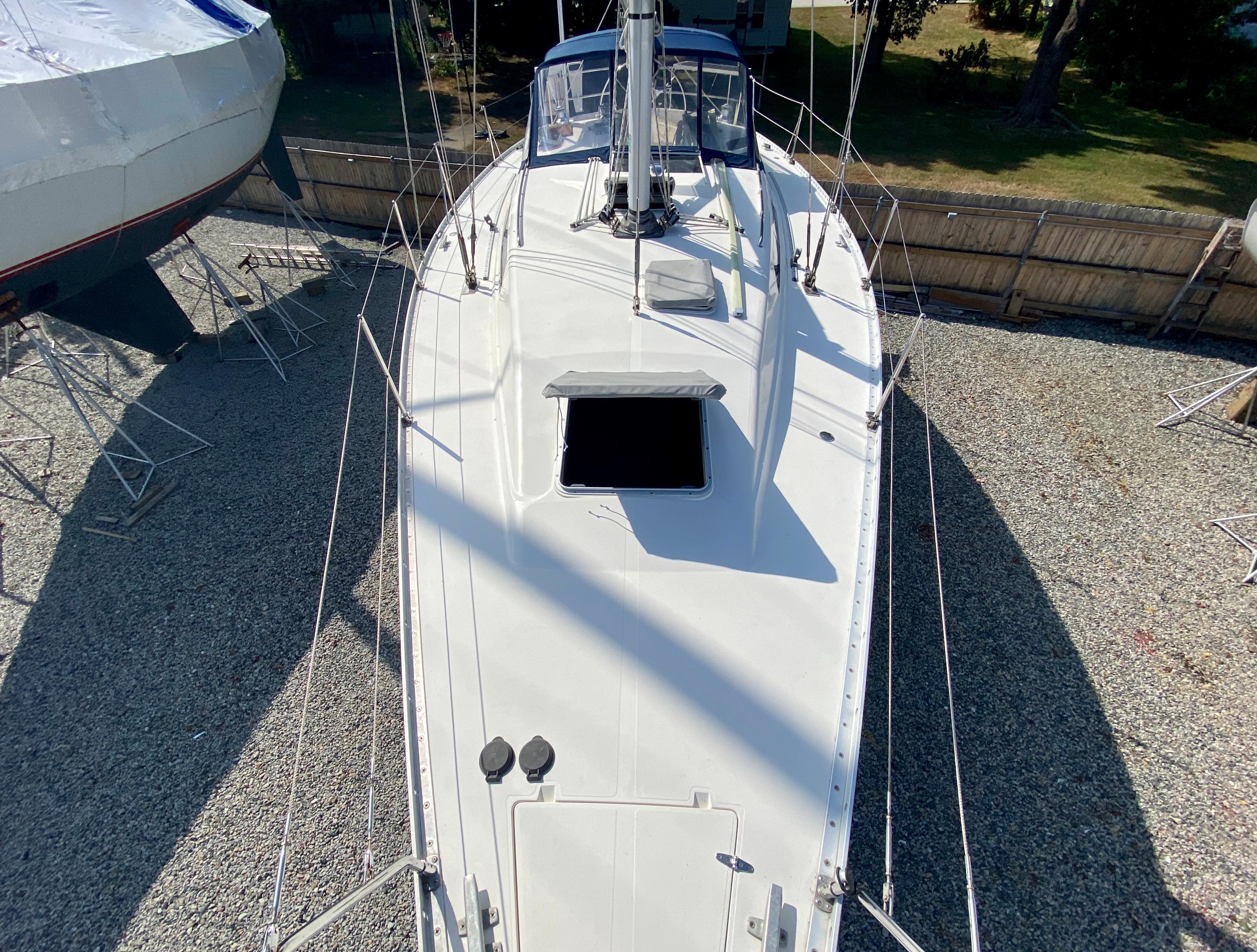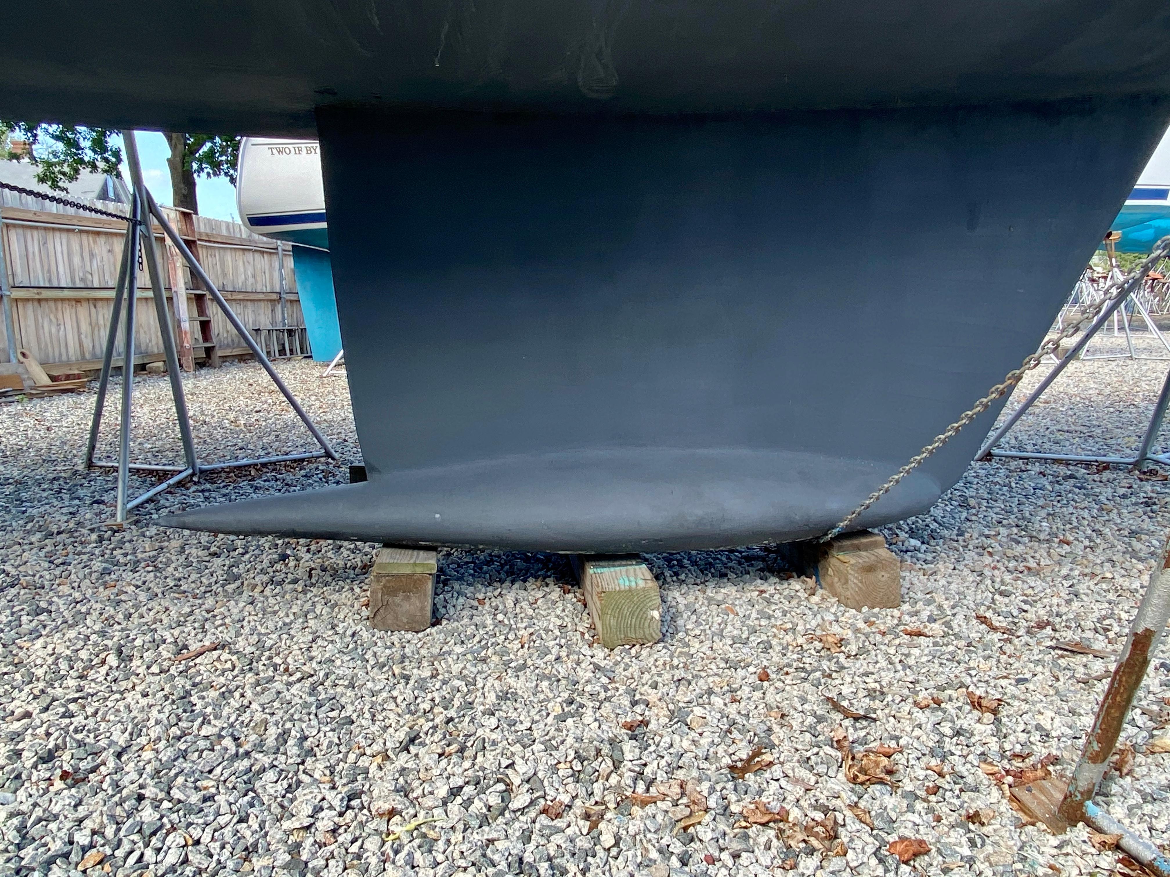 Solid glass below the waterline and core cell construction above. Mars shoal drafted lead poured bulb keel. FRP skinned partial skeg-hung rudder w/ stainless steel rudder stock. Aluminum toe rail fitted 360°, white decks with contrasting white diamond non-skid patterned areas.