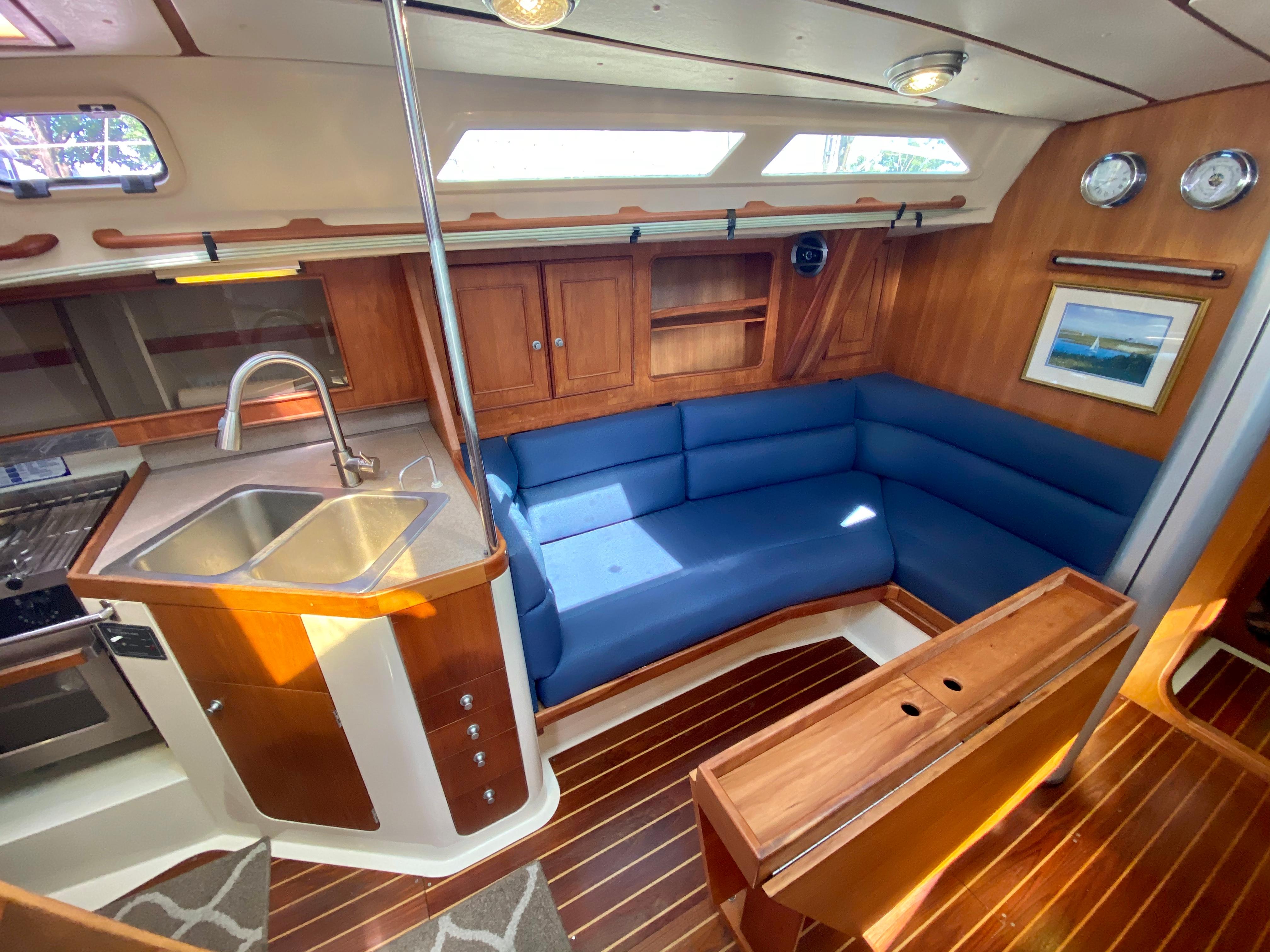 In the main saloon, space is utilized to the maximum, with settees to port & starboard providing additional berths if needed. The large drop leafed table provides dining for up to 6.