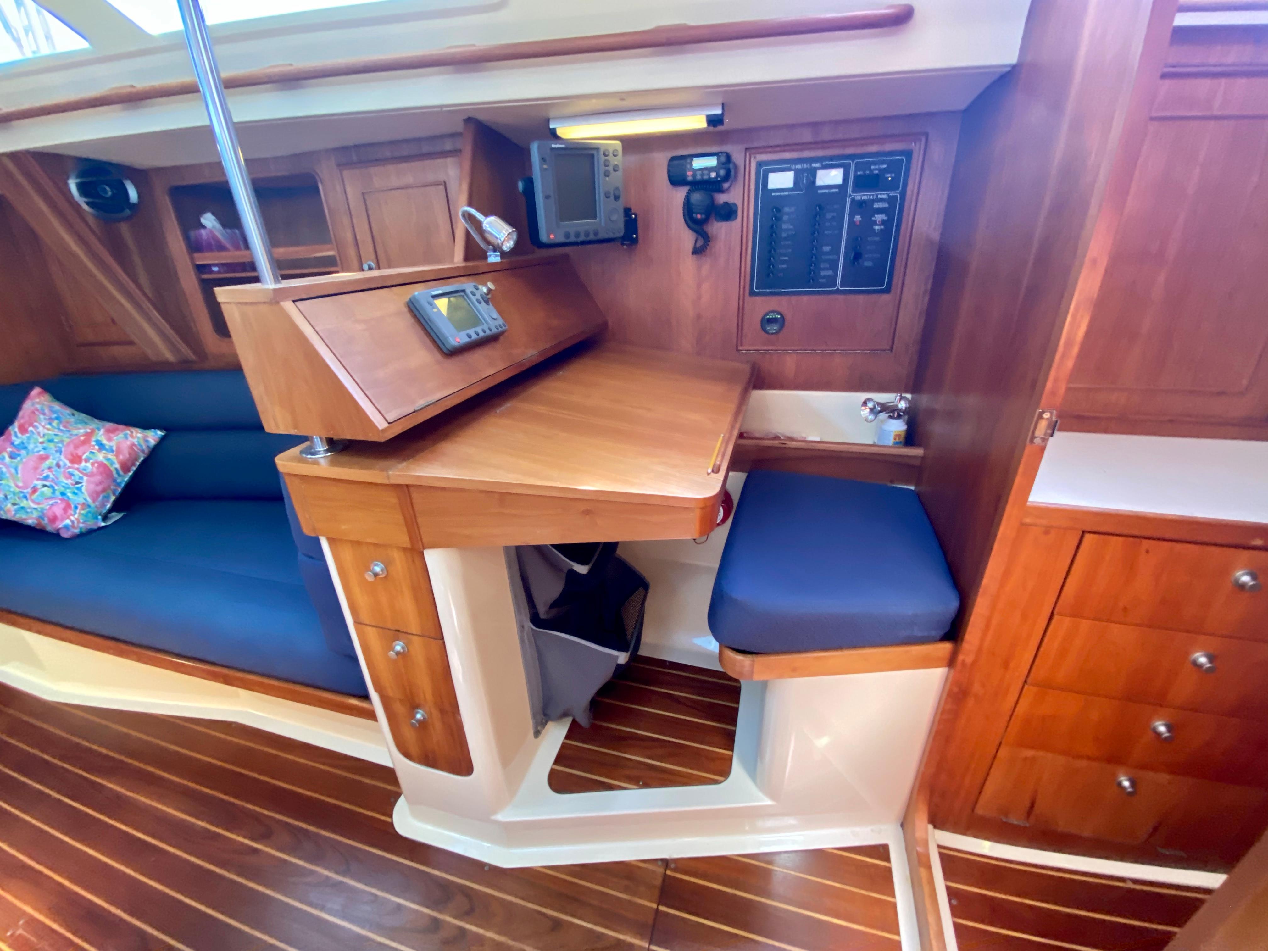 The forward-facing navigation station area has ample space for chartwork and storage for miscellaneous items. The galley is fully fitted tucked well away from the main living area, which allows the cook to prepare meals with equal case whether at anchor or underway.