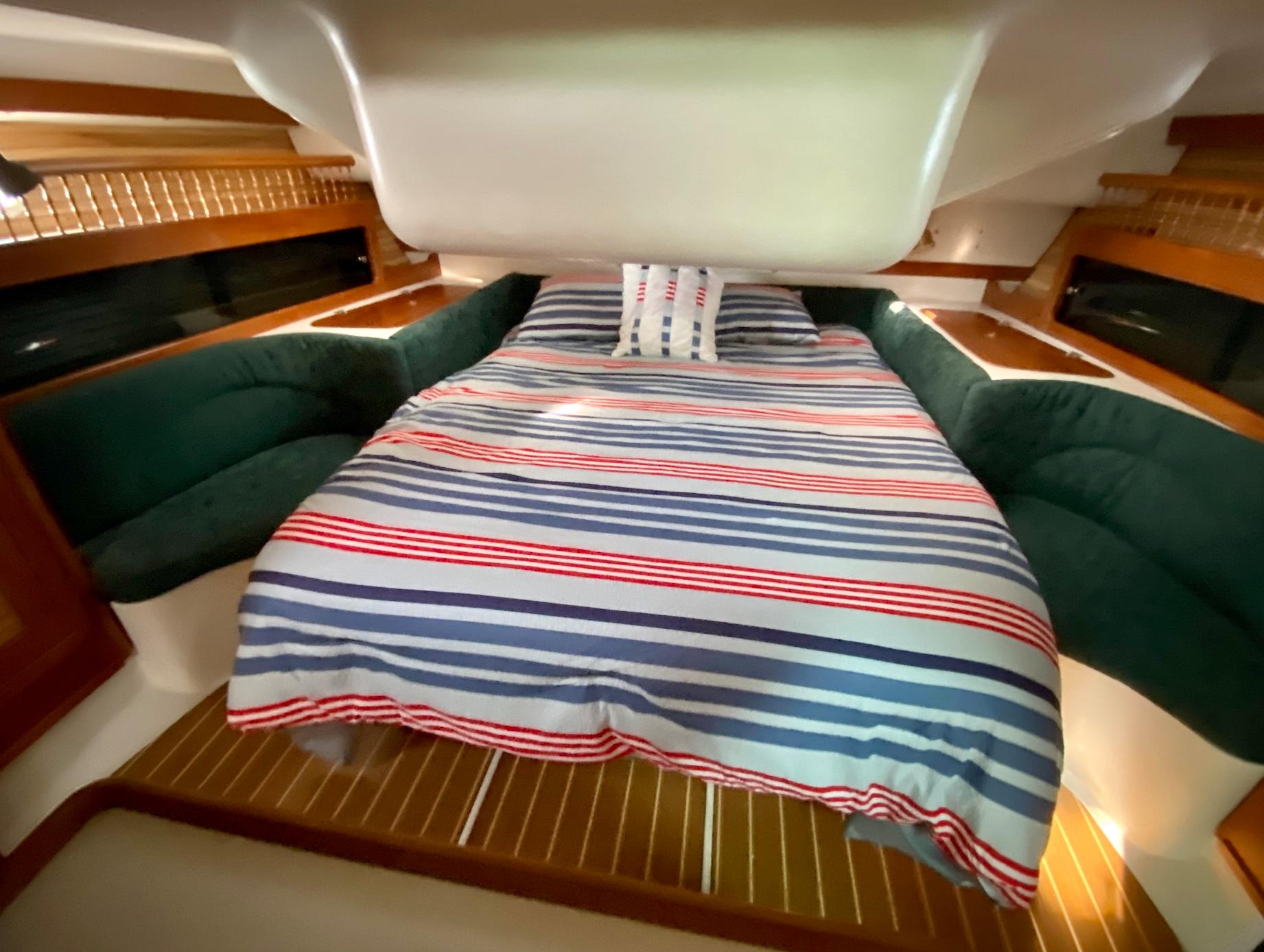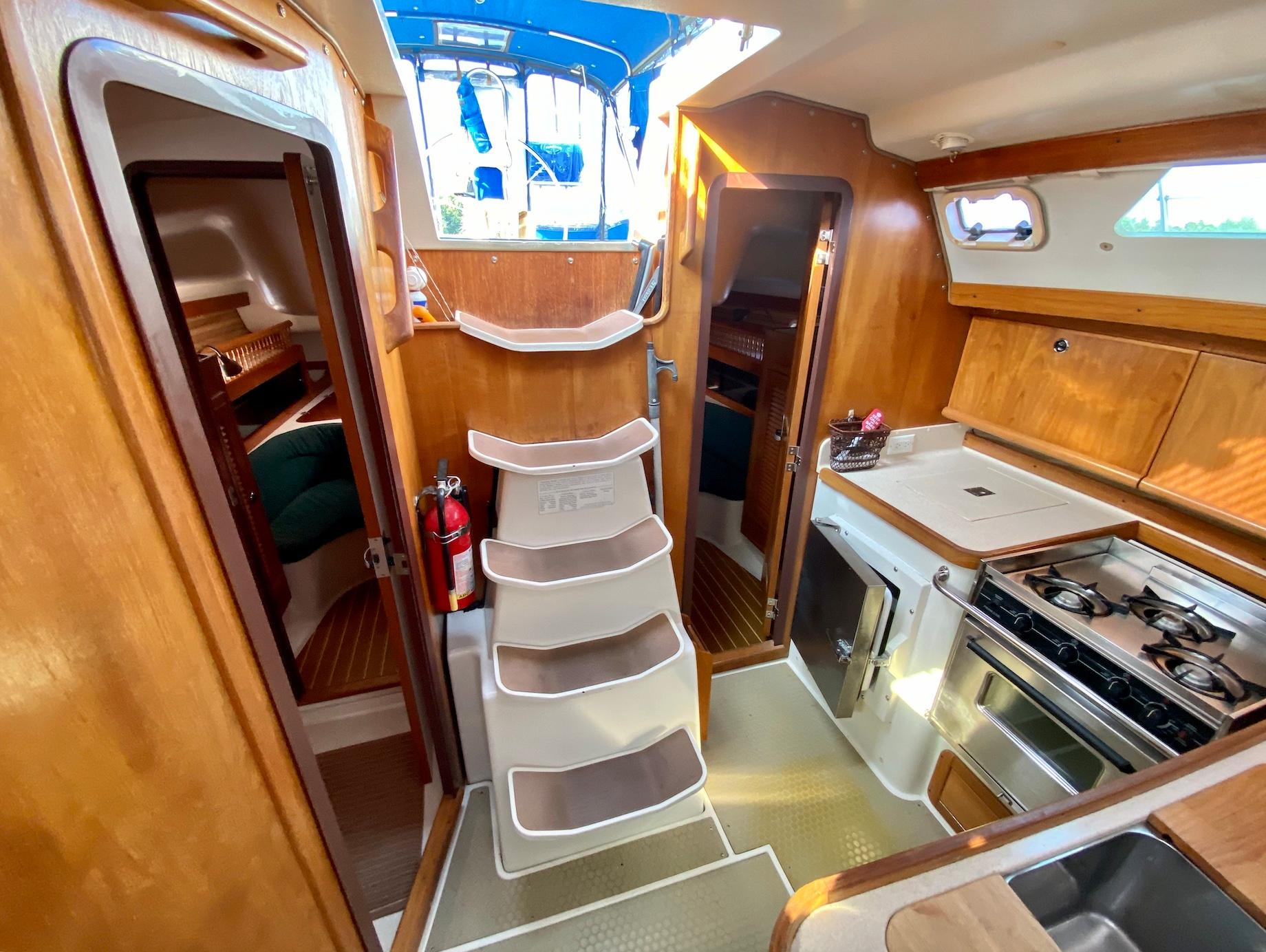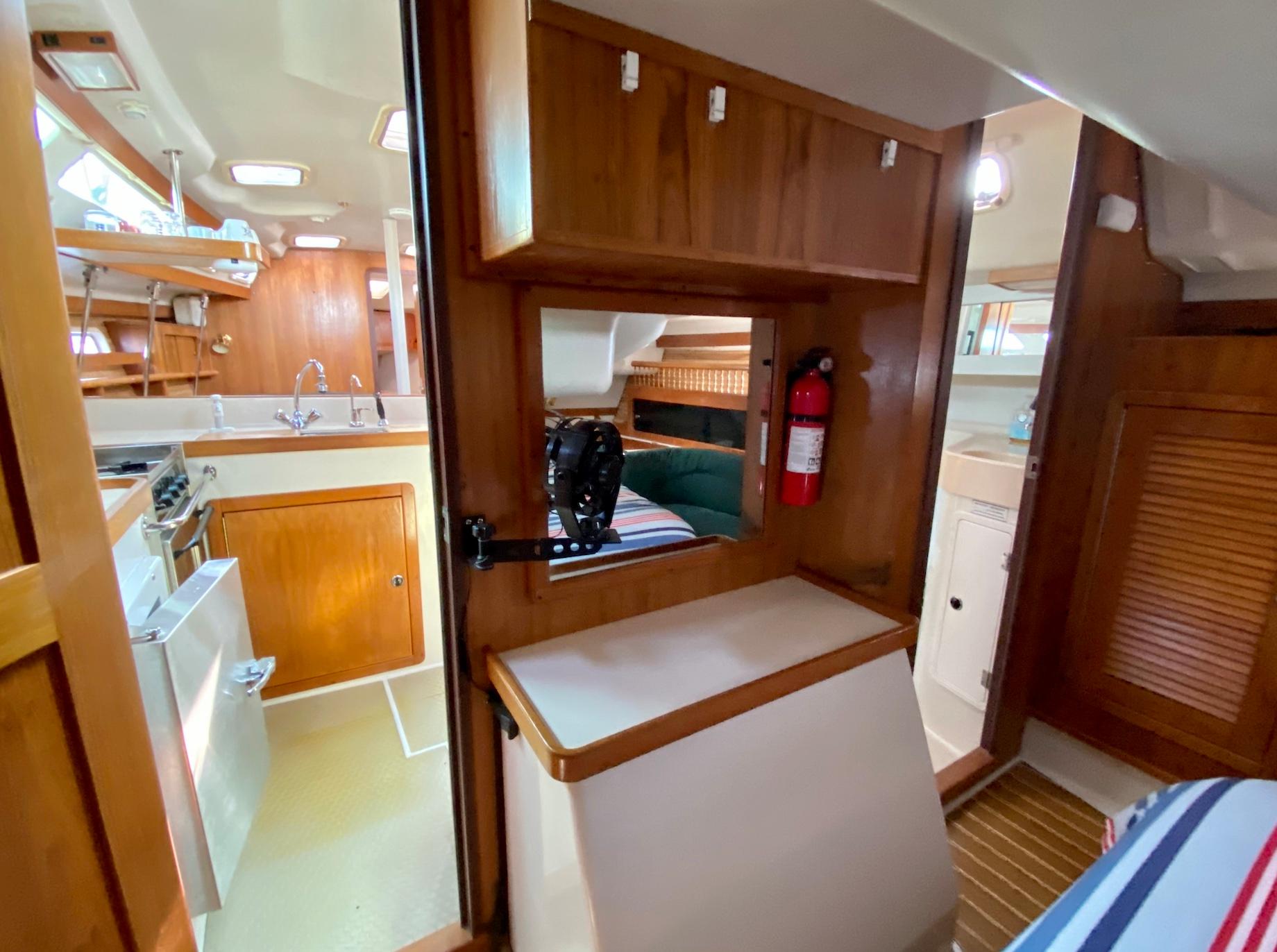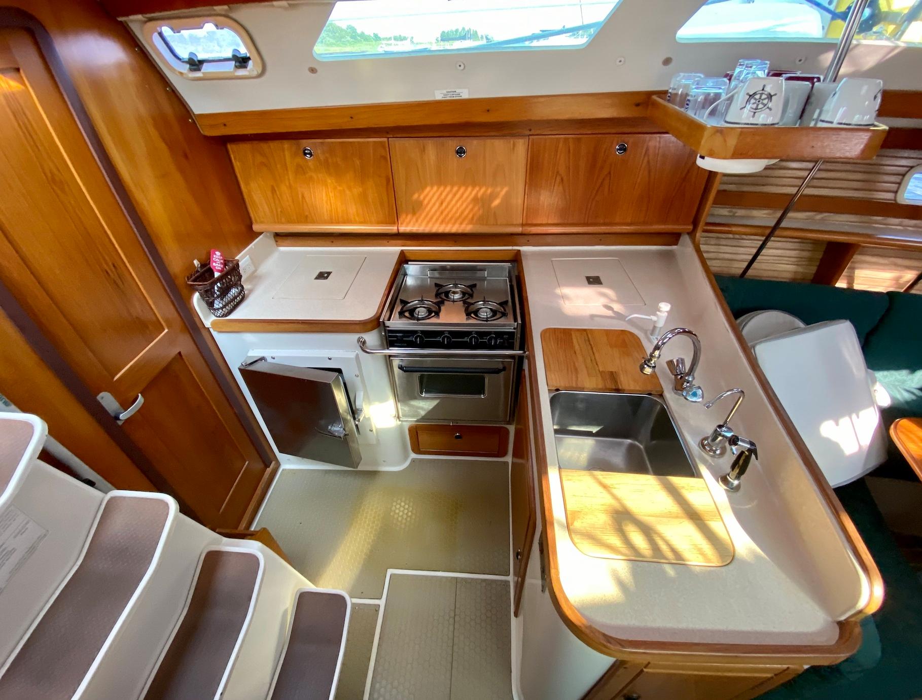 A full galley is to port, with a three burner oven and gas stove, double sink, hot and cold pressurized water, filtered drinking water, a 12v refrigerator, three storage cabinets, and an under-counter storage locker. The aft stateroom has a centerline queen-size berth, with hanging lockers, storage shelves, and lockers. The berth can be accessed from either the galley or the head. With roll-up side curtains, the bimini and a dodger can close in the cockpit fully and be used as a balmy day room.