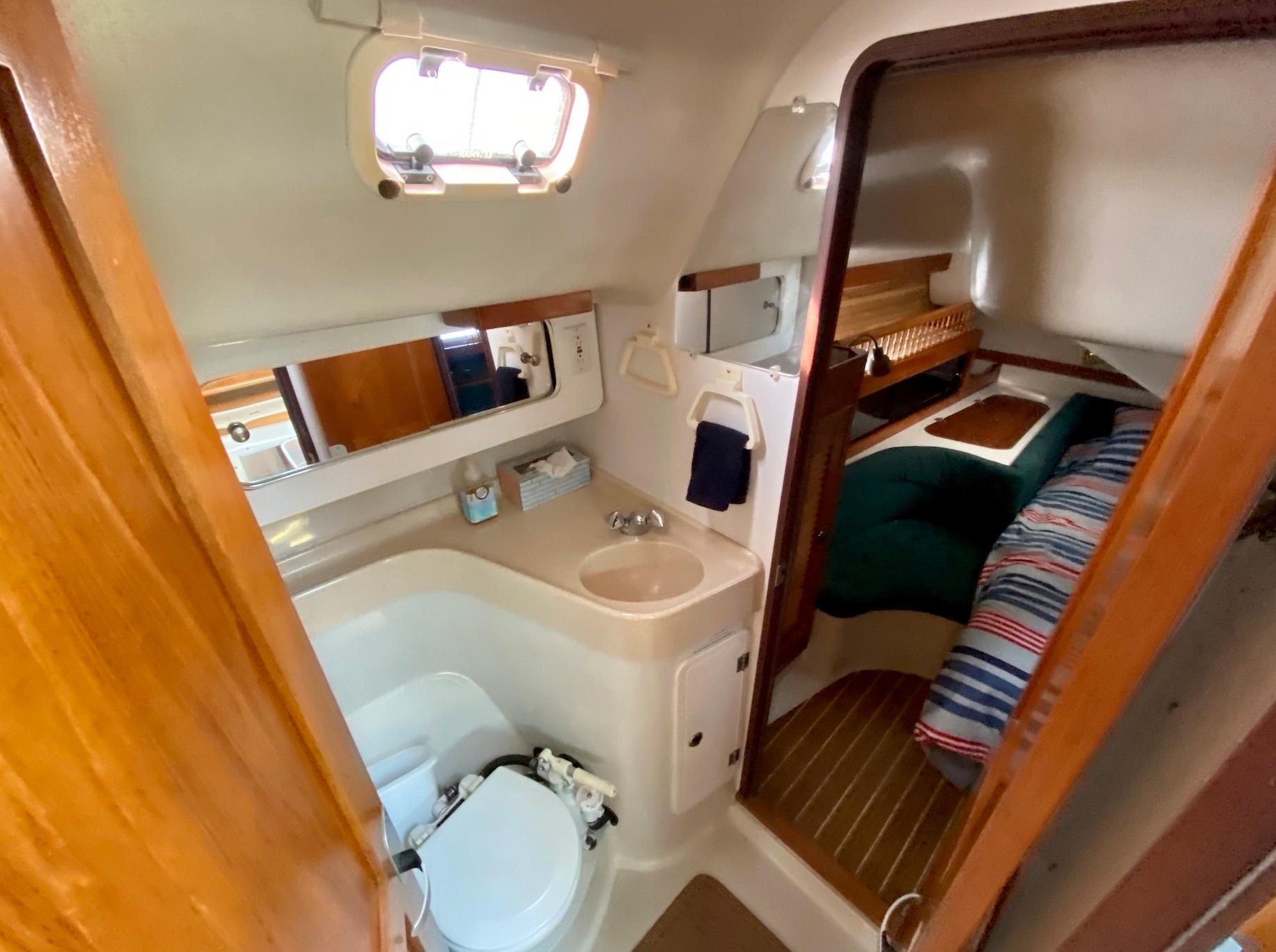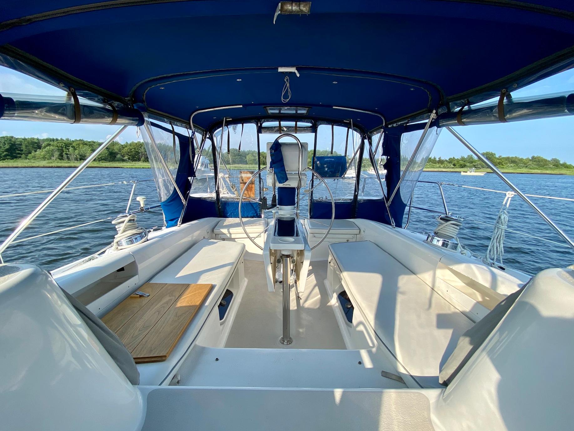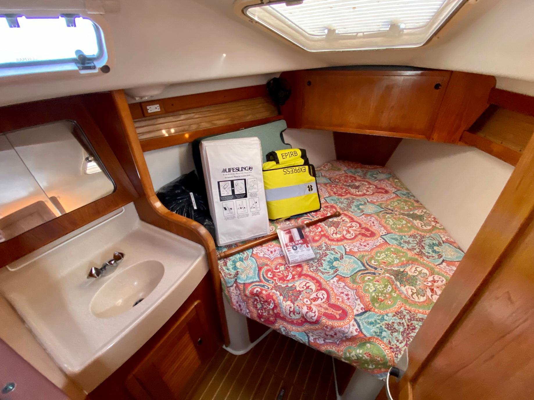 A full galley is to port, with a three burner oven and gas stove, double sink, hot and cold pressurized water, filtered drinking water, a 12v refrigerator, three storage cabinets, and an under-counter storage locker. The aft stateroom has a centerline queen-size berth, with hanging lockers, storage shelves, and lockers. The berth can be accessed from either the galley or the head. With roll-up side curtains, the bimini and a dodger can close in the cockpit fully and be used as a balmy day room.