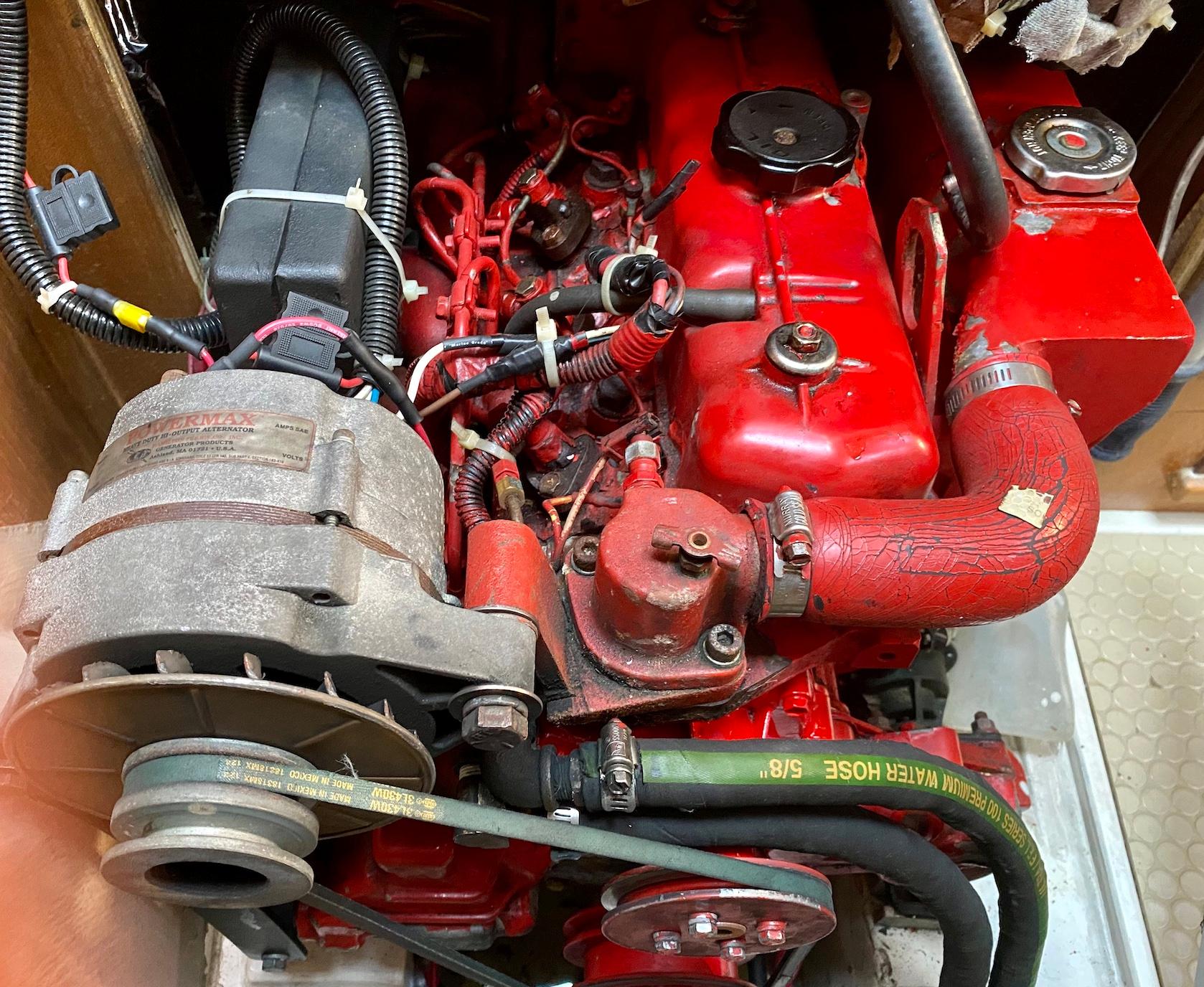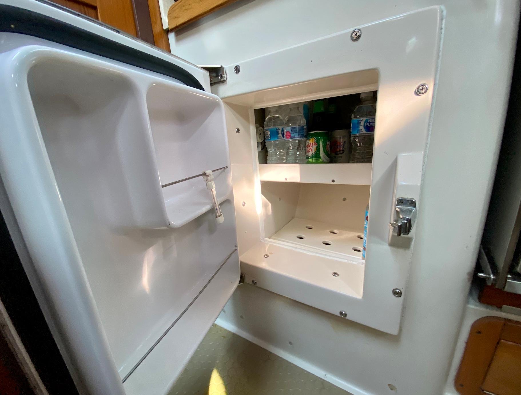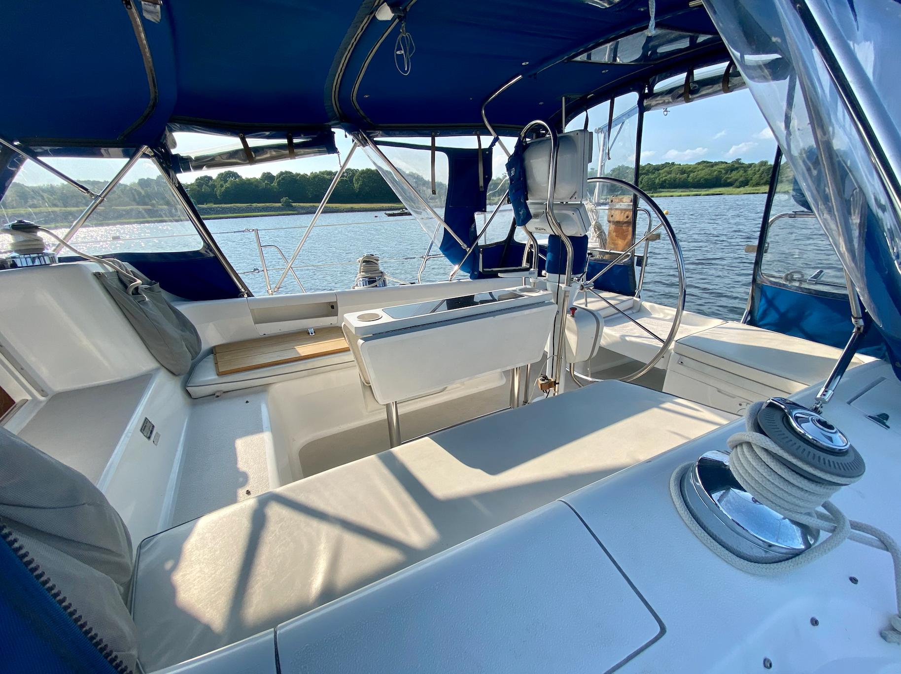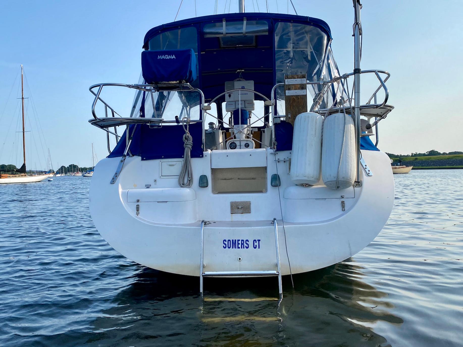 A full galley is to port, with a three burner oven and gas stove, double sink, hot and cold pressurized water, filtered drinking water, a 12v refrigerator, three storage cabinets, and an under-counter storage locker. The aft stateroom has a centerline queen-size berth, with hanging lockers, storage shelves, and lockers. The berth can be accessed from either the galley or the head. With roll-up side curtains, the bimini and a dodger can close in the cockpit fully and be used as a balmy day room.