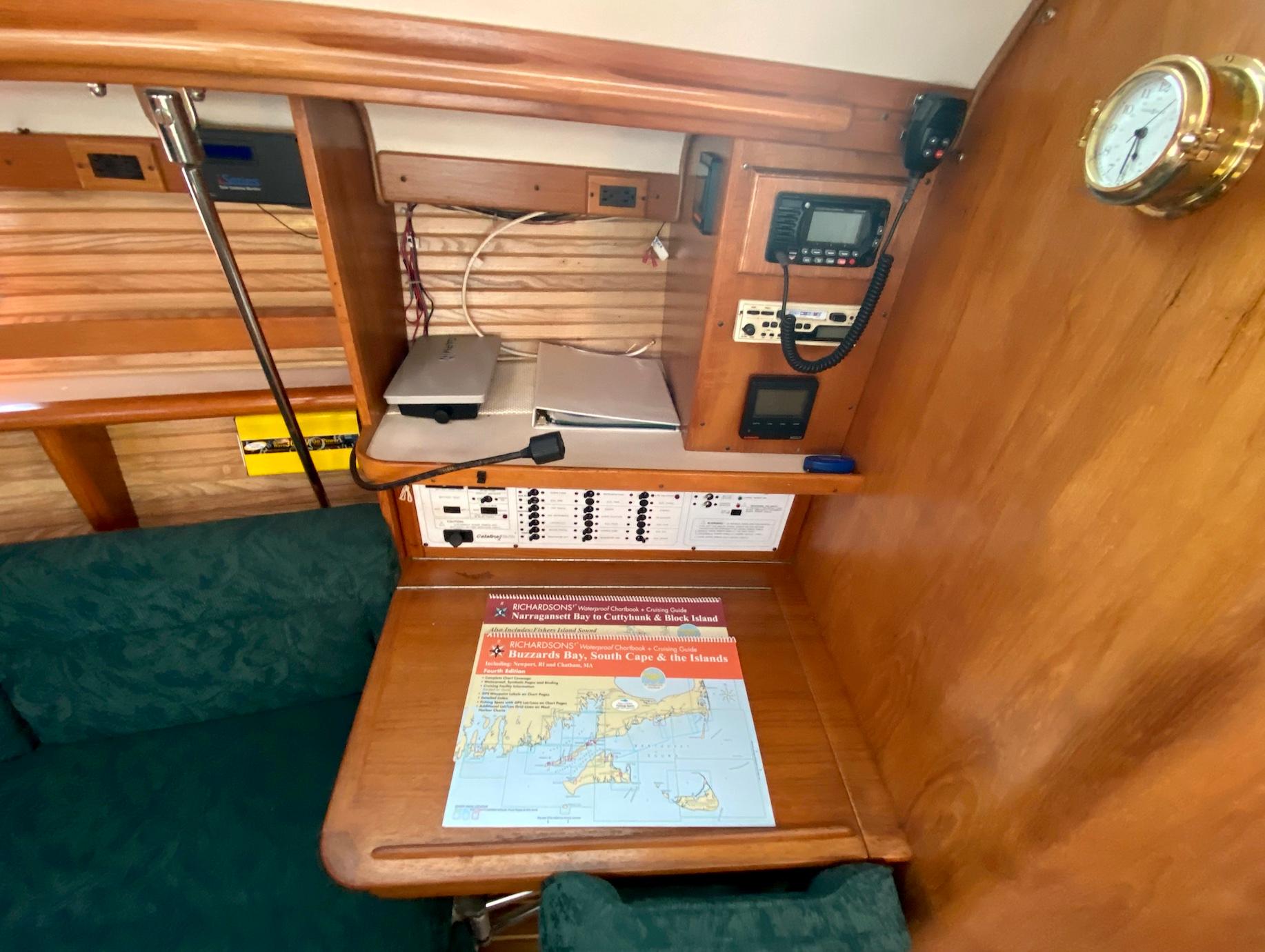 The forward cabin has a v-berth which sleeps two. A hanging locker to starboard with a storage cabinet on the bow section. A wash-up sink and vanity are to port. A large hatch also ventilation and light. The main salon has a u-shaped dinette with a dropping dinette table, which converts to a double berth. A settee is located on the starboard side with a chart table aft of the settee. The chart table has a swivel chair that swings under the table. Storage and shelves are located on both sides of the dinette and underneath the seating.