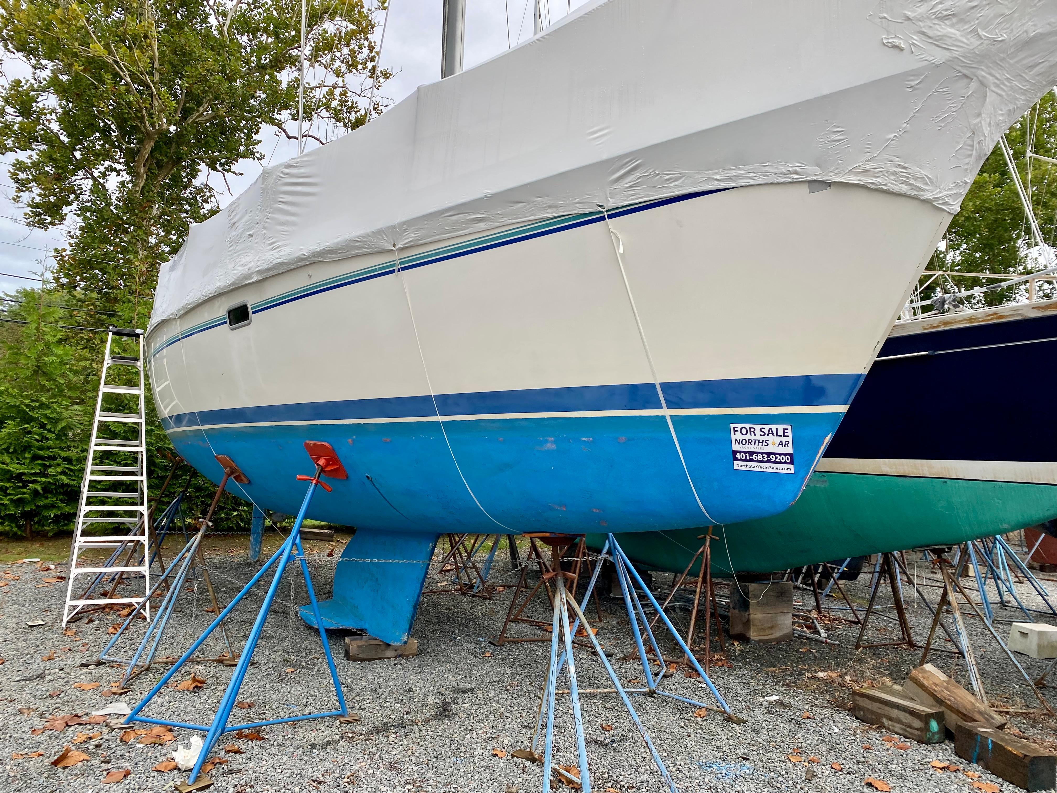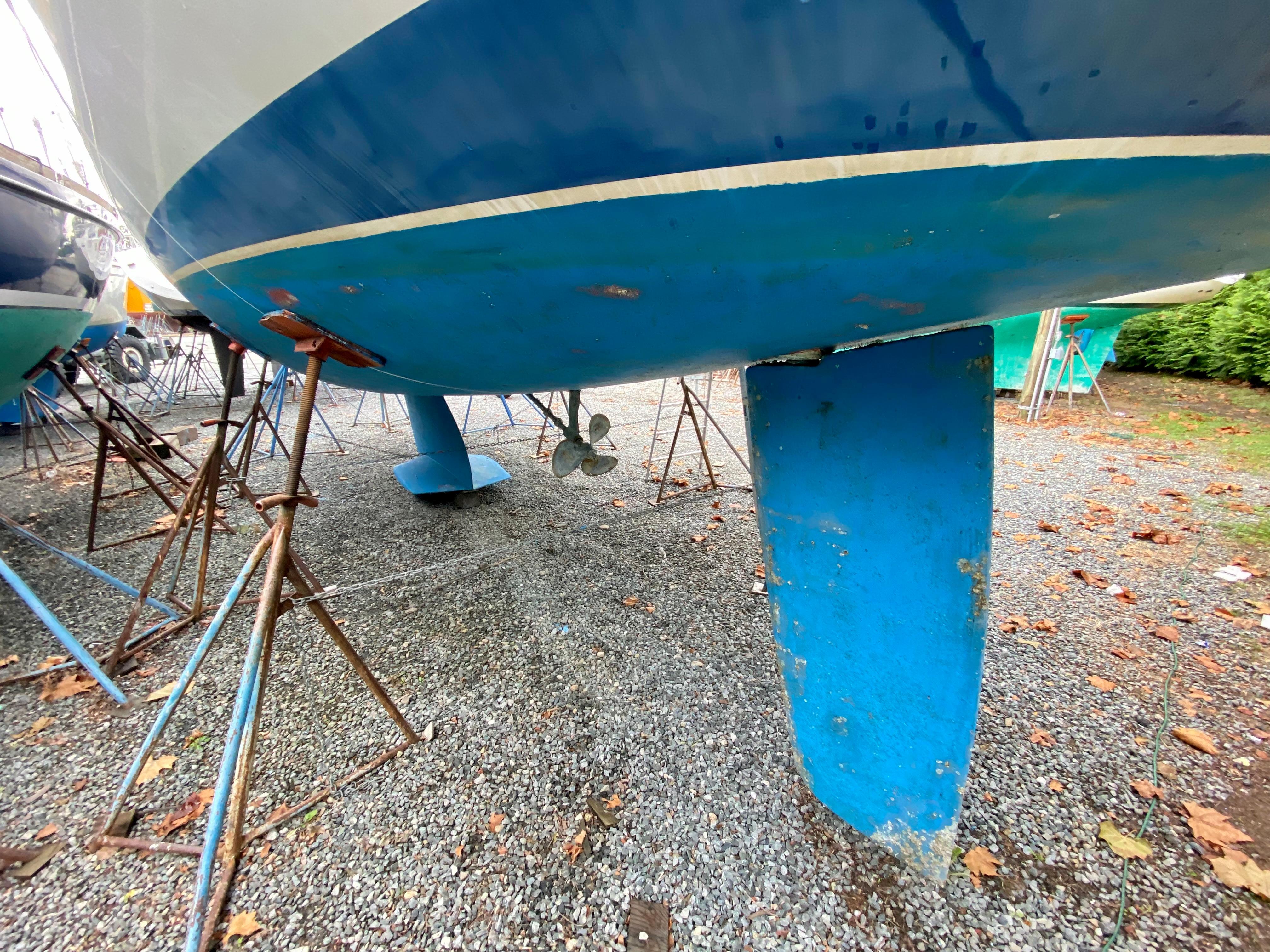 Hull is machine-cored and fiberglass laminate. Fiberglass grid with bonded bulkheads. The deck is cored with solid FRP in high-load areas, white Gelcoat with grey non-skid areas. Wing keel with lead ballast. The rudder is a spade with fiberglass stock.