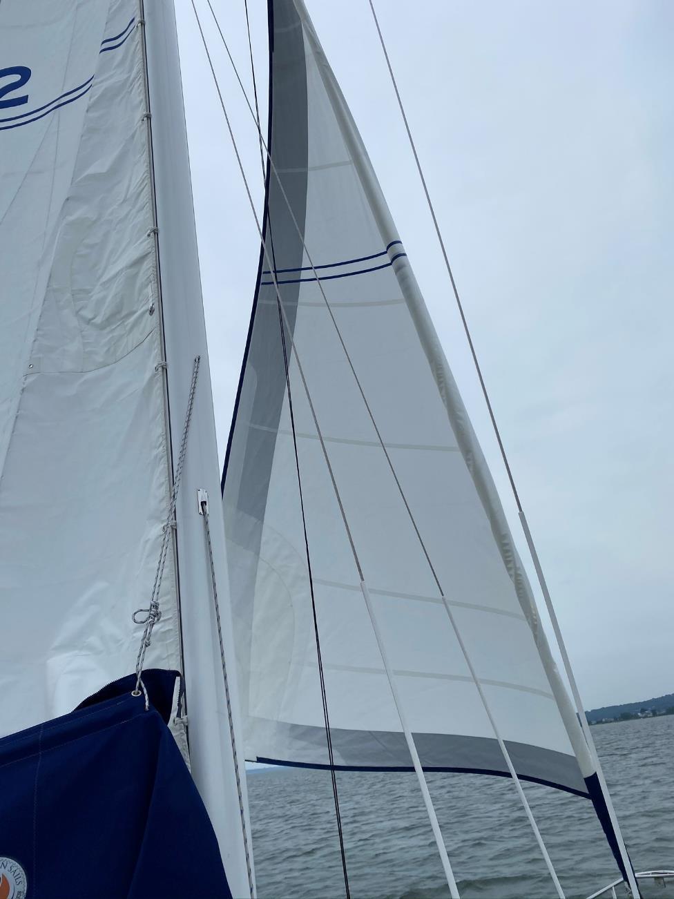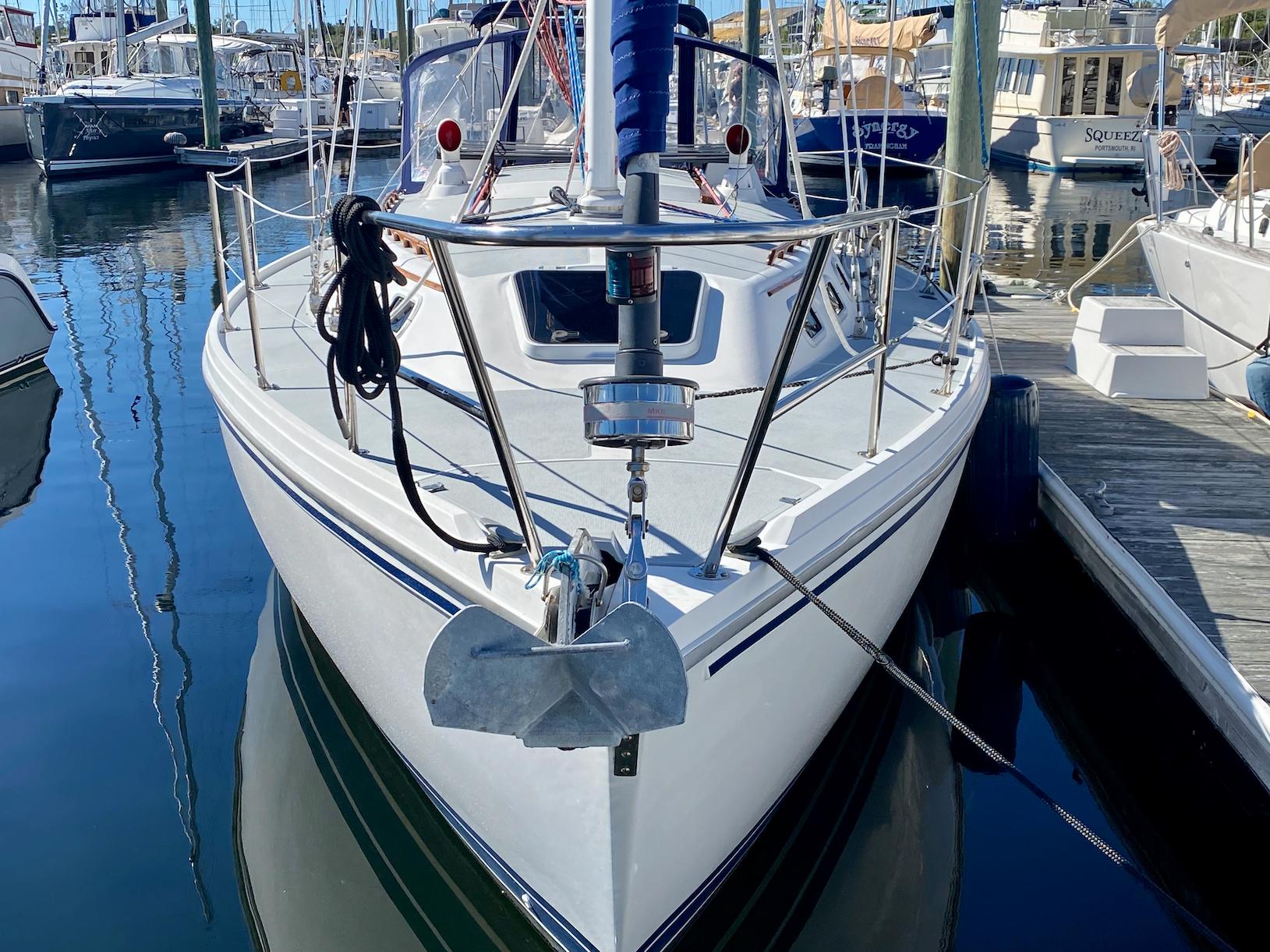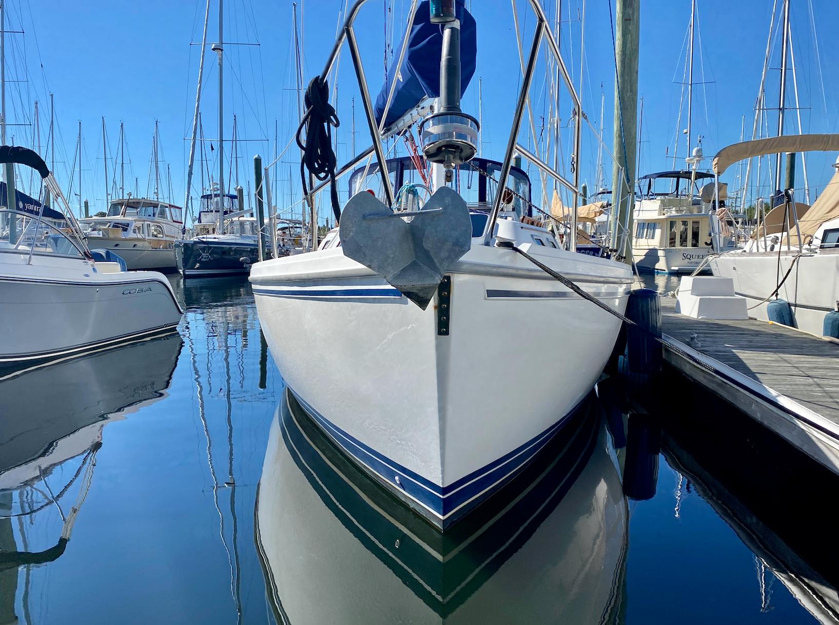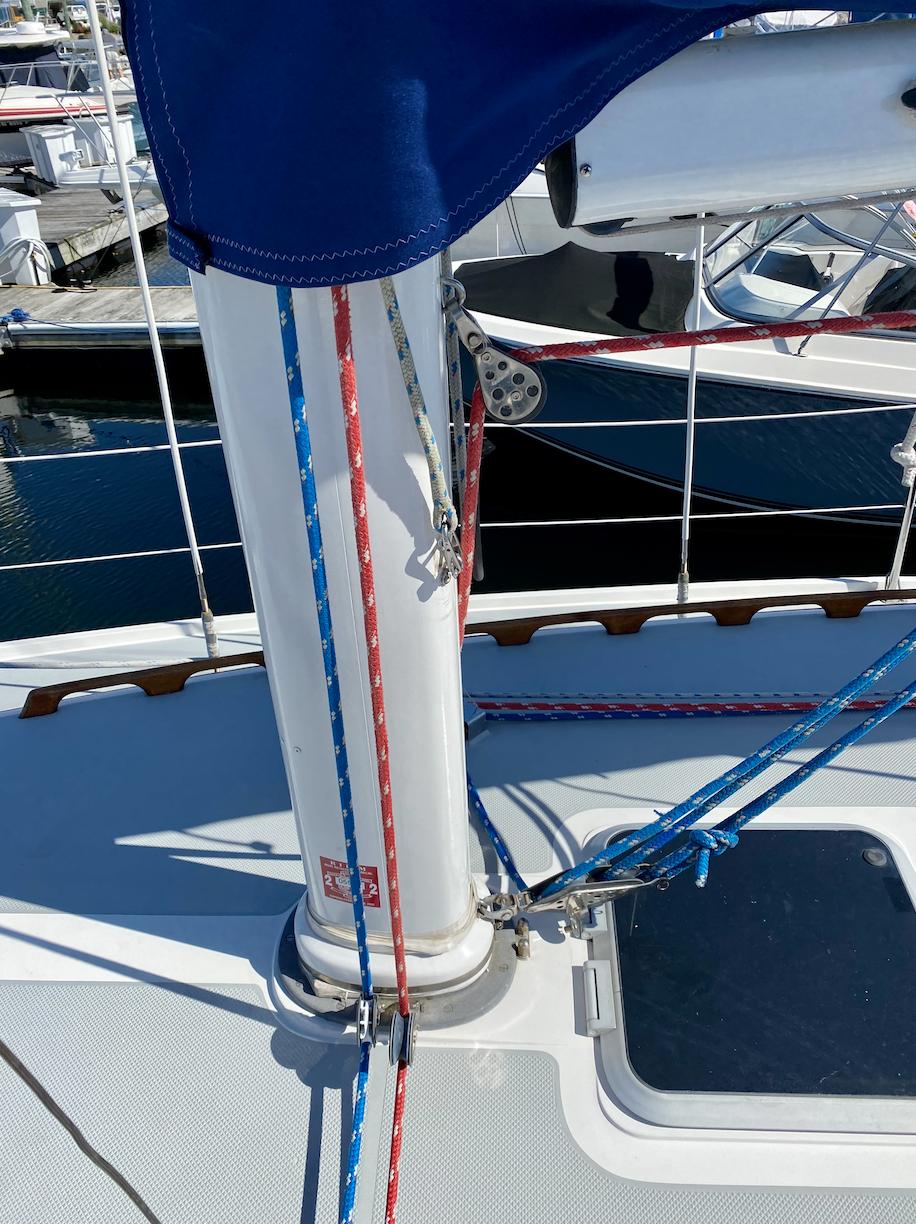 - Charleston spars anodized aluminum double spreading mast- keel-stepped (Mast stepped & painted white w/ Interlux Perfection, sheaves replaced, new spreader boots, refurbished anemometer, new steaming/ deck light- LED, 2019)