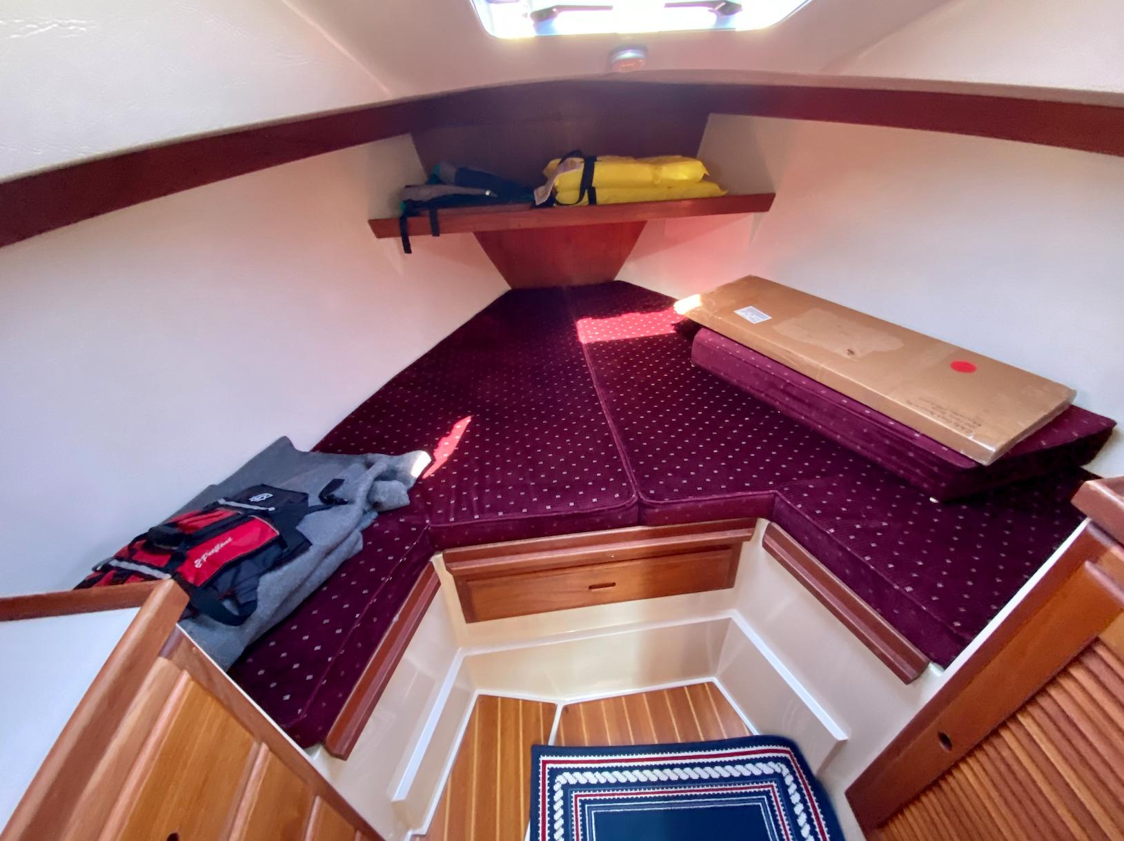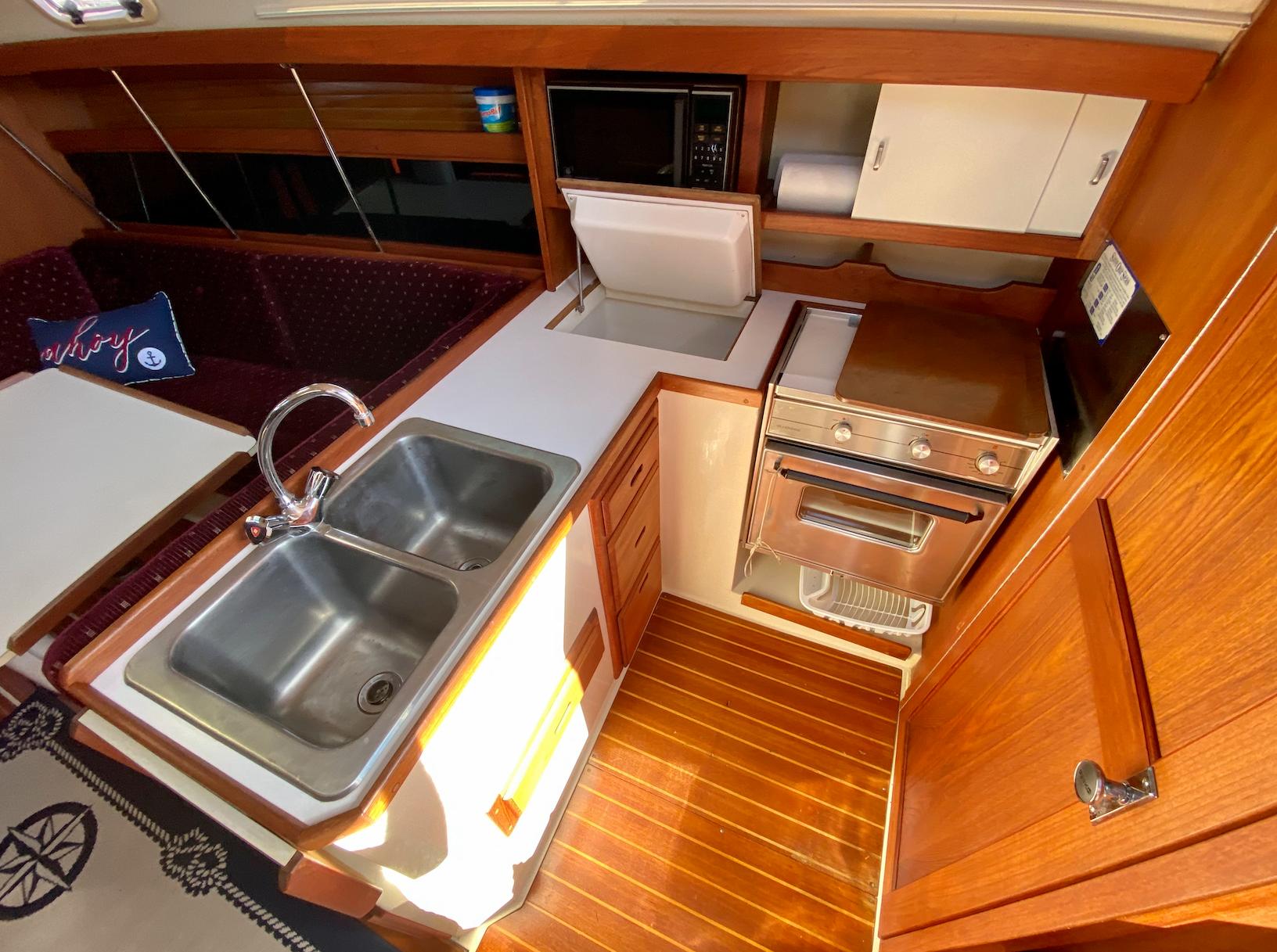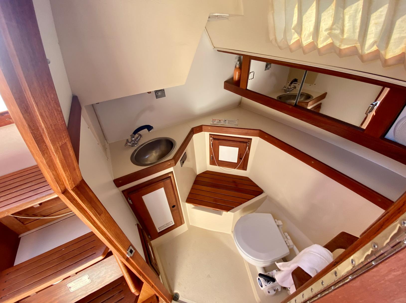 There is a fully enclosed head with a shower. Across from the head, you will find a substantial l-shaped galley with ample storage. A full-sized enclosed aft cabin and hanging locker. The forward v-berth has many drawers and a large hanging locker.