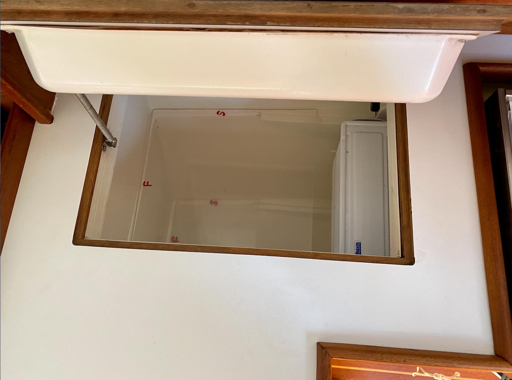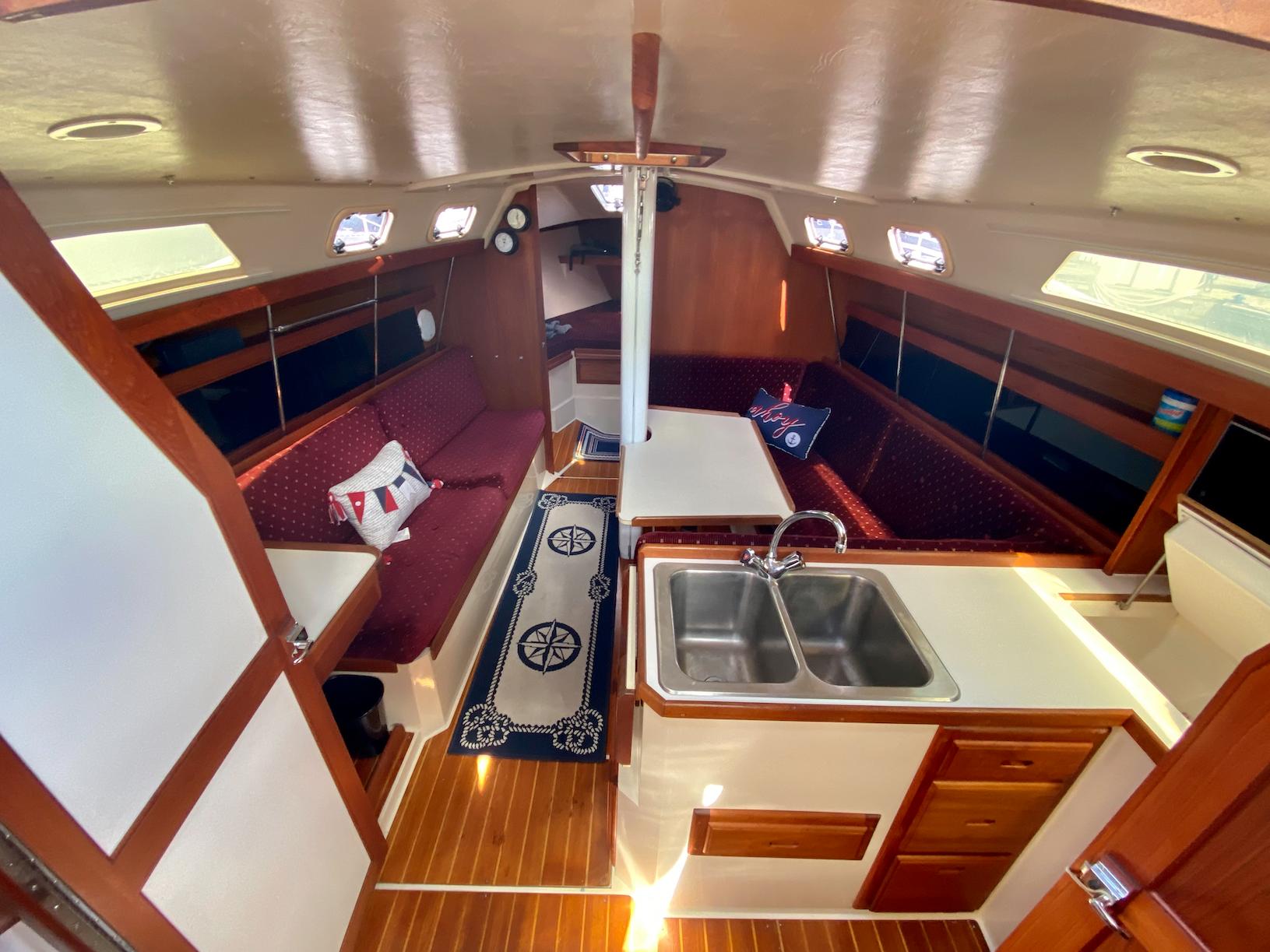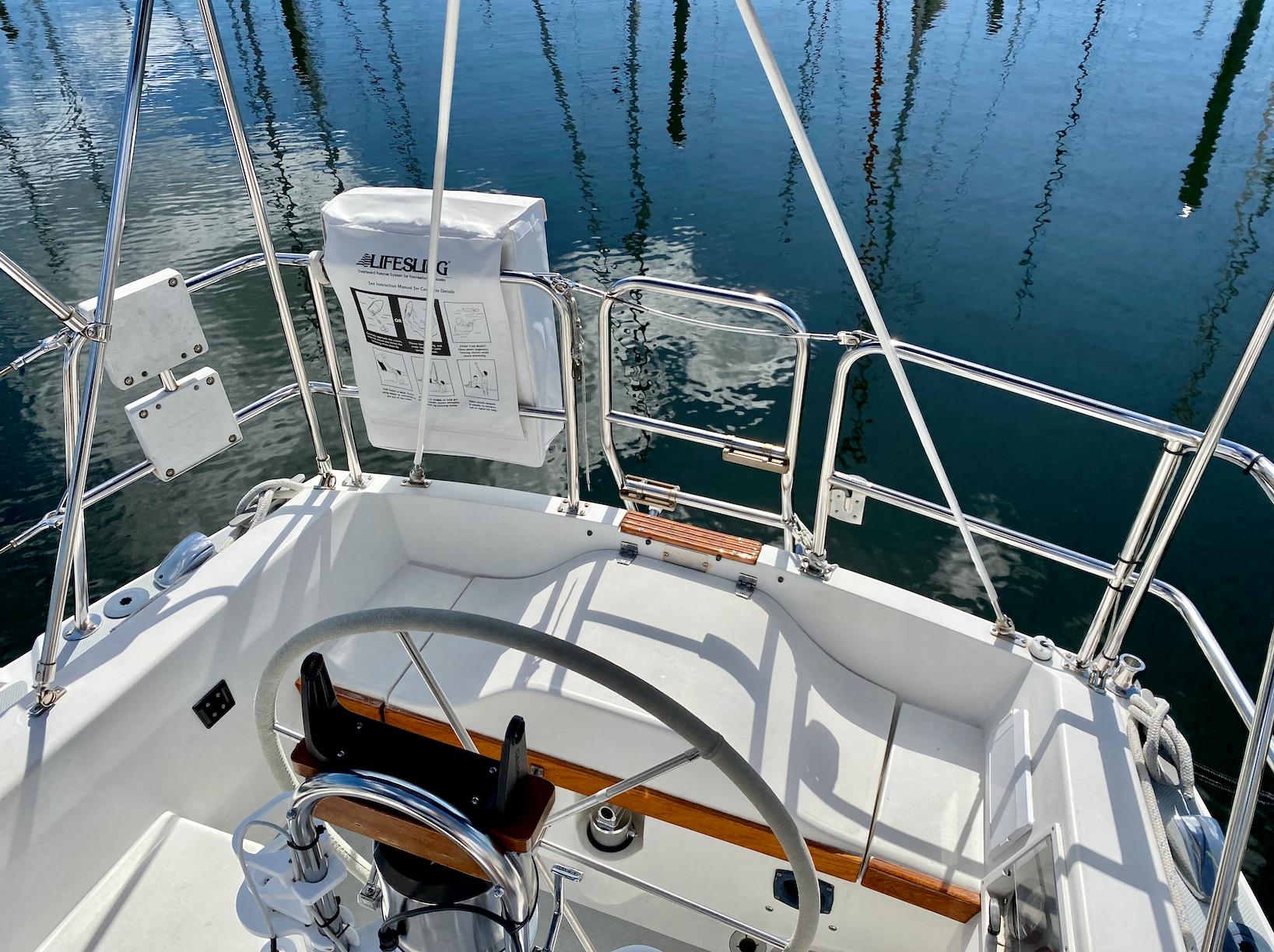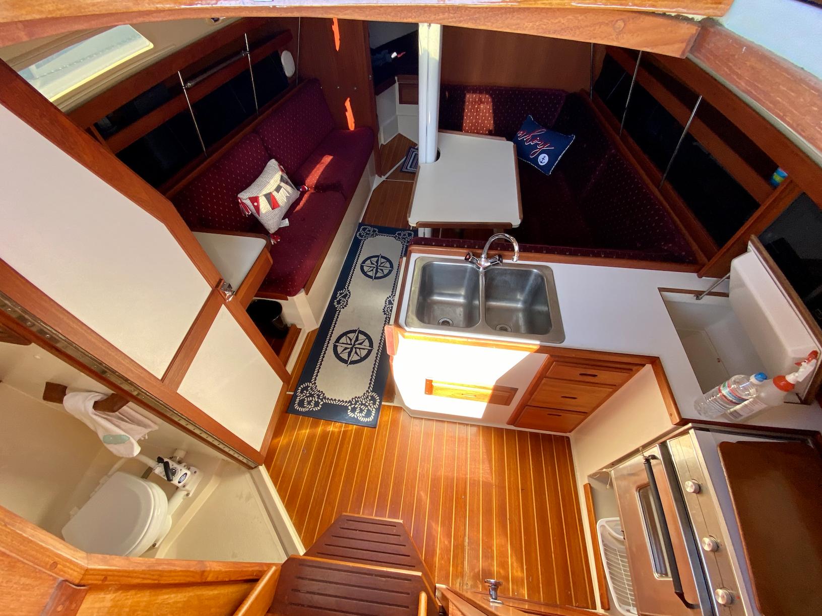 There is a fully enclosed head with a shower. Across from the head, you will find a substantial l-shaped galley with ample storage. A full-sized enclosed aft cabin and hanging locker. The forward v-berth has many drawers and a large hanging locker.