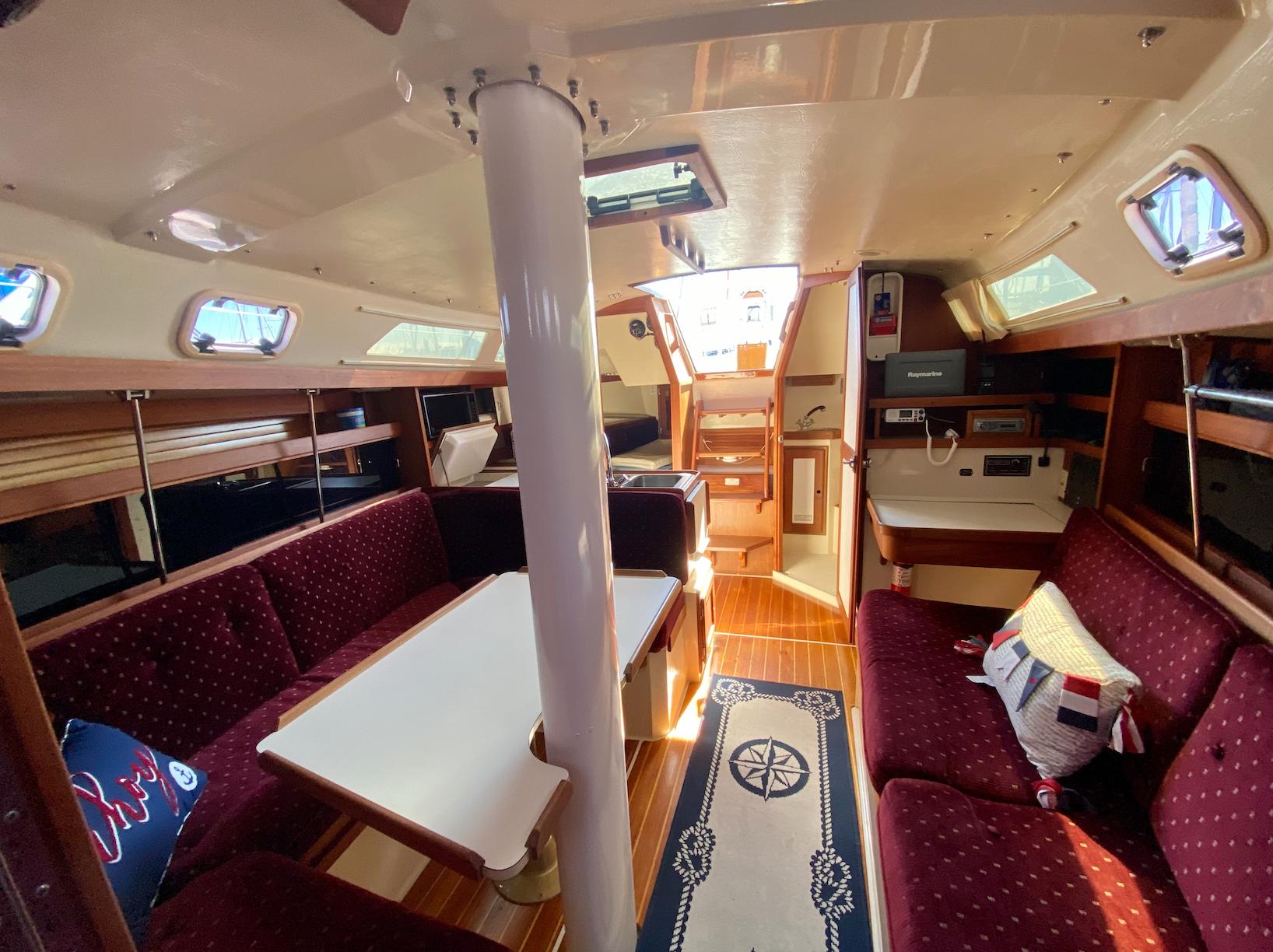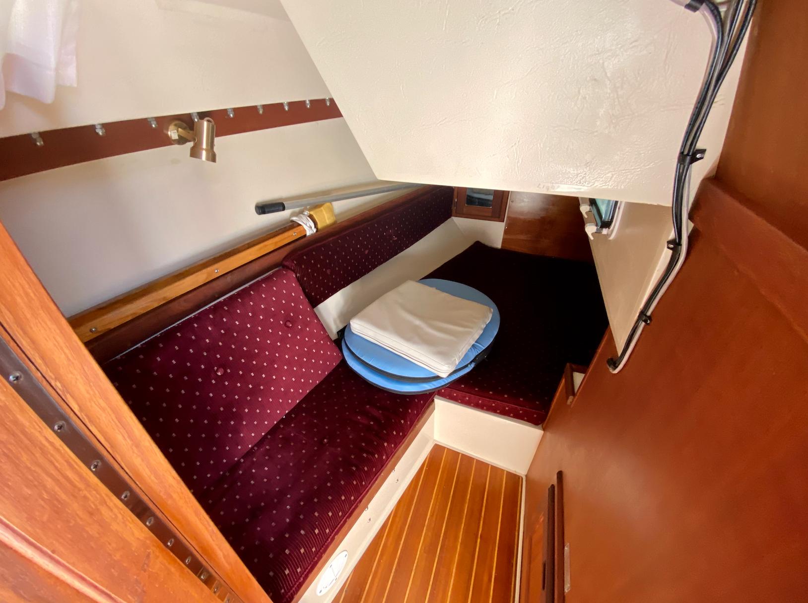 Two-cabin layout with berths for seven. As you enter the main salon you find a large dinette on the starboard side that converts to a double berth. On the portside, there is a long settee that converts to a single berth. Aft of the settee is the chart table and good size hanging locker.